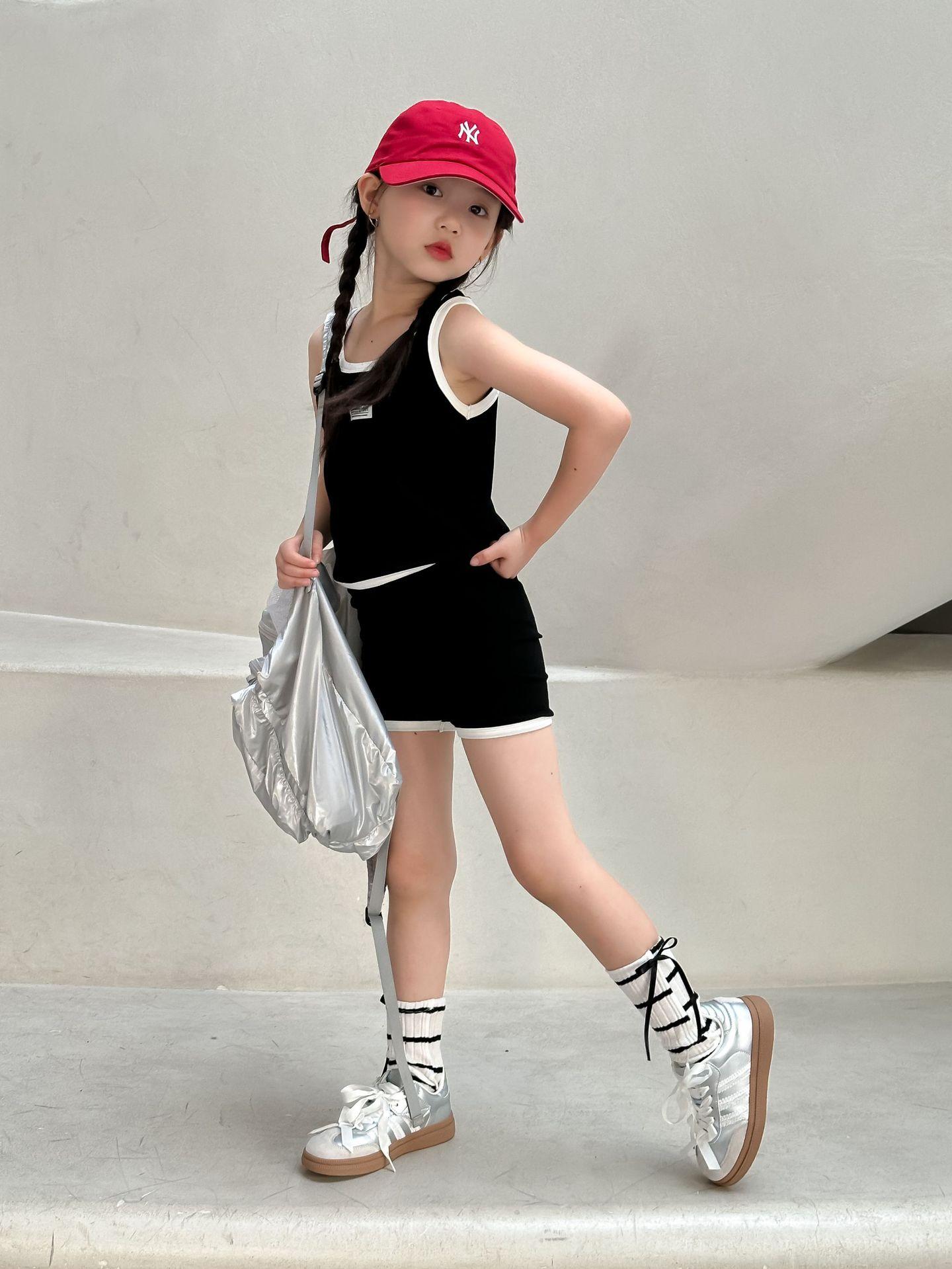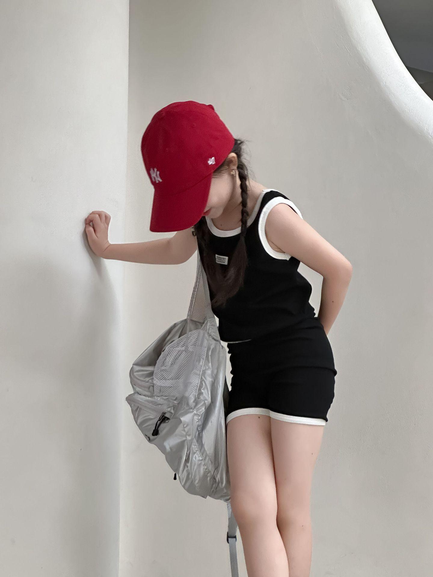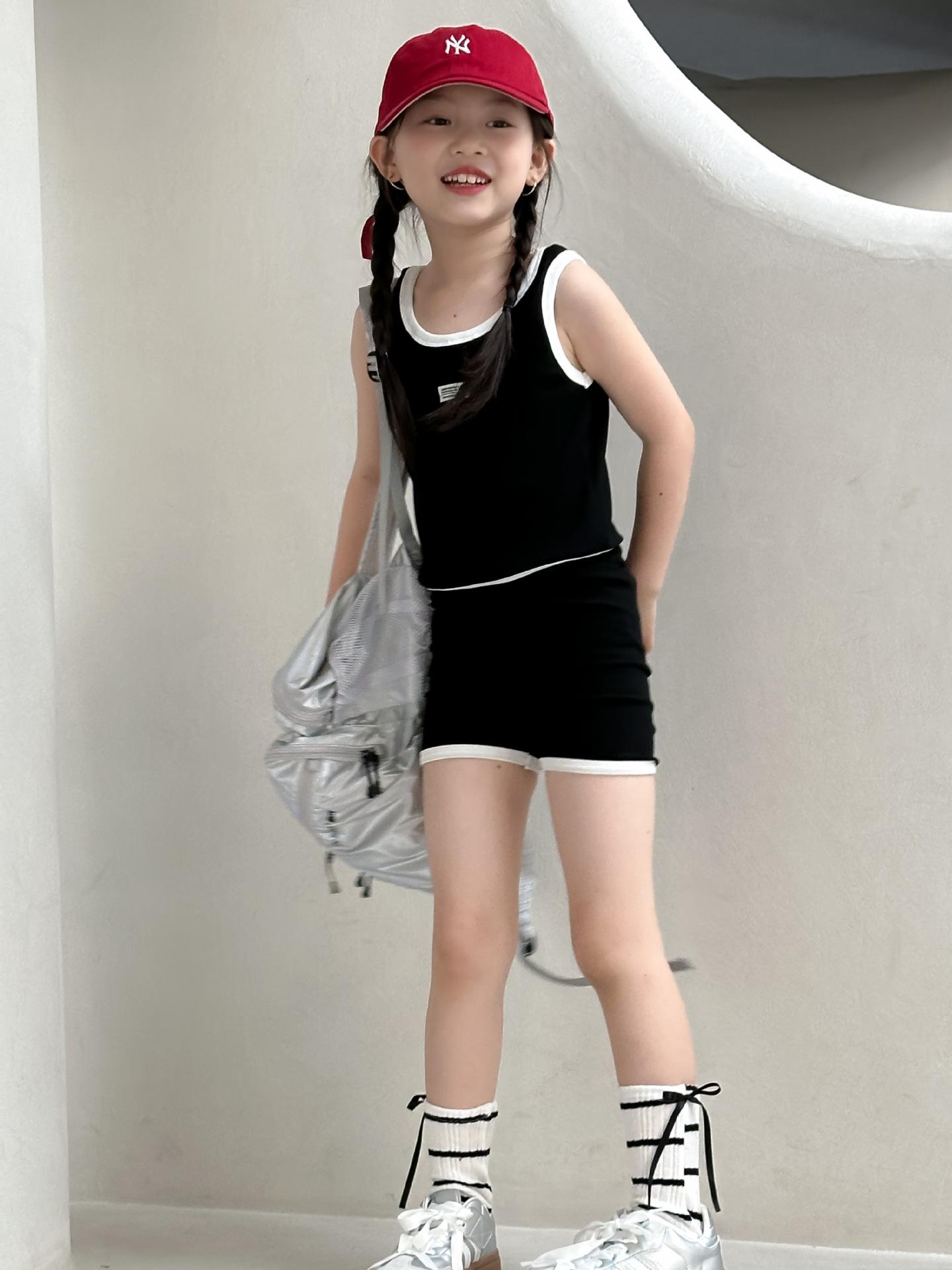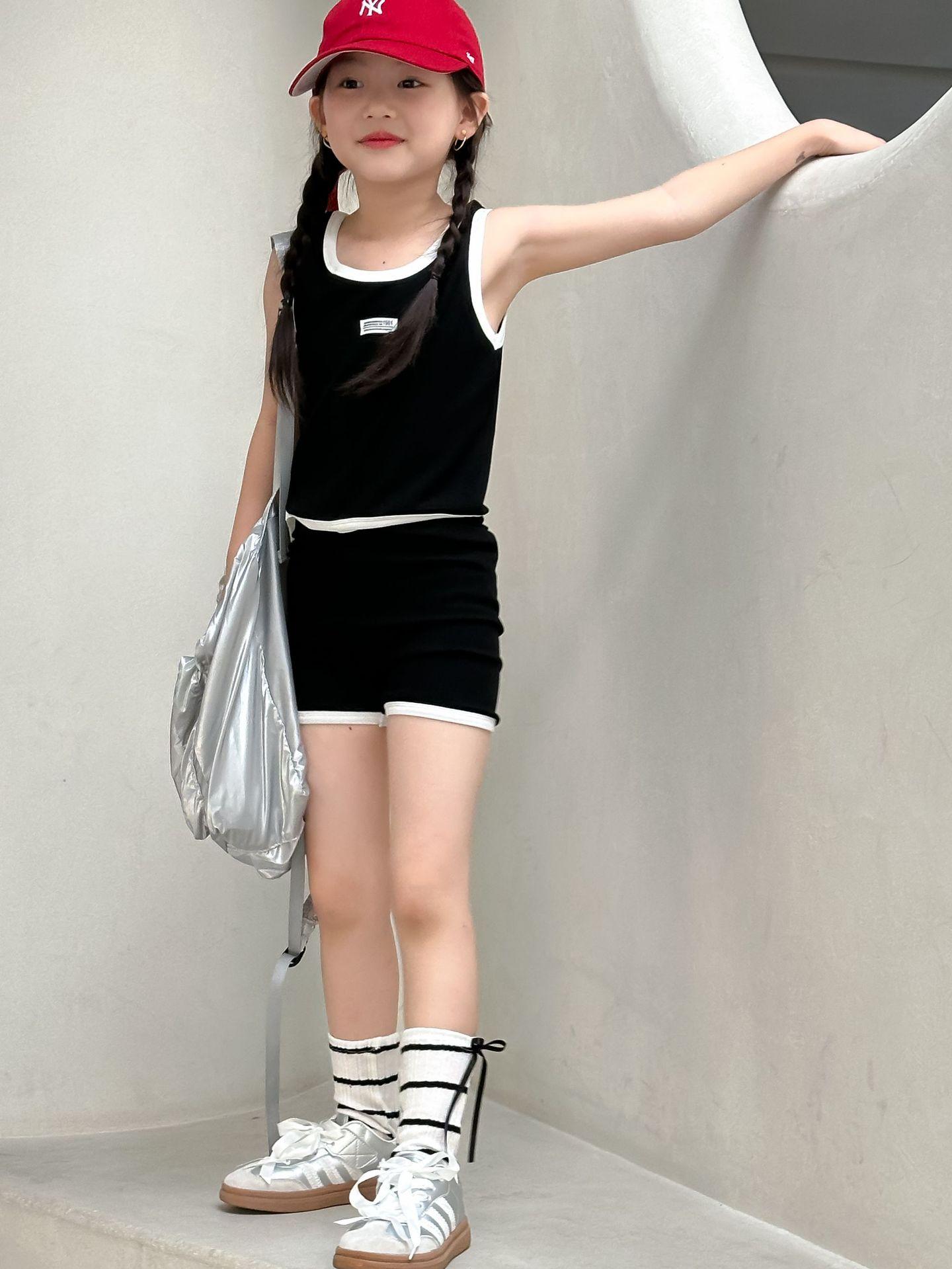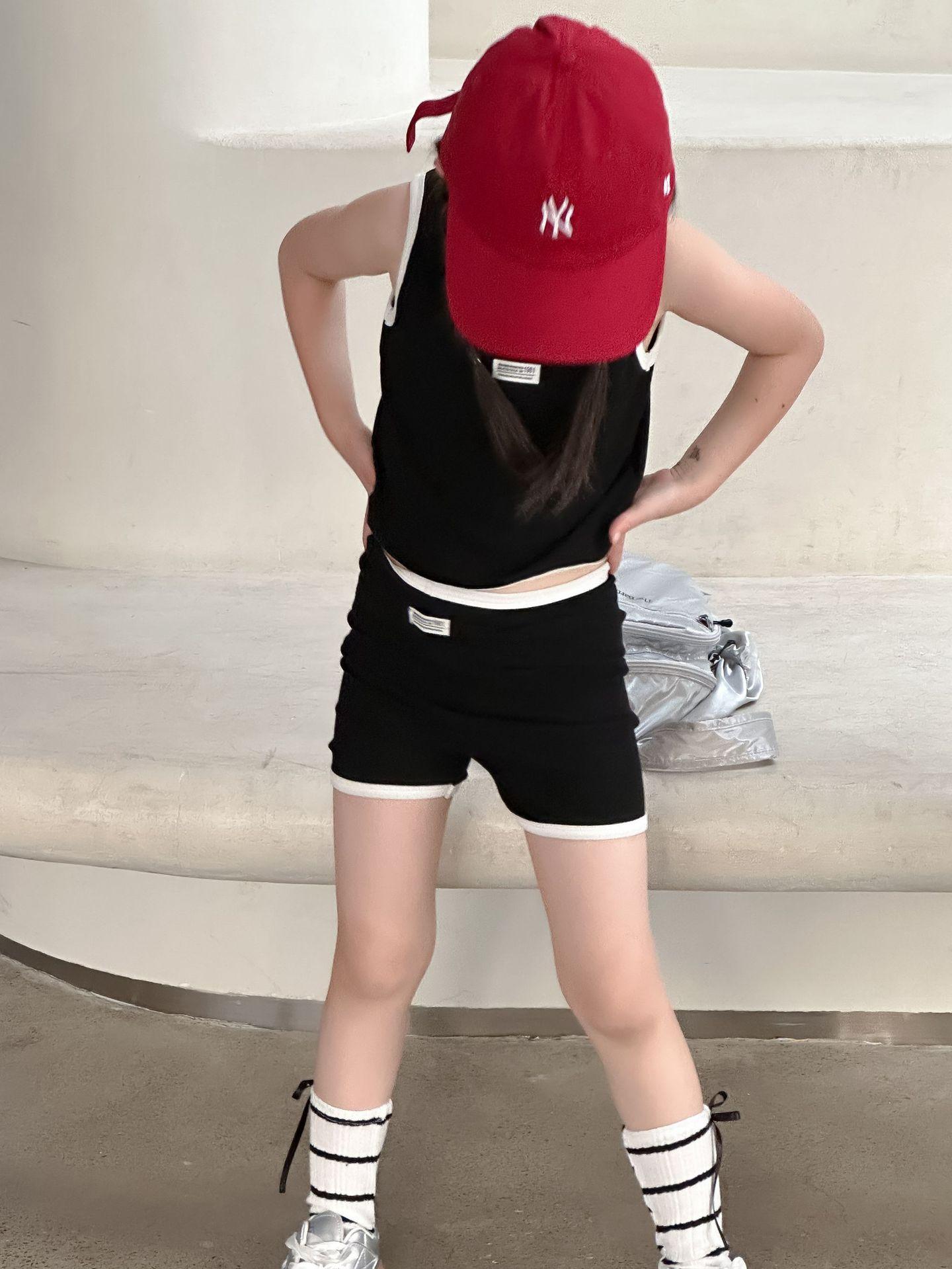 Verano 2025 Chaleco de Punto Americano Elástico para Niña, Traje de Shorts Ajustados con Bloque de Color, Conjunto Deportivo Casual de Dos Piezas para Mujer