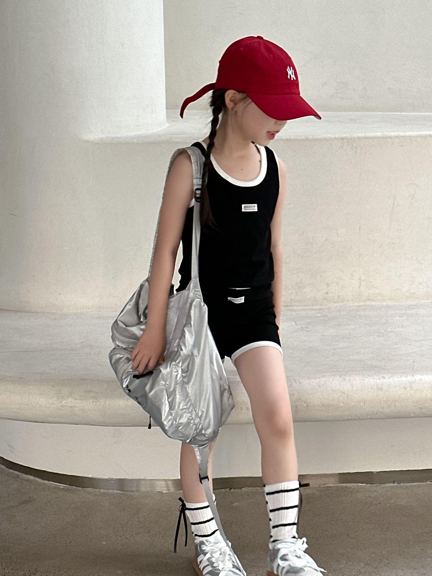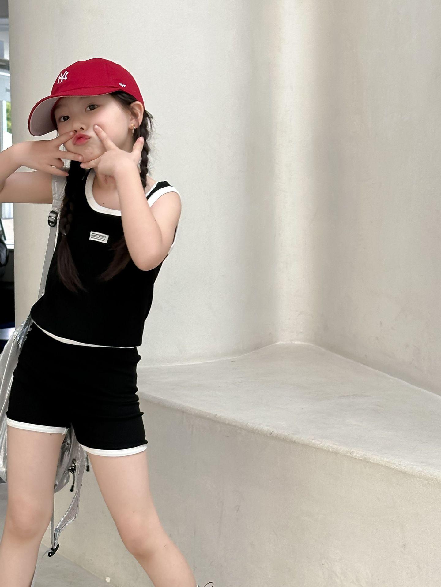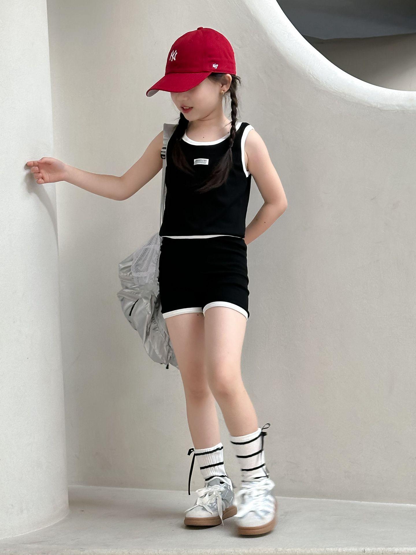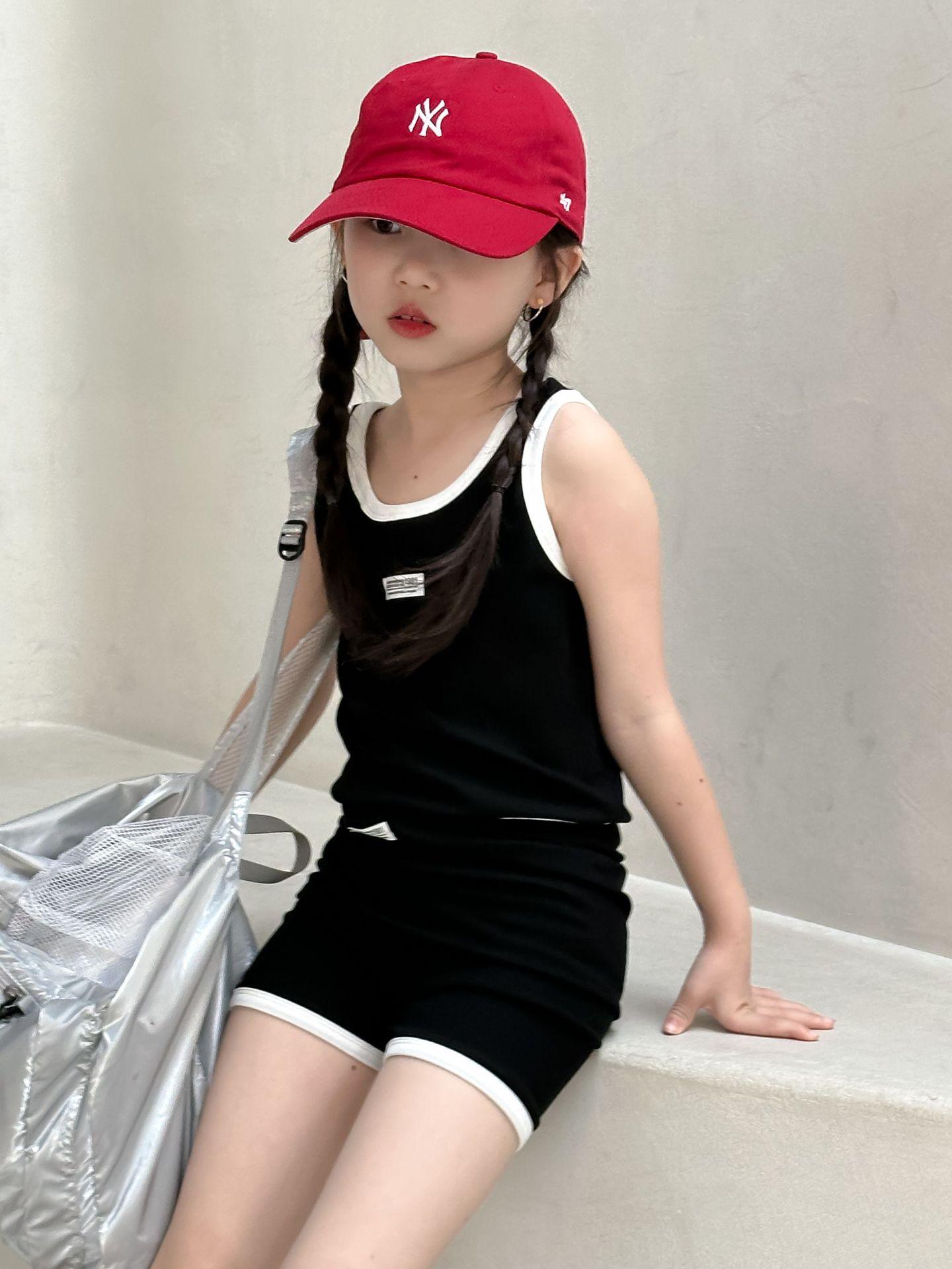Verano 2025 Chaleco de Punto Americano Elástico para Niña, Traje de Shorts Ajustados con Bloque de Color, Conjunto Deportivo Casual de Dos Piezas para Mujer
