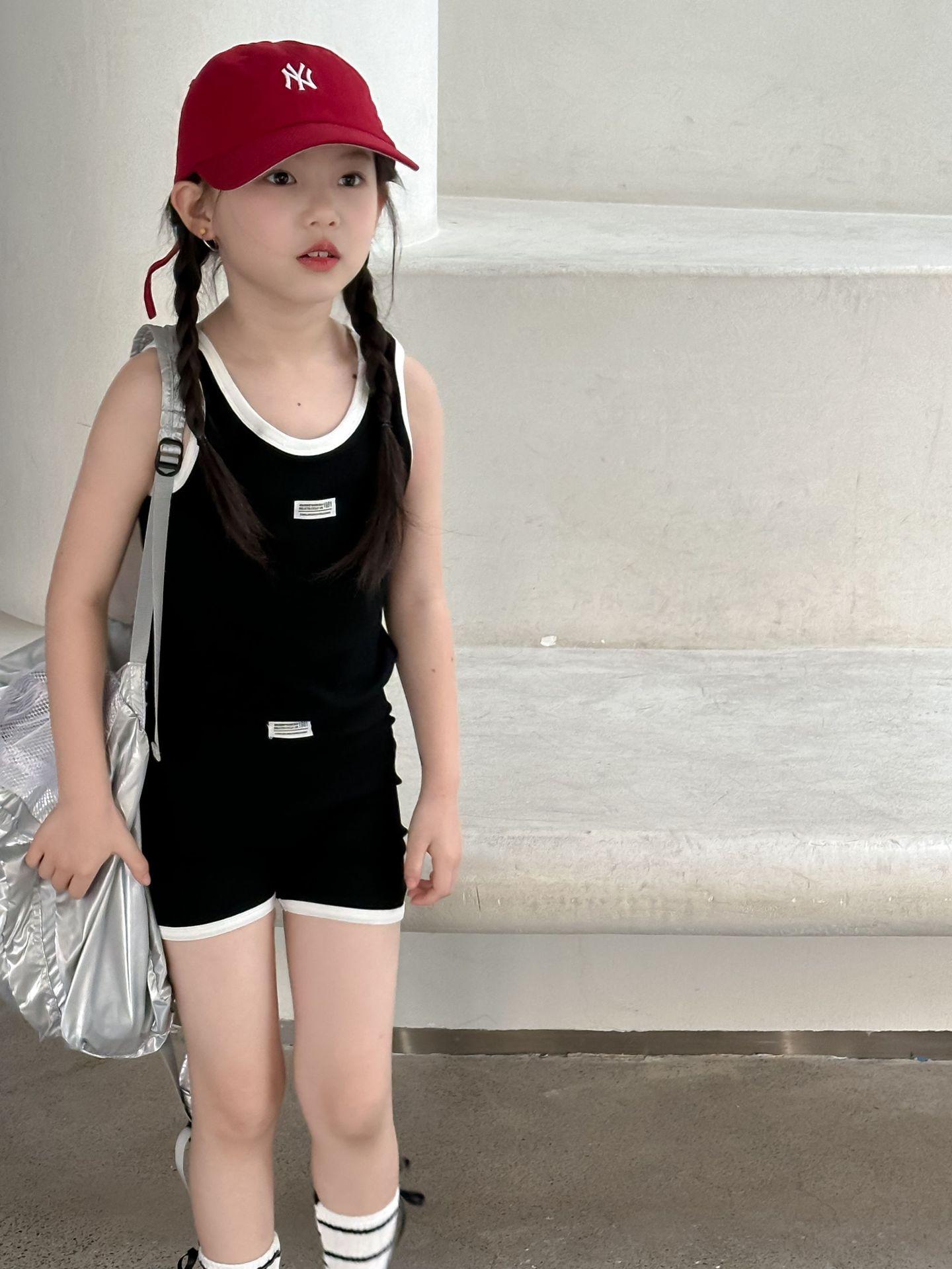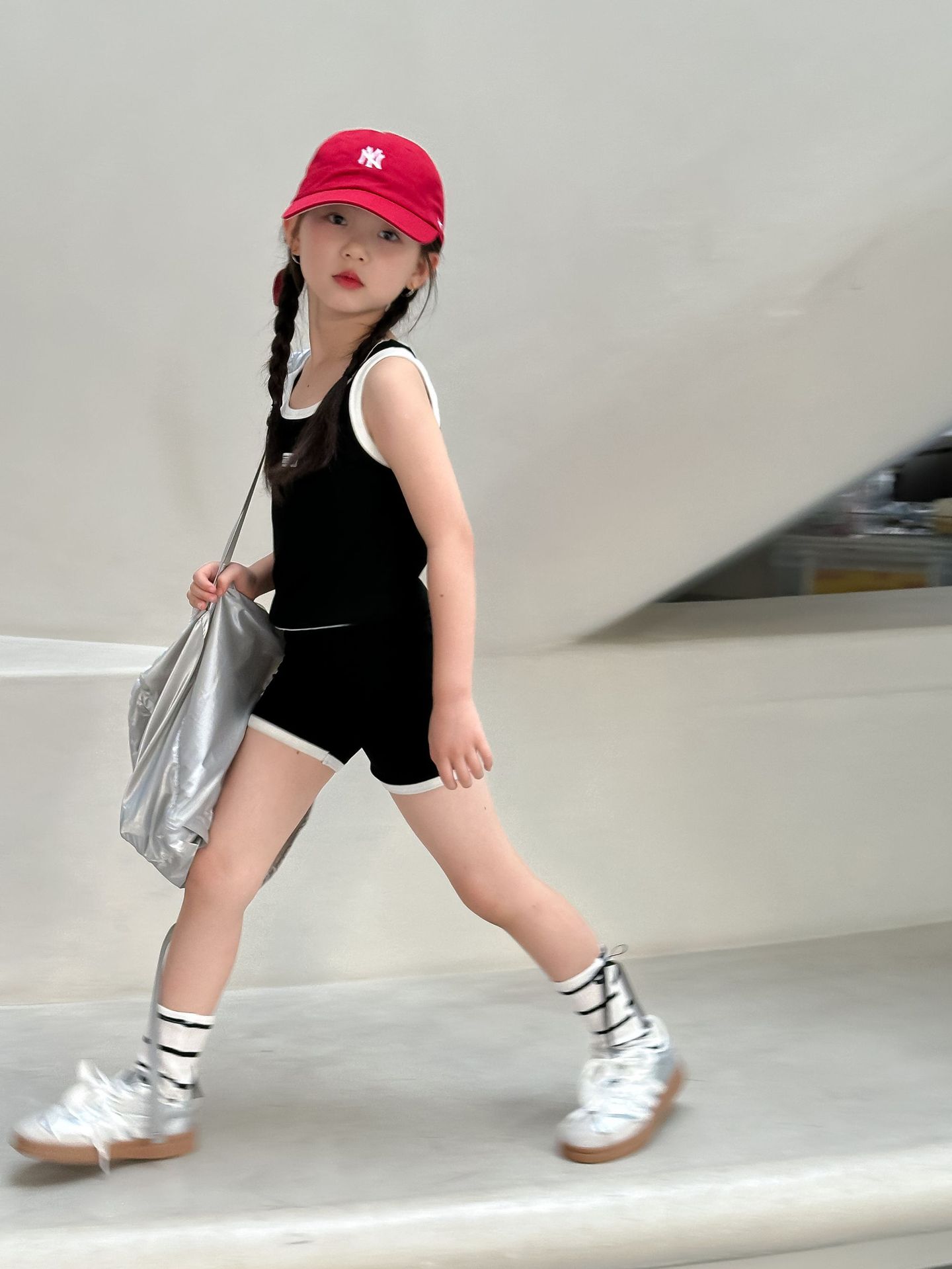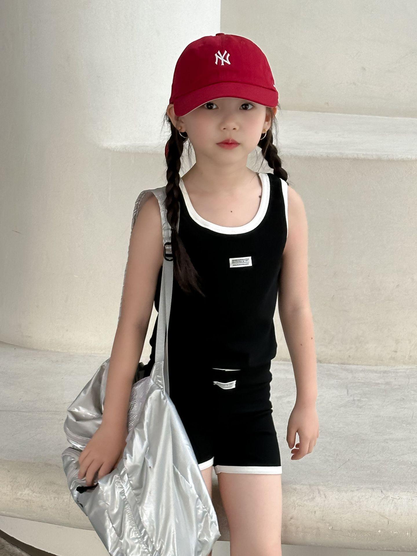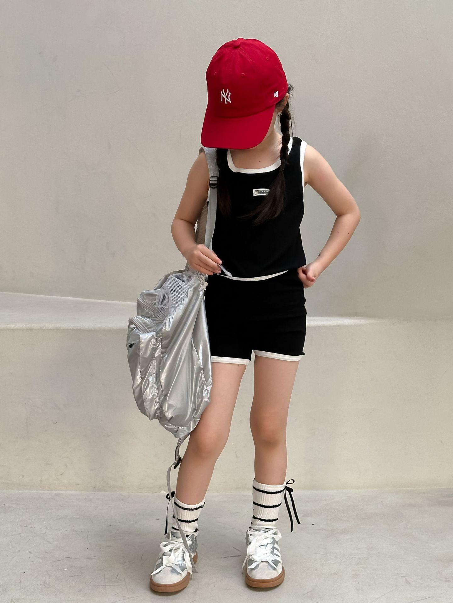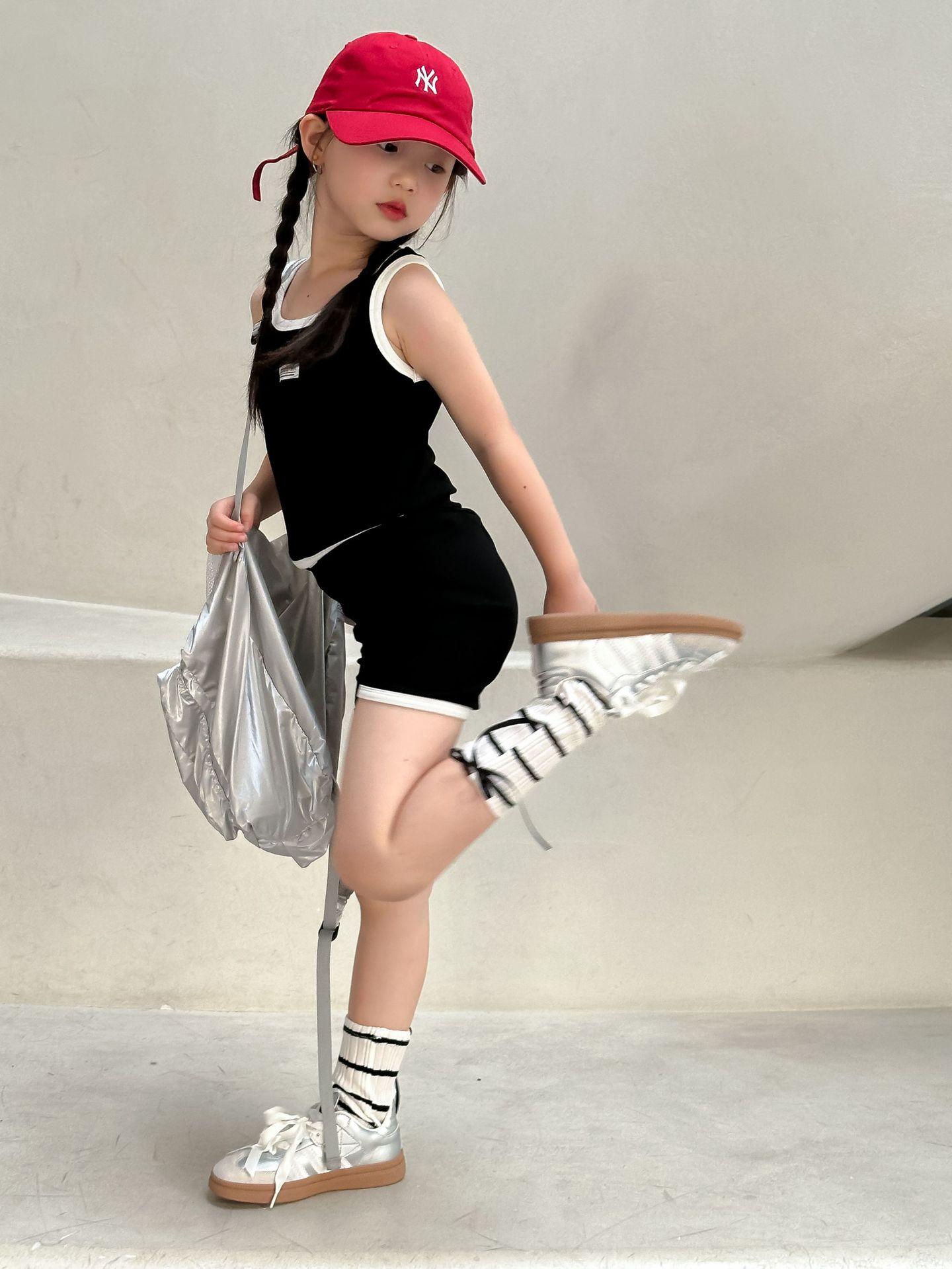 Verano 2025 Chaleco de Punto Americano Elástico para Niña, Traje de Shorts Ajustados con Bloque de Color, Conjunto Deportivo Casual de Dos Piezas para Mujer