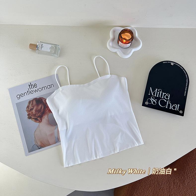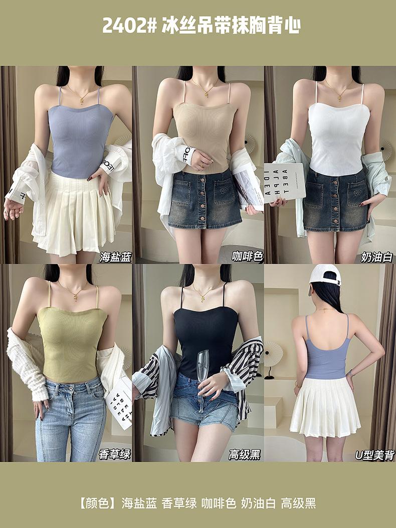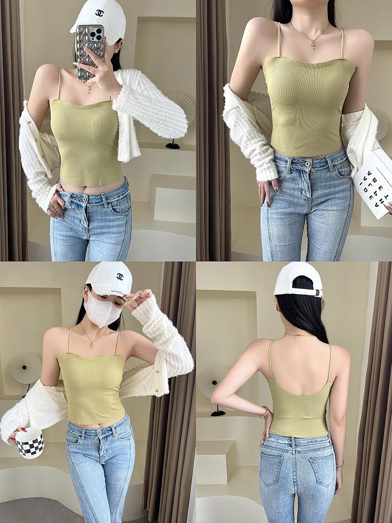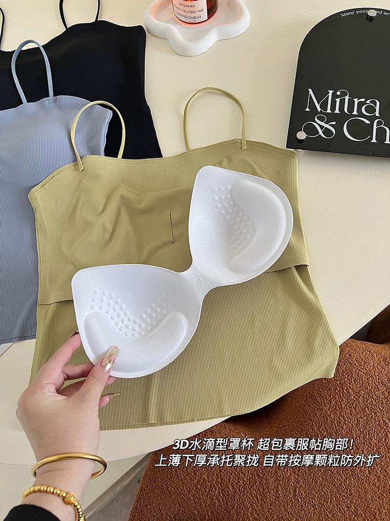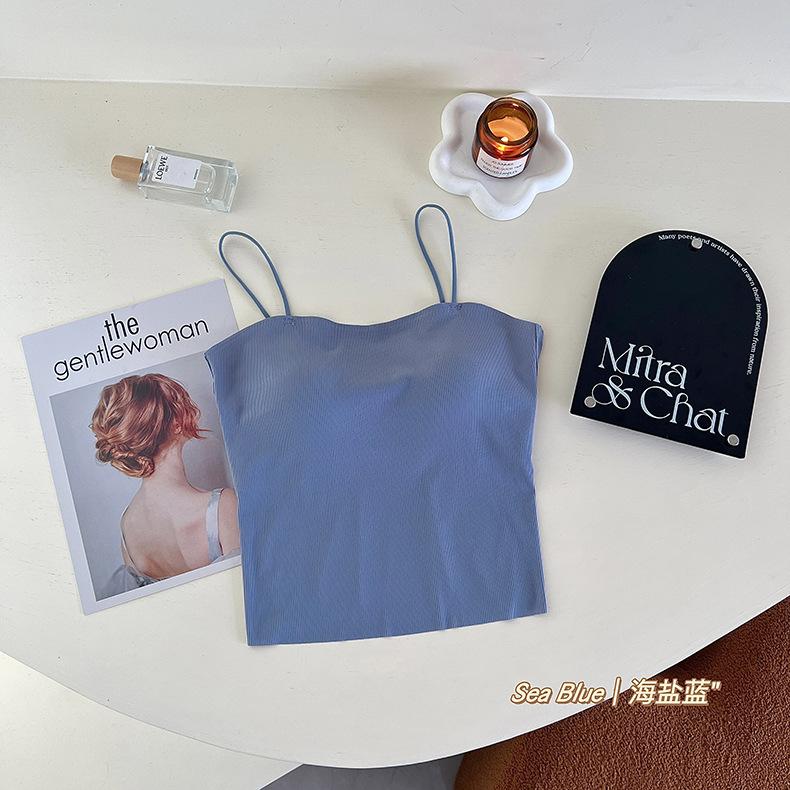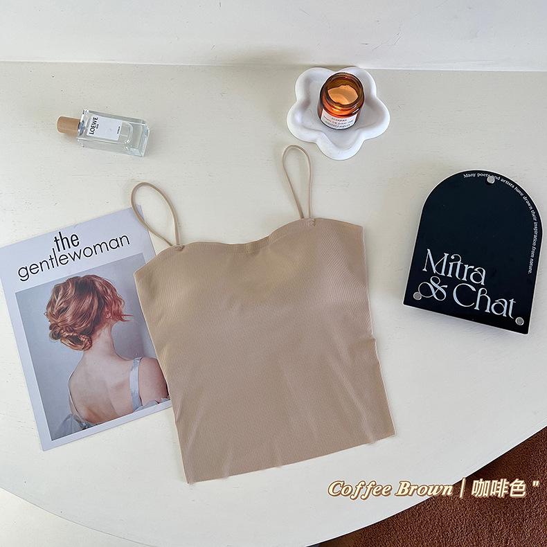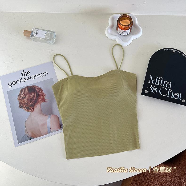 Camisola de seda de hielo con tirantes finos, sin costuras, con espalda en U y sujetador sin costuras, color liso y sencillo para mujer