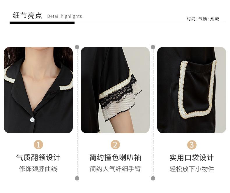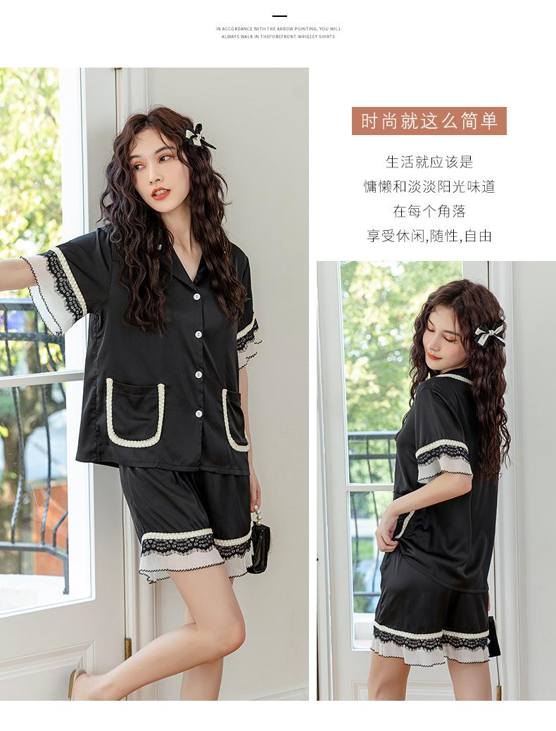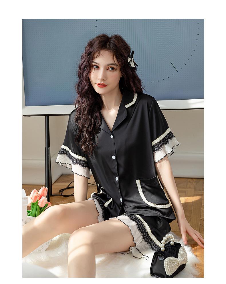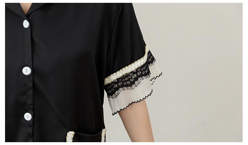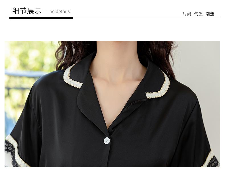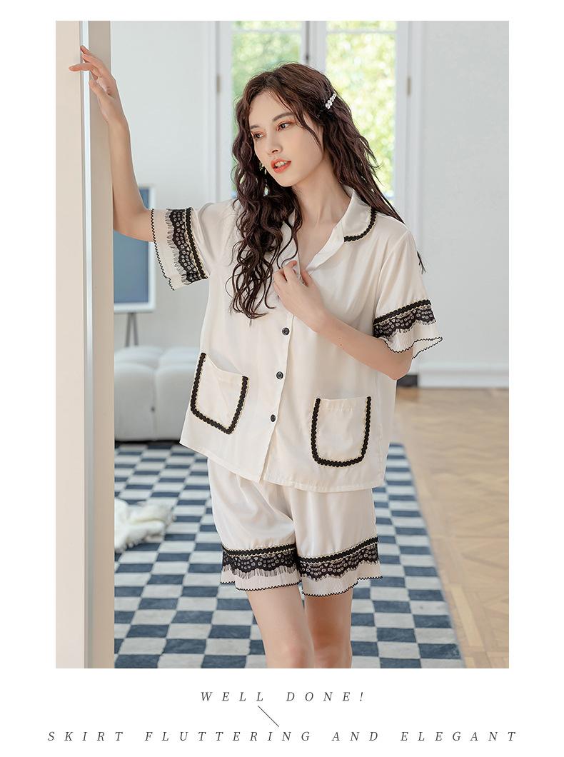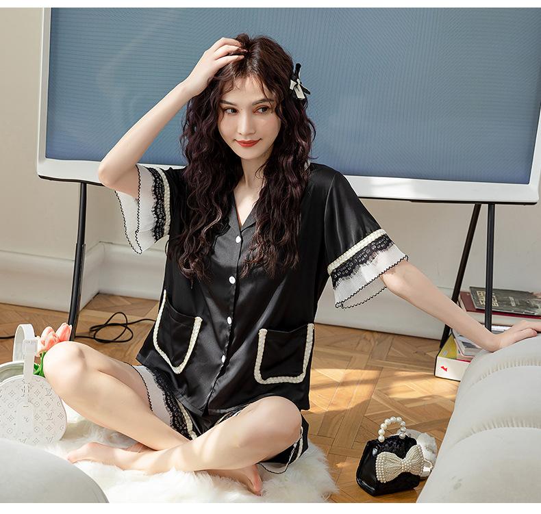 Pijama de Seda de Hielo para Mujer Verano Encaje Costuras Manga Corta Delgada Solapa Set Moda Ropa para el Hogar Transpirable Fresco