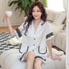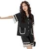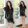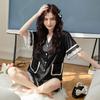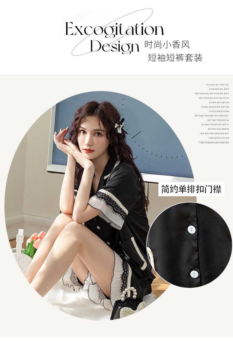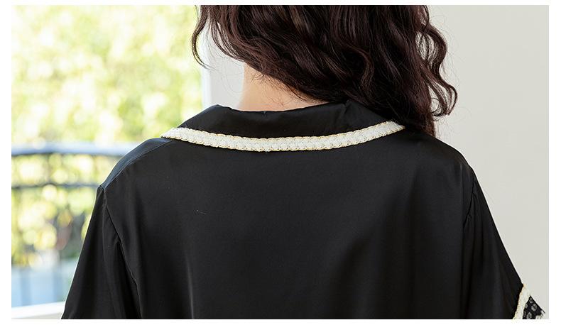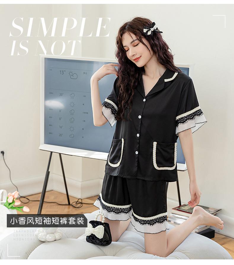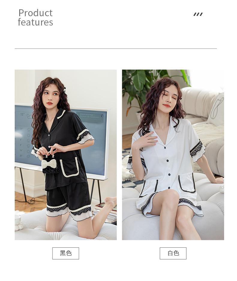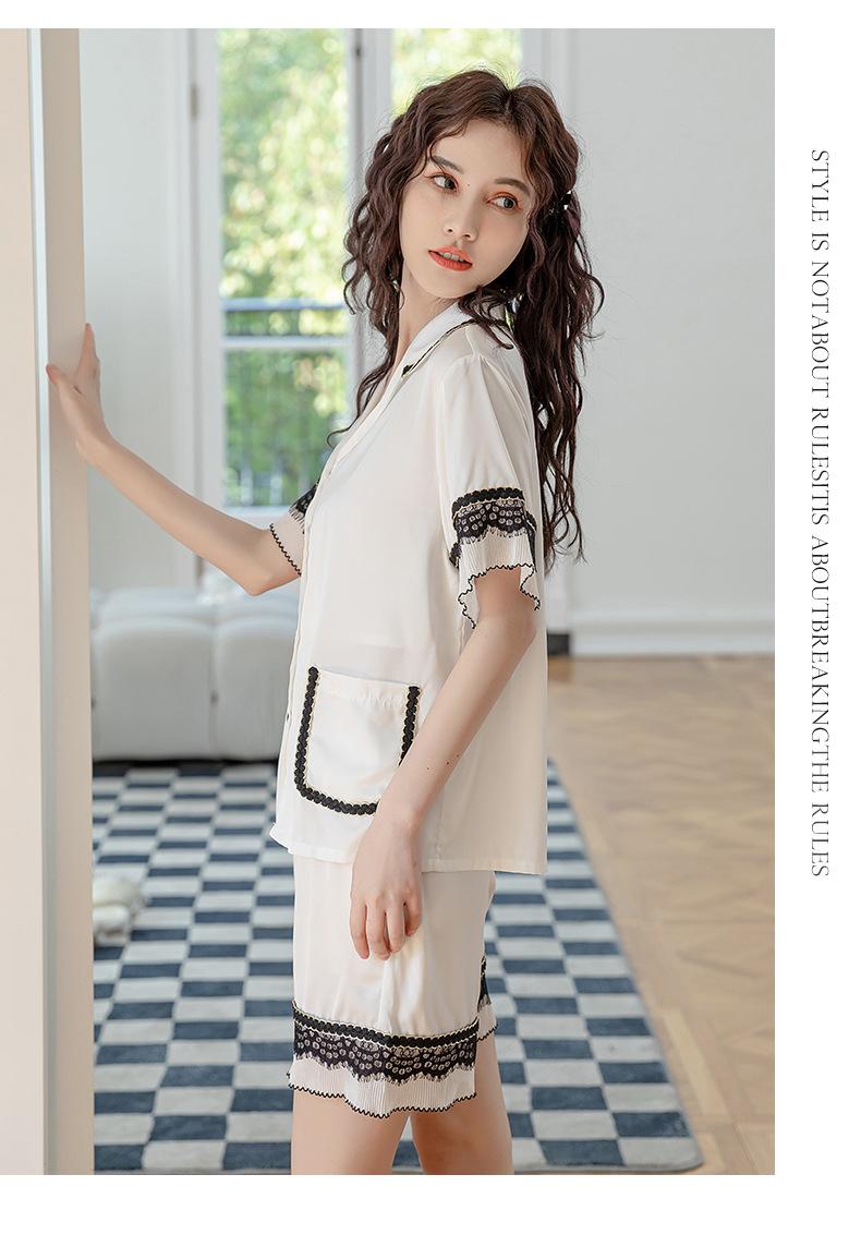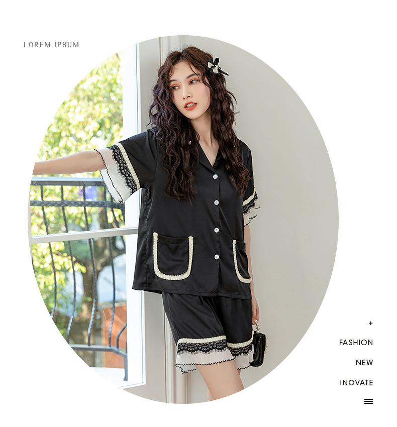 Pijama de Seda de Hielo para Mujer Verano Encaje Costuras Manga Corta Delgada Solapa Set Moda Ropa para el Hogar Transpirable Fresco