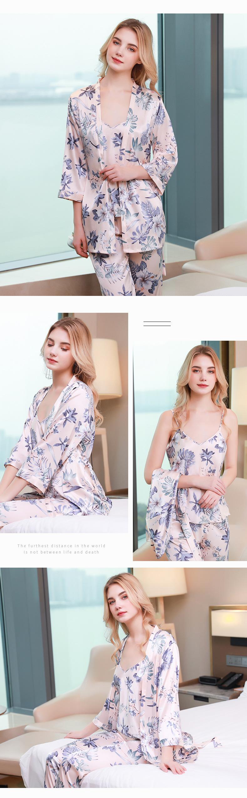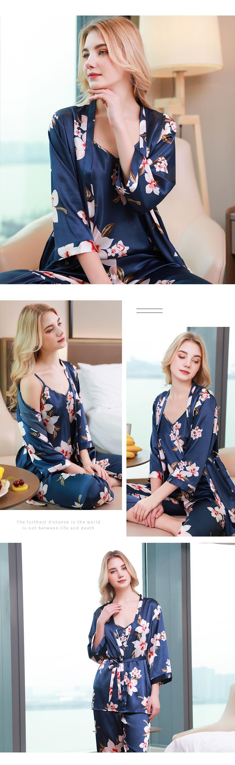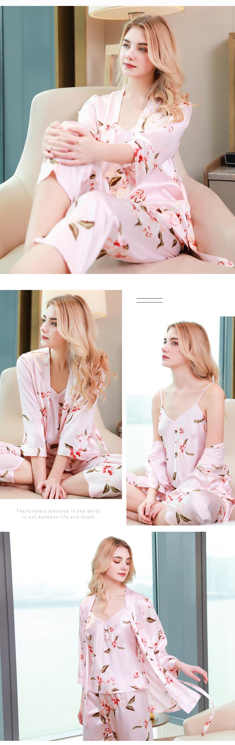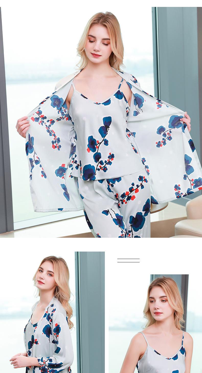 Pijama de tres piezas para mujer, pantalón de seda con tirantes, camisón de seda fina con estampado, conjunto de ropa para el hogar