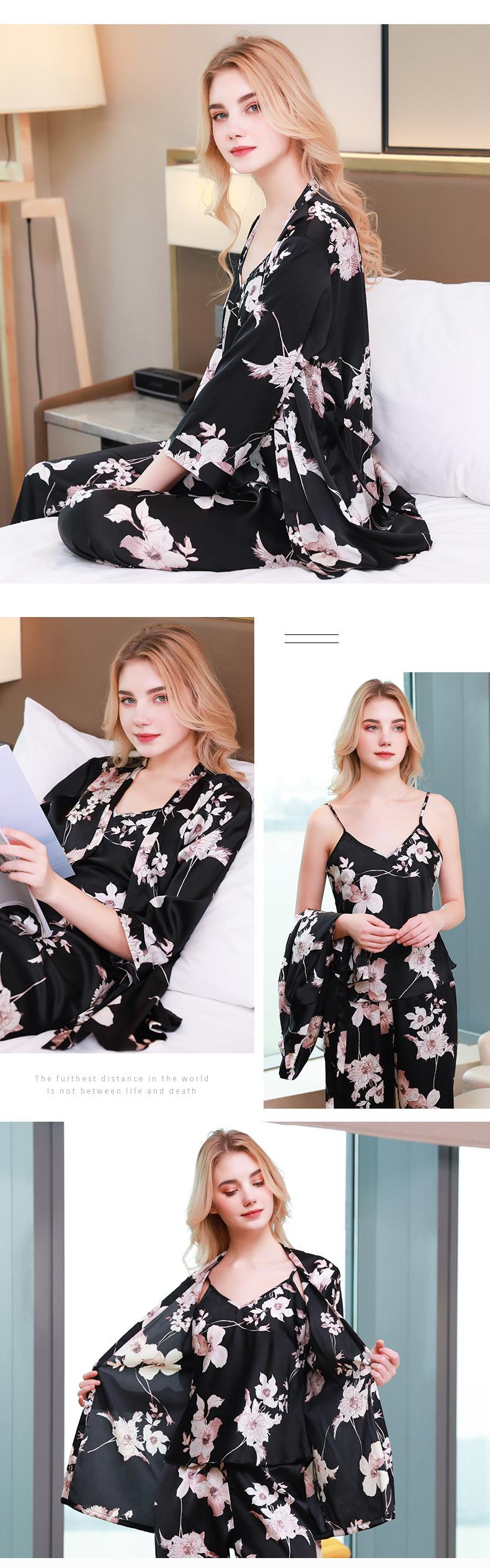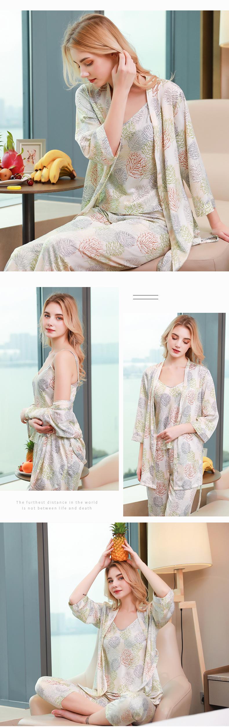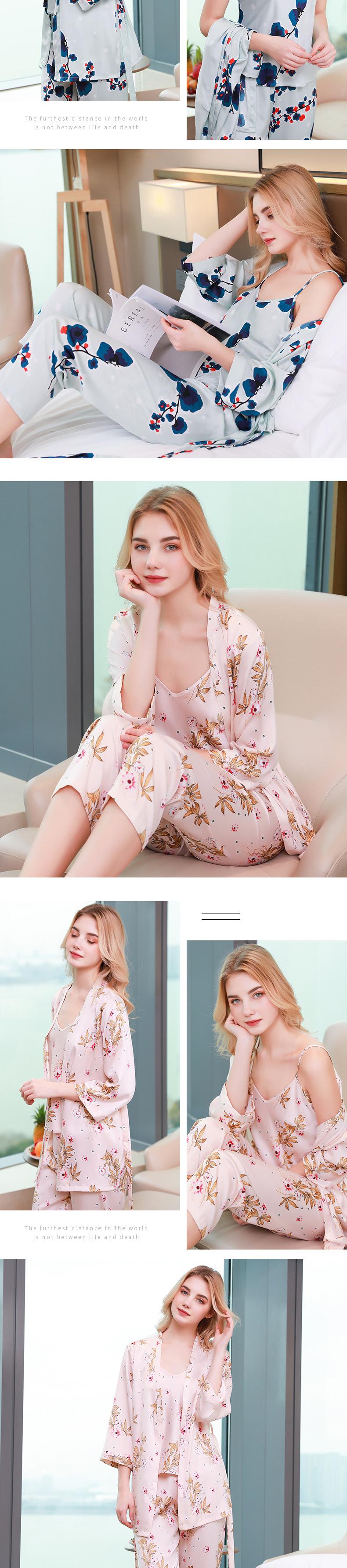 Pijama de tres piezas para mujer, pantalón de seda con tirantes, camisón de seda fina con estampado, conjunto de ropa para el hogar