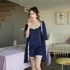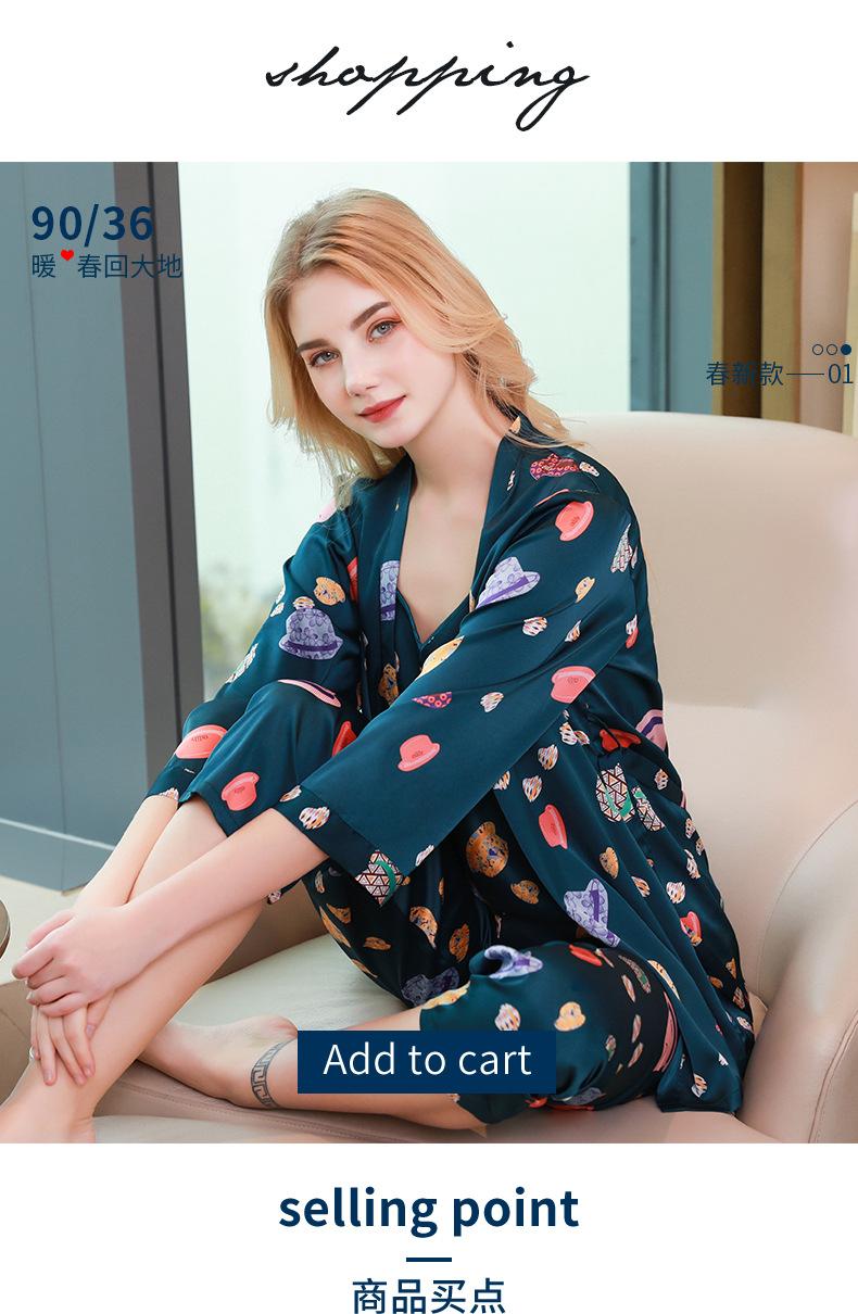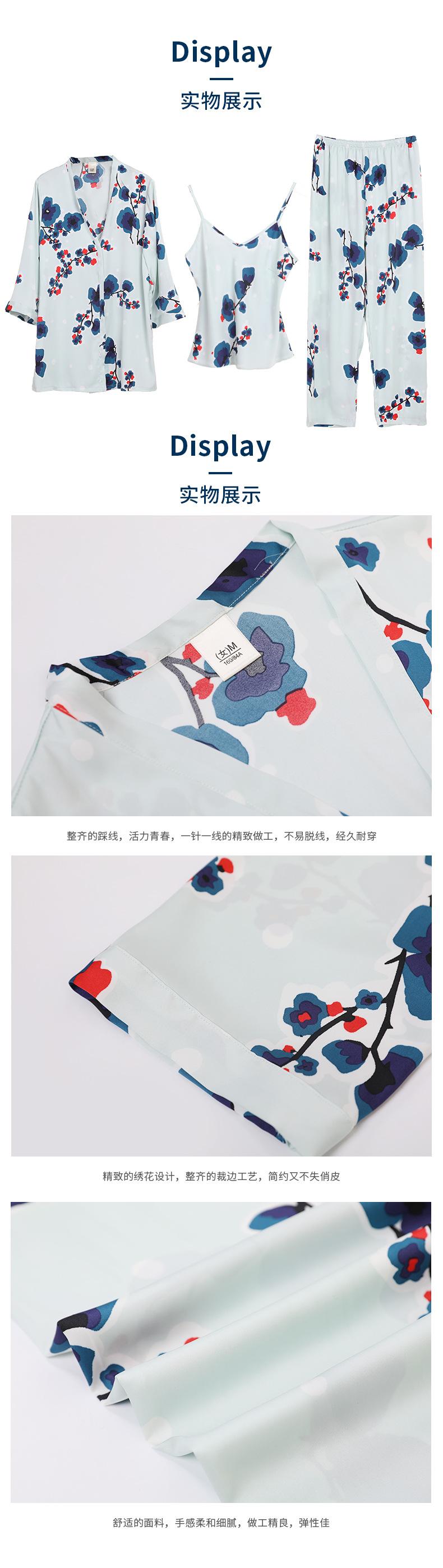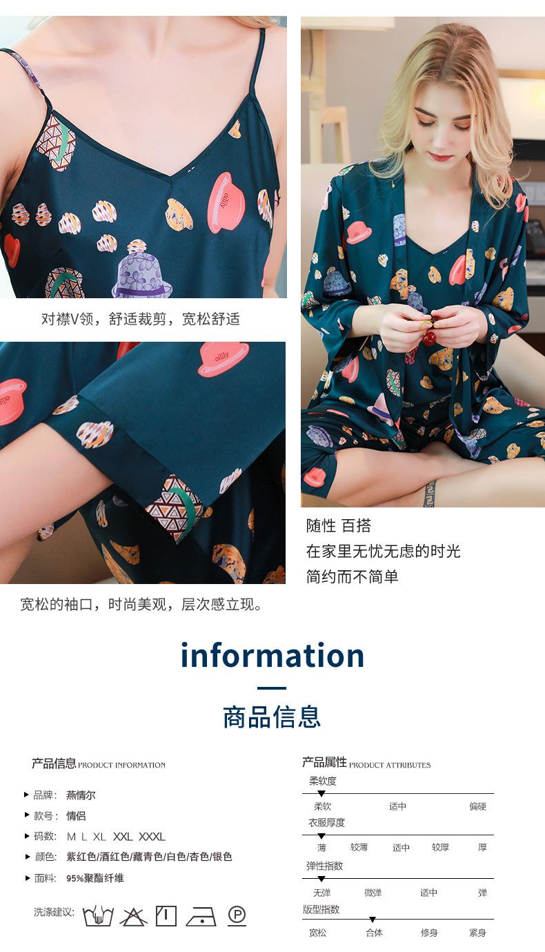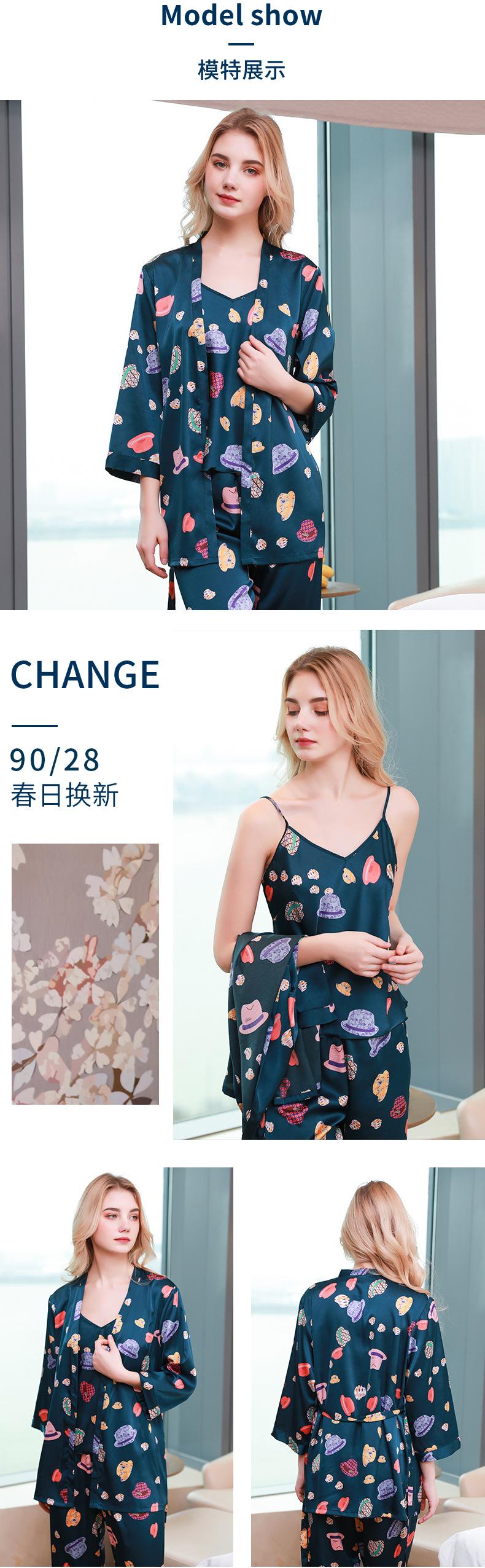 Pijama de tres piezas para mujer, pantalón de seda con tirantes, camisón de seda fina con estampado, conjunto de ropa para el hogar
