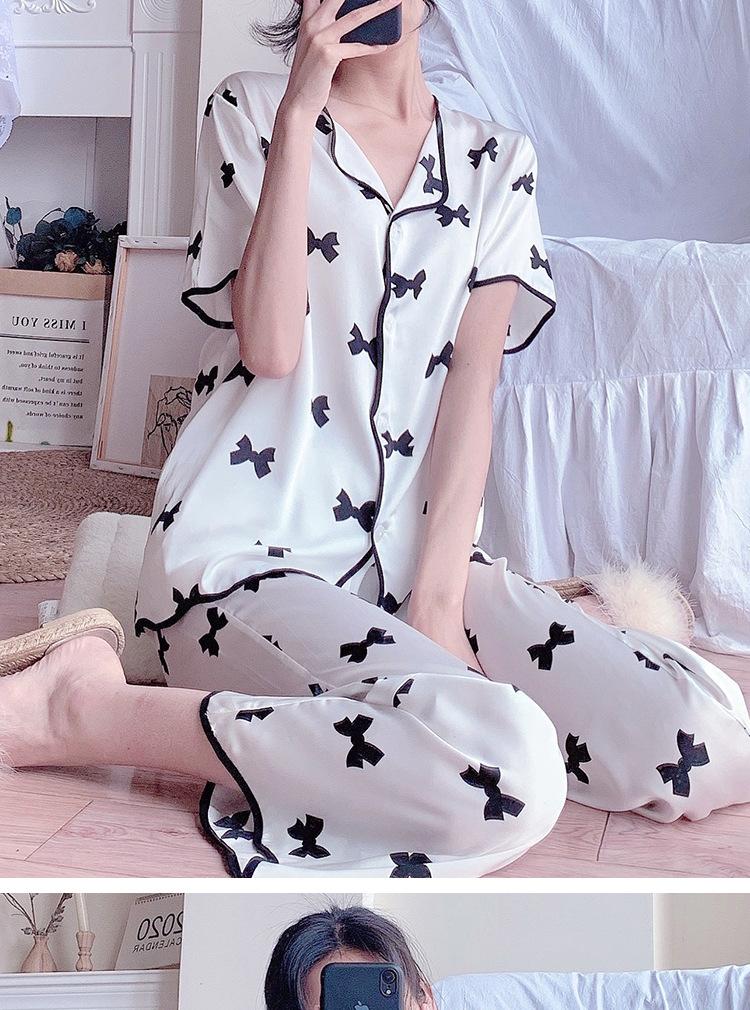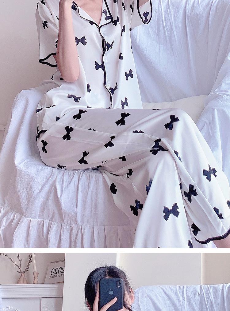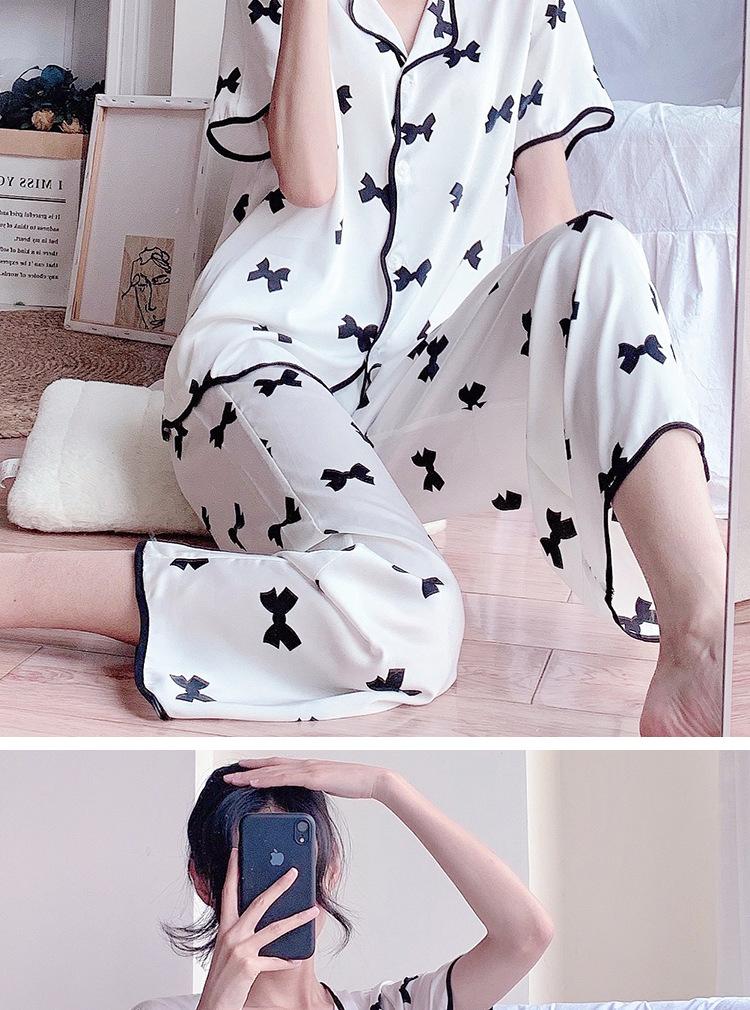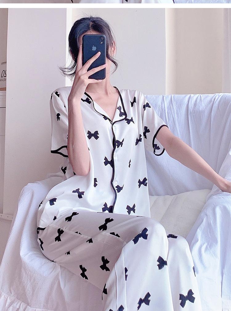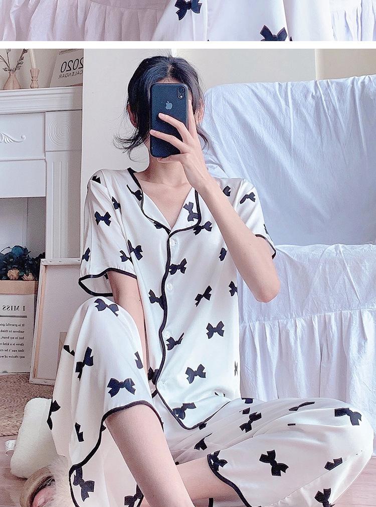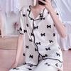 Pijamas de mujer nuevos de primavera y verano, pantalones de manga corta, ropa de casa, traje con lazo y cuello en V, cárdigan de seda helada de dos piezas, venta al por mayor