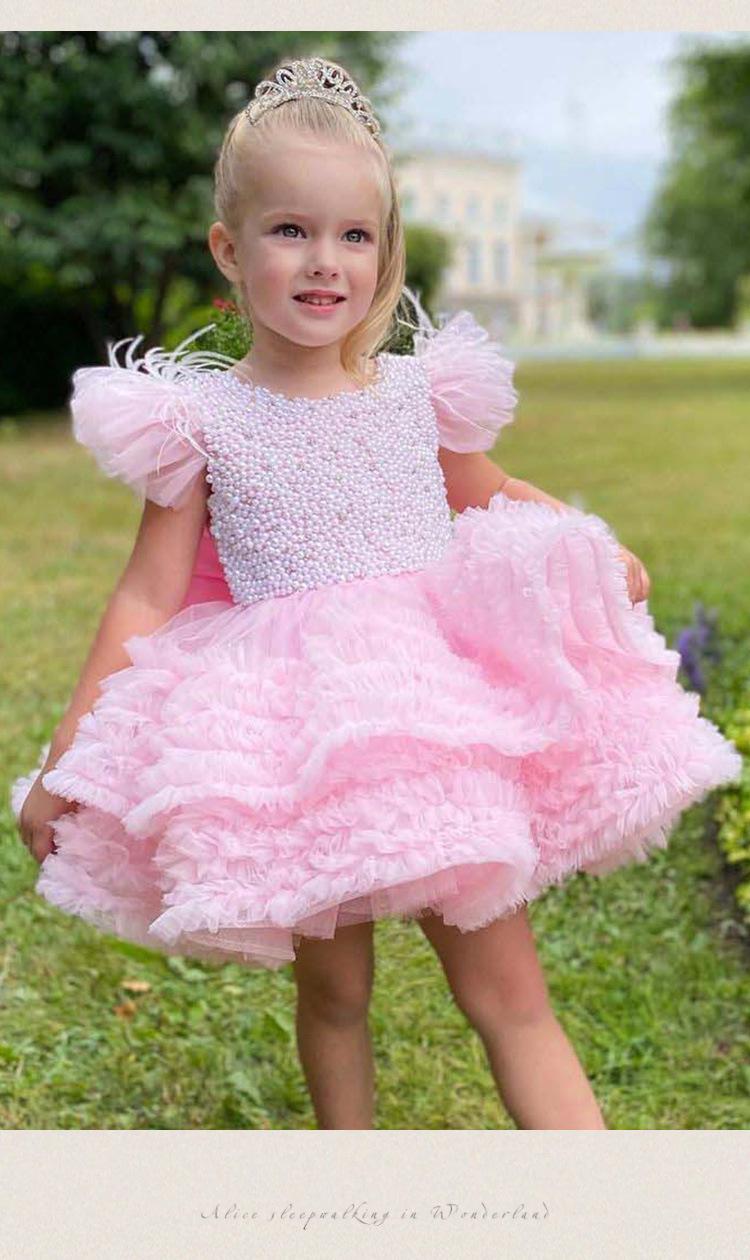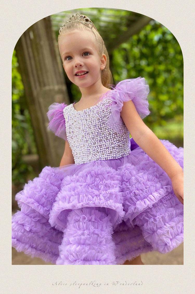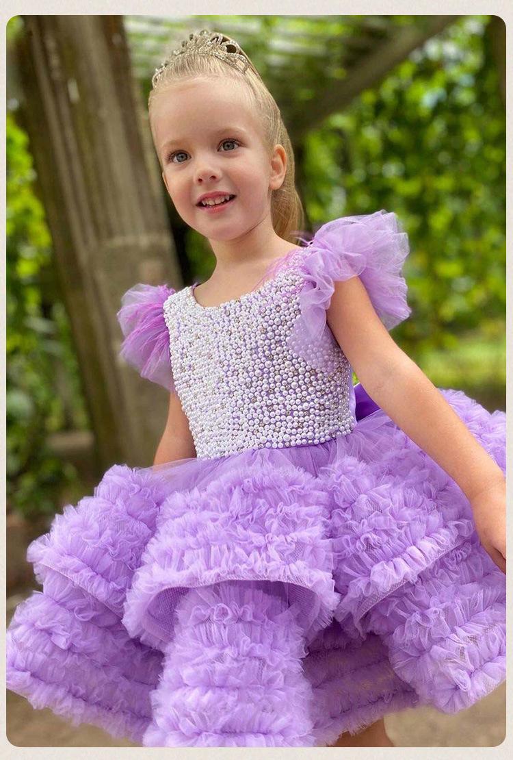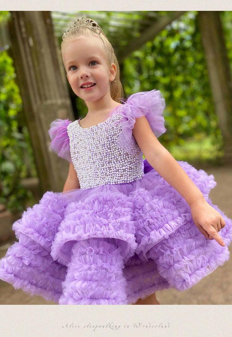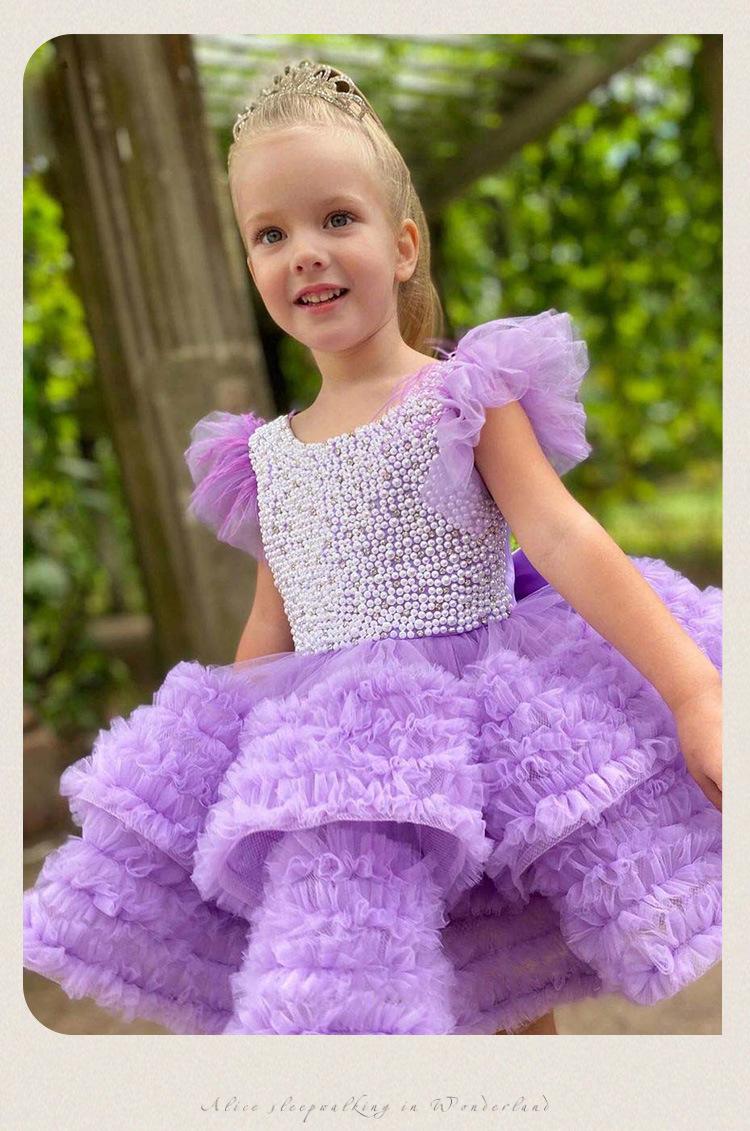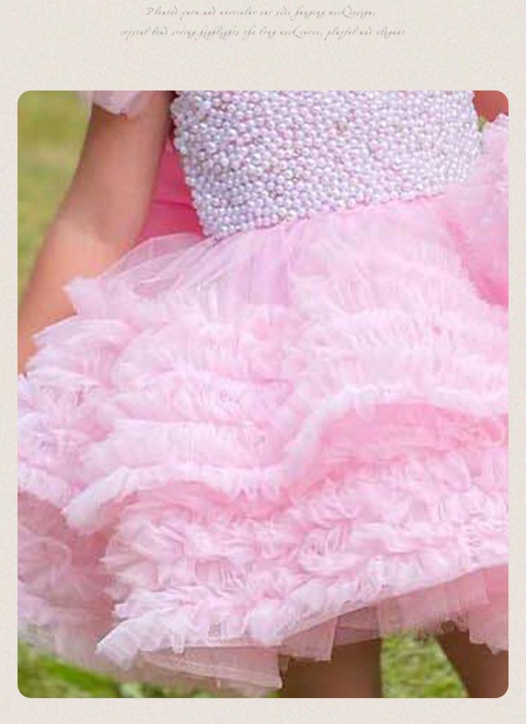 Vestido de niña con mangas voladoras, vestido de princesa con perlas, vestido de pasarela para anfitriona de cumpleaños, vestido de actuación de piano, falda de pastel de niña de las flores de estilo occidental