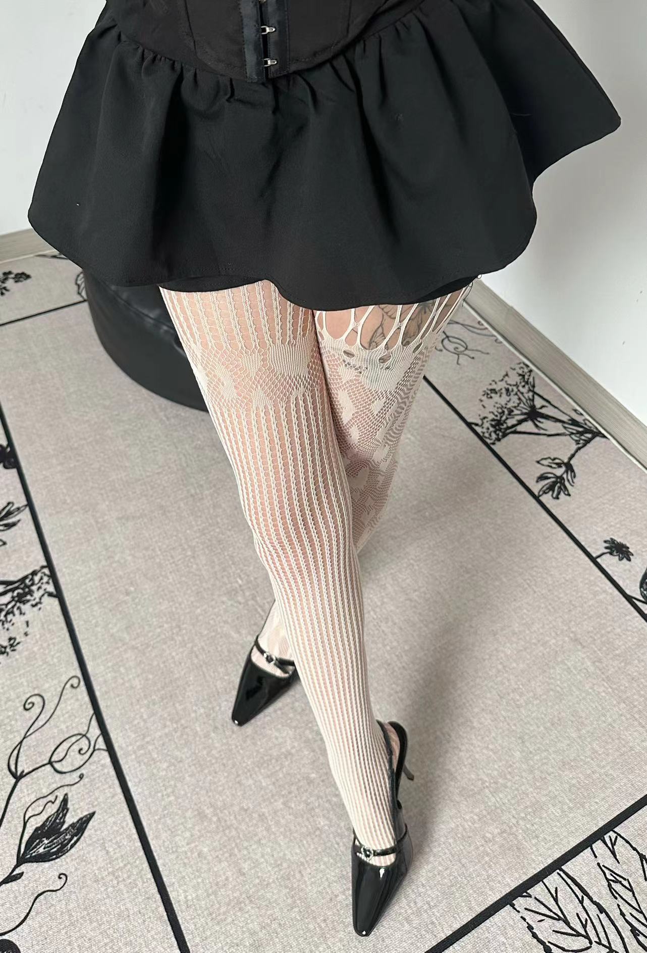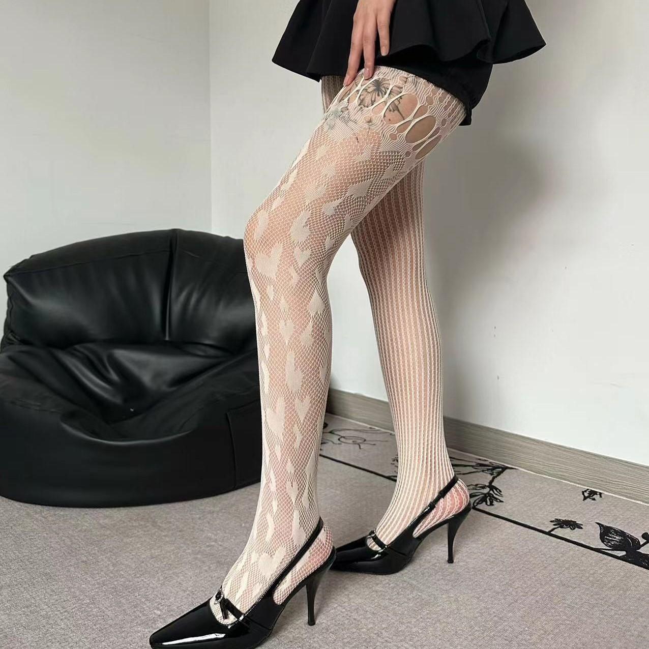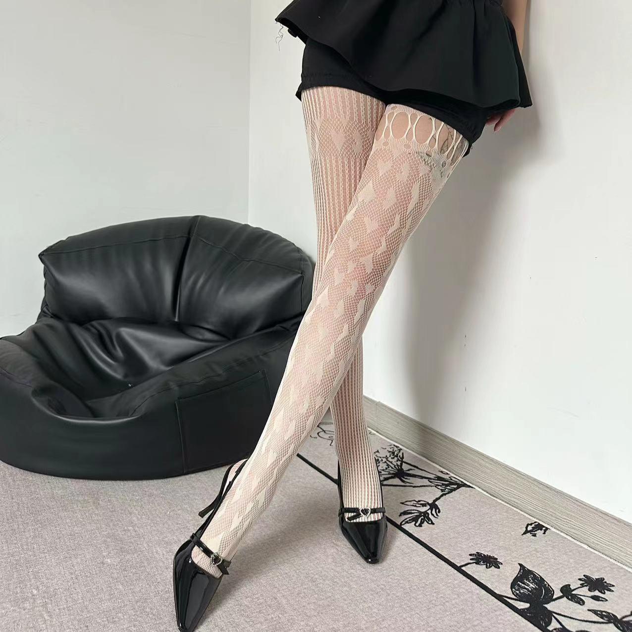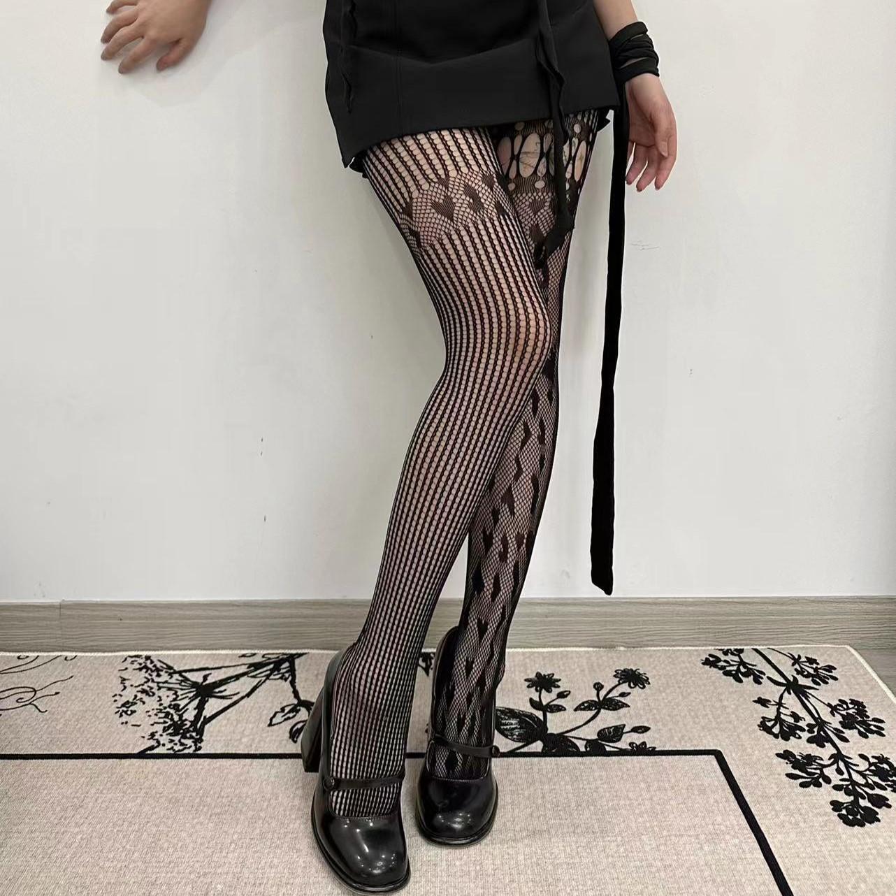 Primavera y verano delgado yk2 amor asimétrico sexy red de pesca americano moderno encaje costuras hueco red medias pantimedias