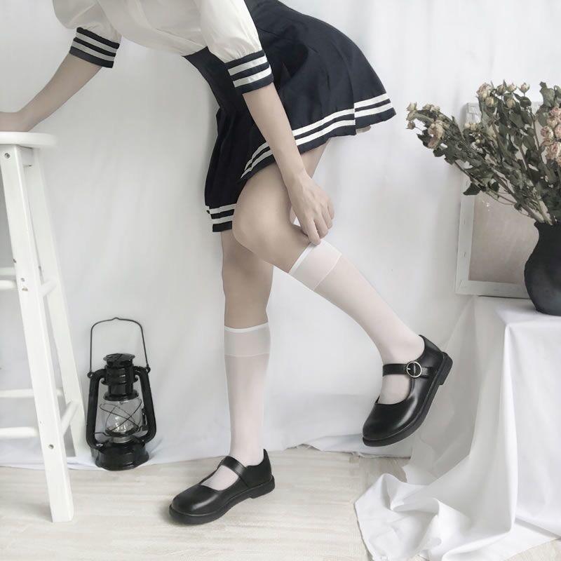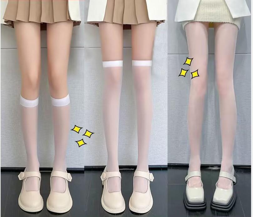 Medias de seda blancas para mujer, estilo Lolita JK, translúcidas, de verano, finas, con pierna fina, antigancho, de seda, por encima de la rodilla.