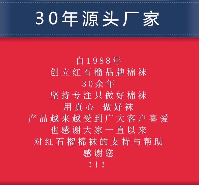 ¡Hola! Bienvenidos a Red Pomegranate Cotton Socks, una reconocida marca de la provincia de Shanxi, una tienda de fábrica directa de la marca. Red Pomegranate Cotton Socks lleva 30 años dedicándose a la fabricación de calcetines de algodón. Gracias a su filosofía de desarrollo basada en la innovación, el pragmatismo, la unidad y el beneficio mutuo, sus productos son cada vez más populares entre los clientes. Agradecemos a todos su apoyo y confianza en Red Pomegranate Cotton Socks. Red Pomegranate Cotton Socks seguirá enfocándose en la fabricación de calcetines de algodón de alta calidad, sin poliéster ni trama, y tejiendo calcetines de algodón de alta calidad que sean beneficiosos para la salud y la comodidad. Red Pomegranate Cotton Socks tiene un hermoso significado: muchos hijos, buena fortuna, auspicios y prosperidad, ¡lo cual es nuestra mayor bendición!