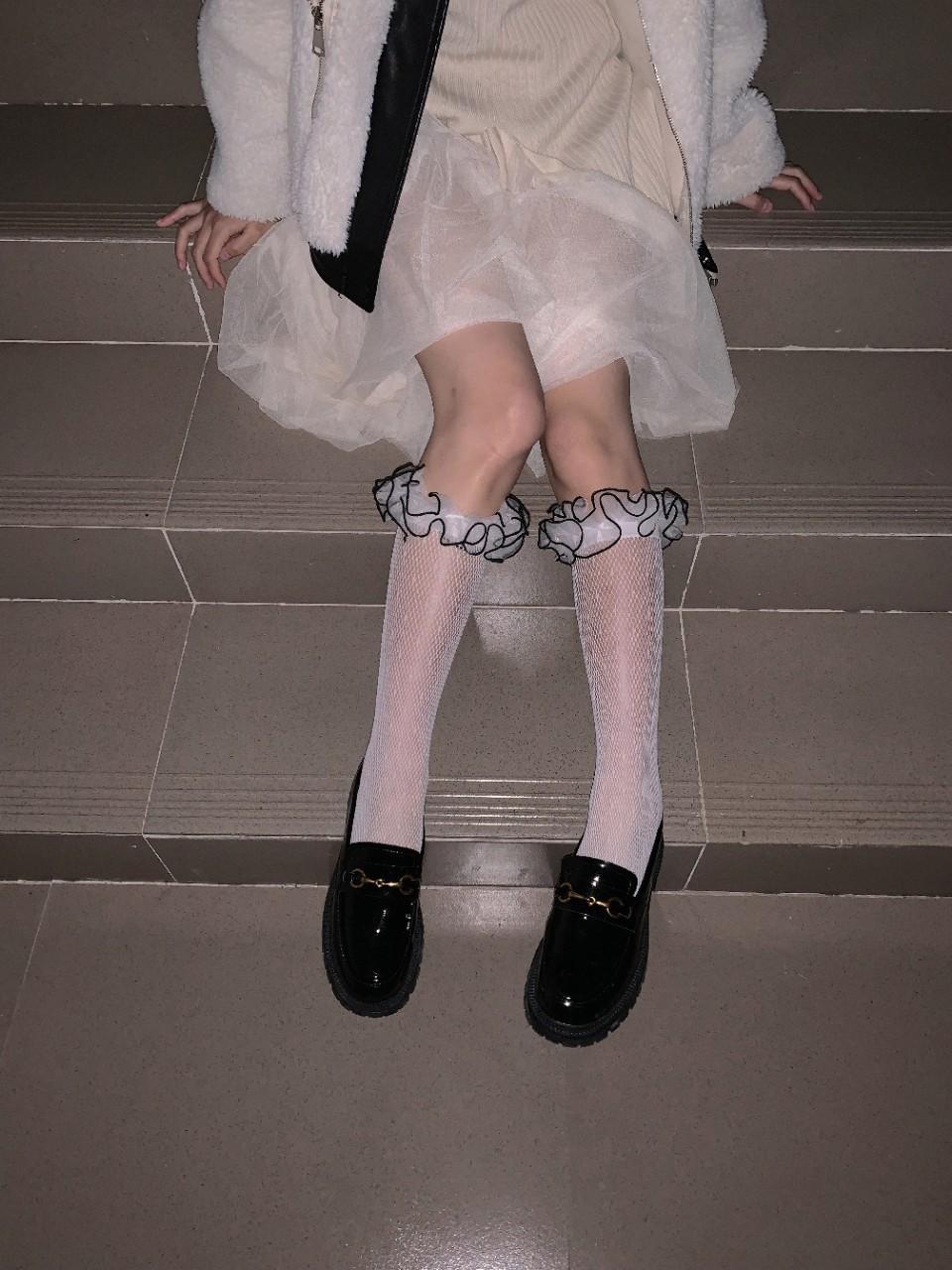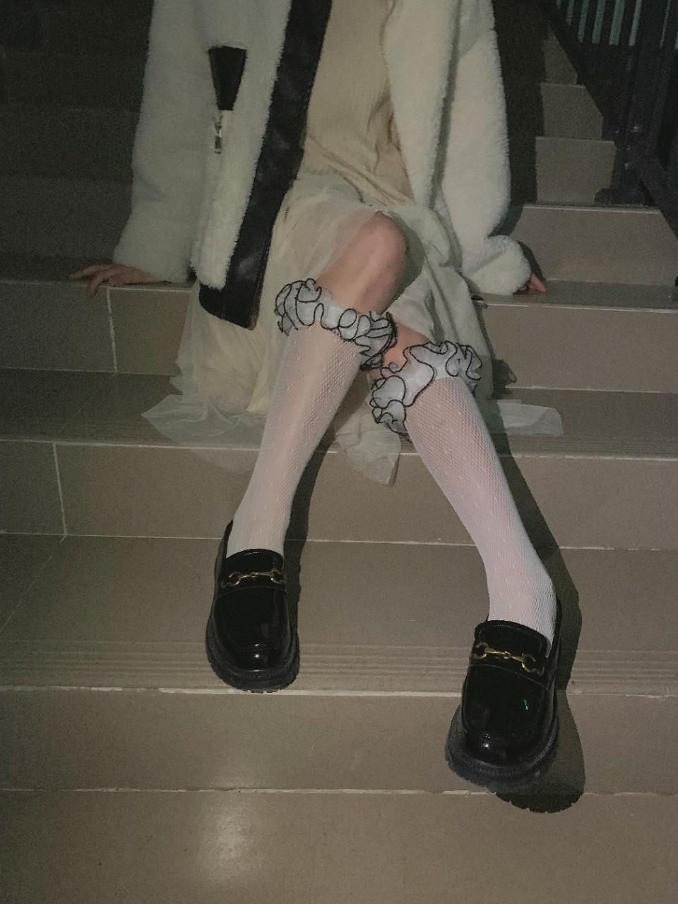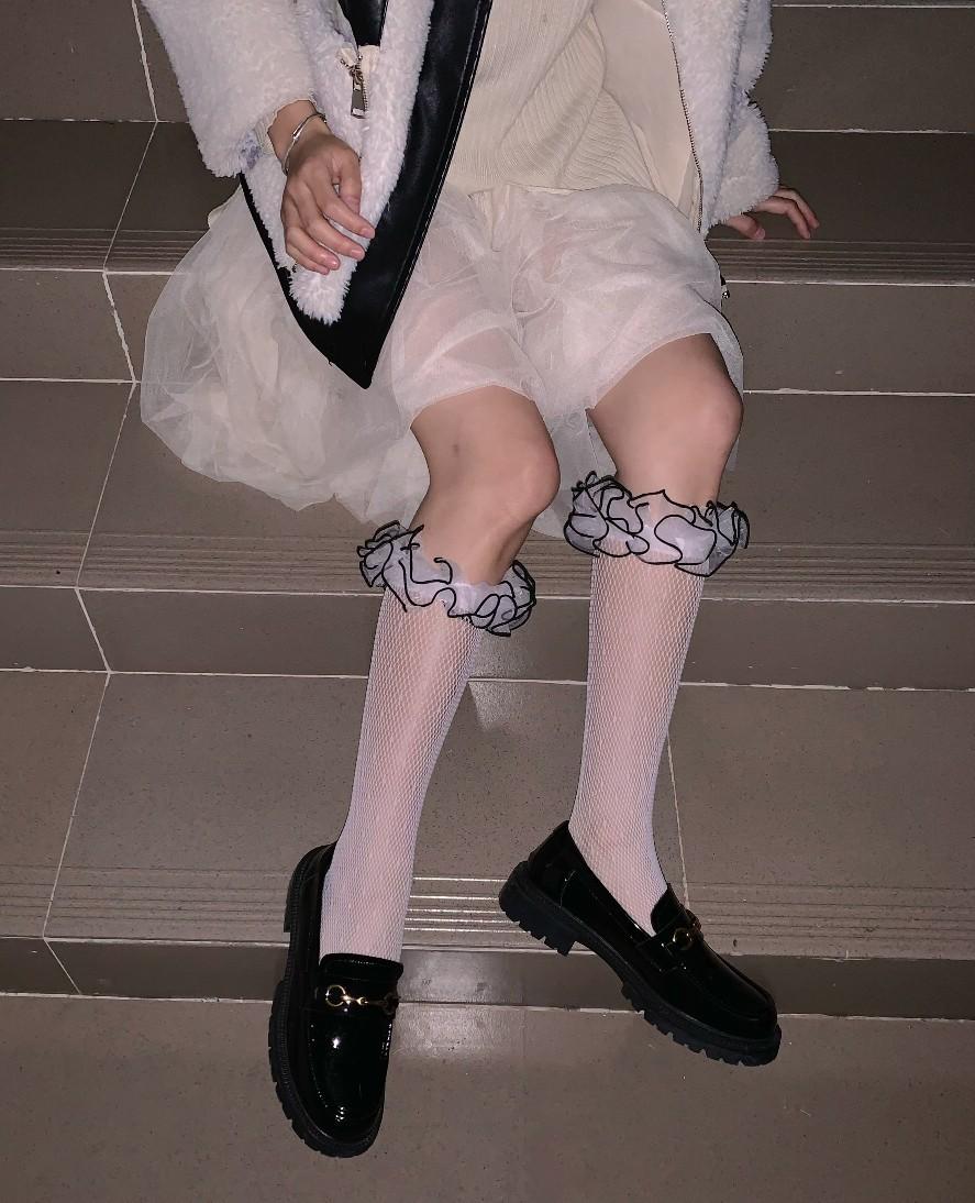 Calcetines de primavera y verano delgados, dulces, pequeños de lunares jacquard calados de red, calcetines cub, de doble capa con encaje plisado, calcetines de rizo