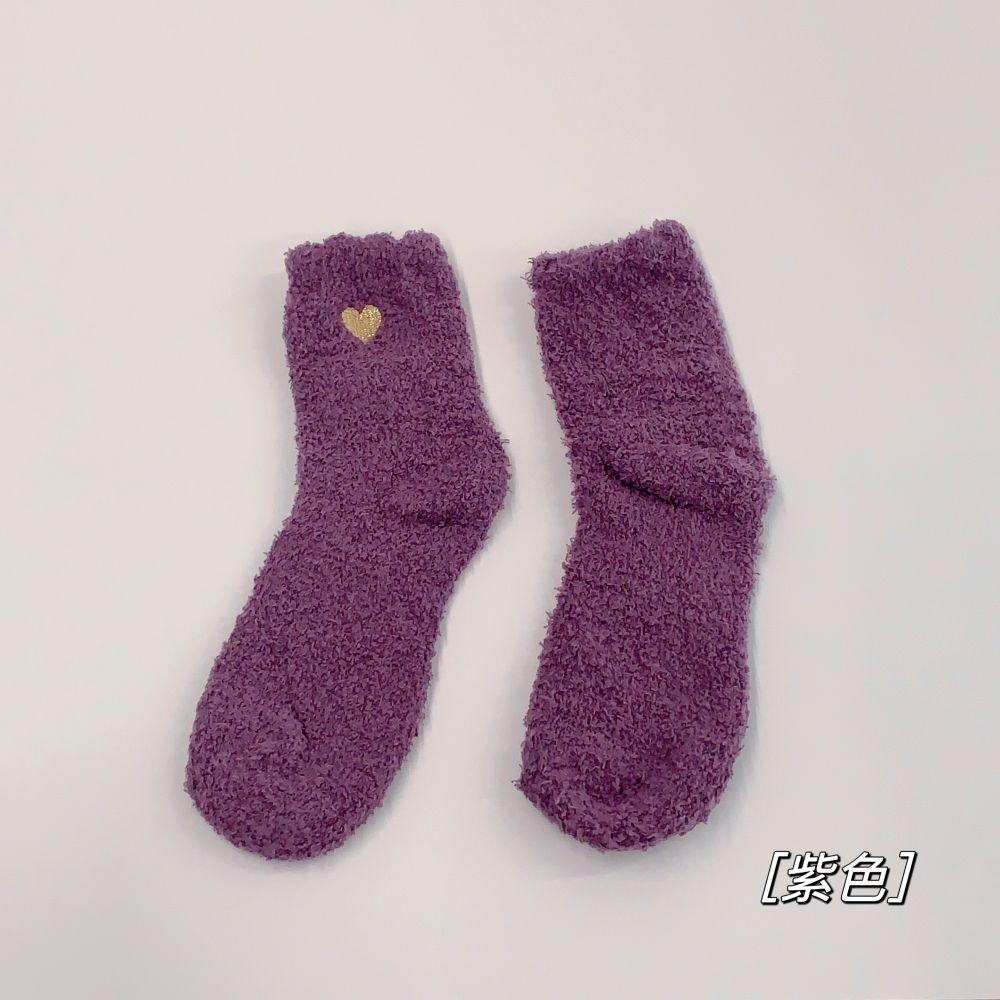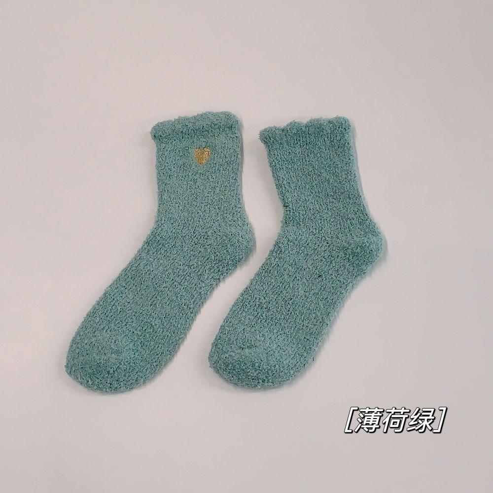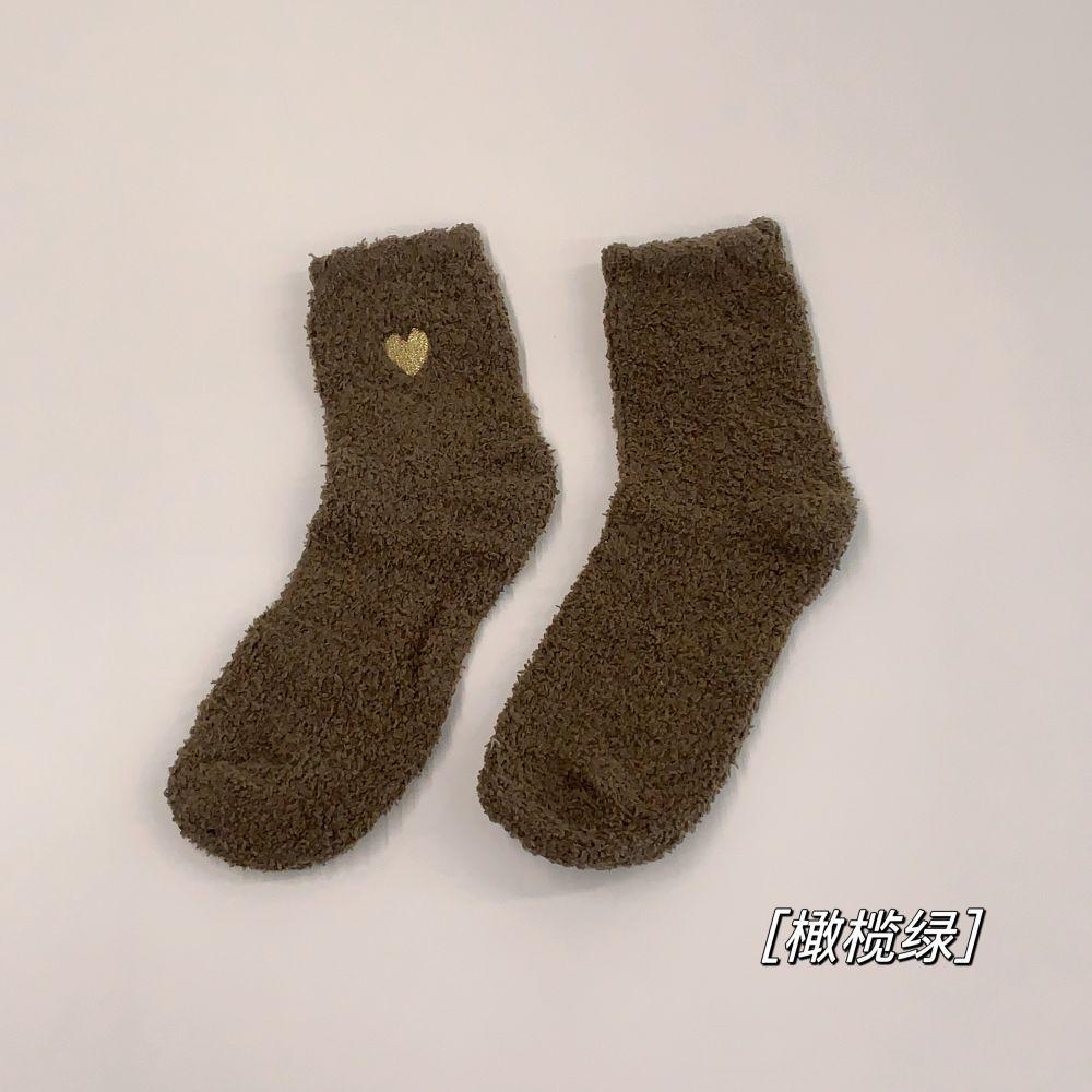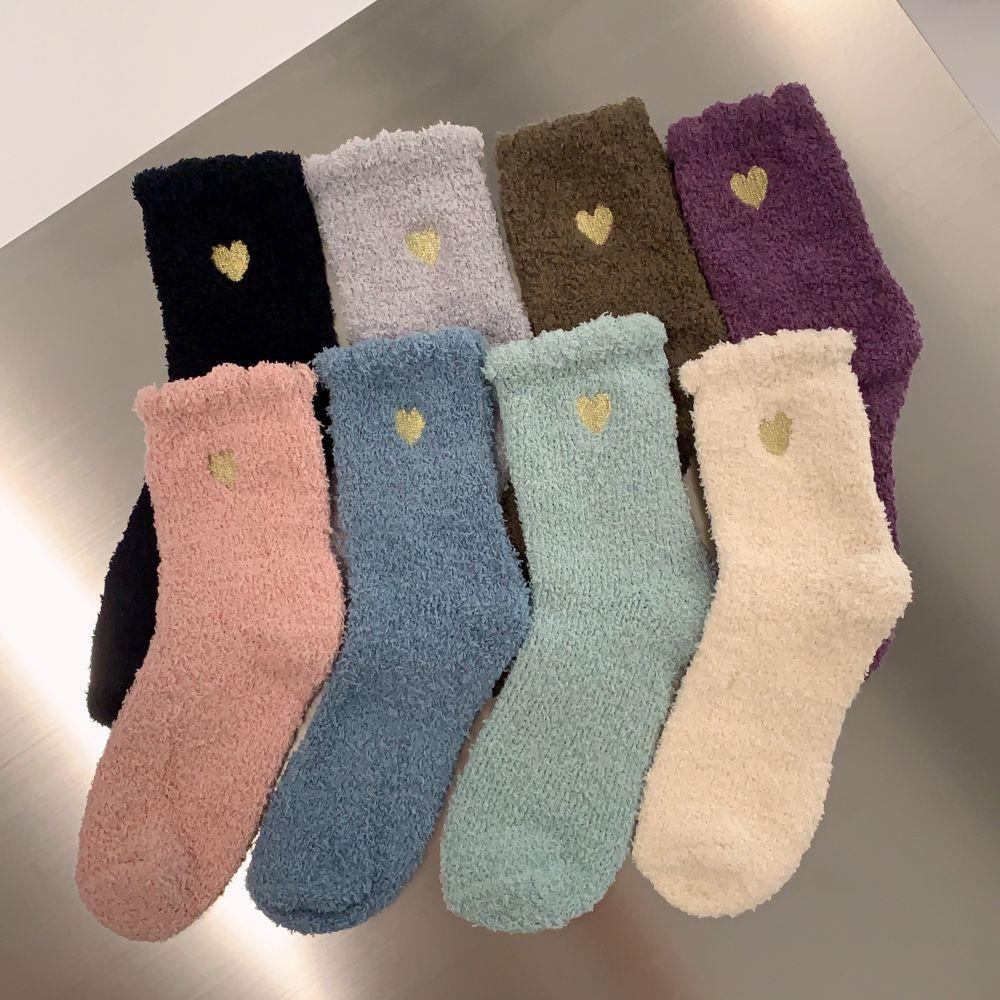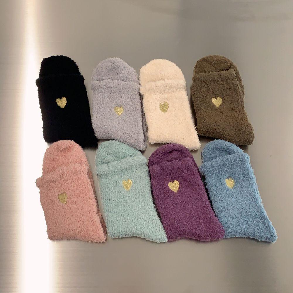 Calcetines gruesos de vellón coral hasta media pantorrilla, calcetines japoneses sencillos de algodón cálidos para el suelo, calcetines coloridos de color sólido bordados con amor para mujer