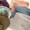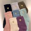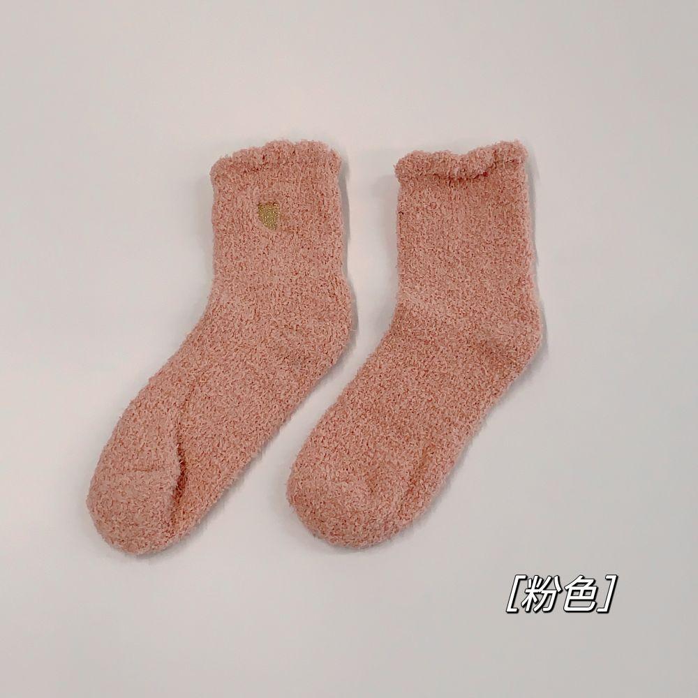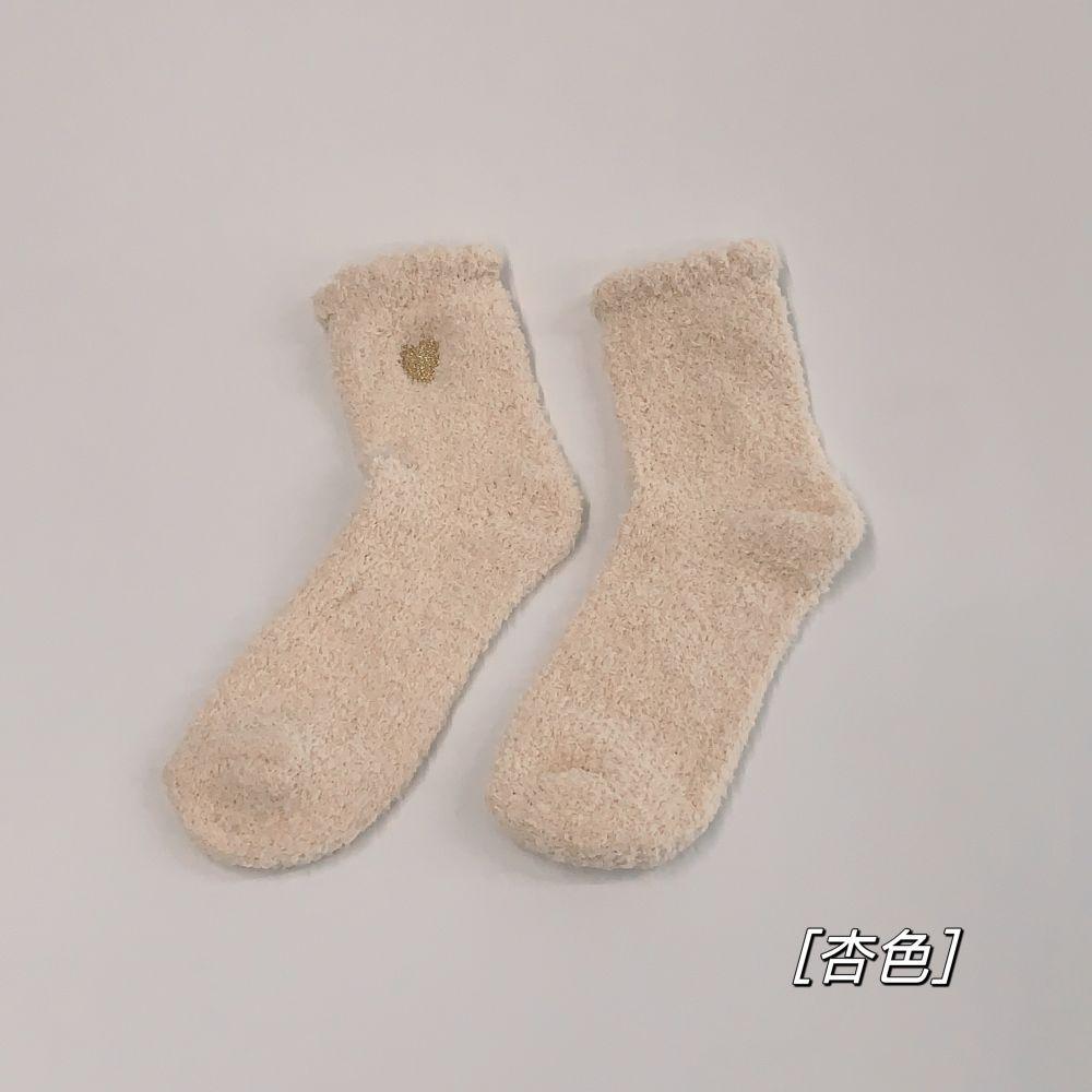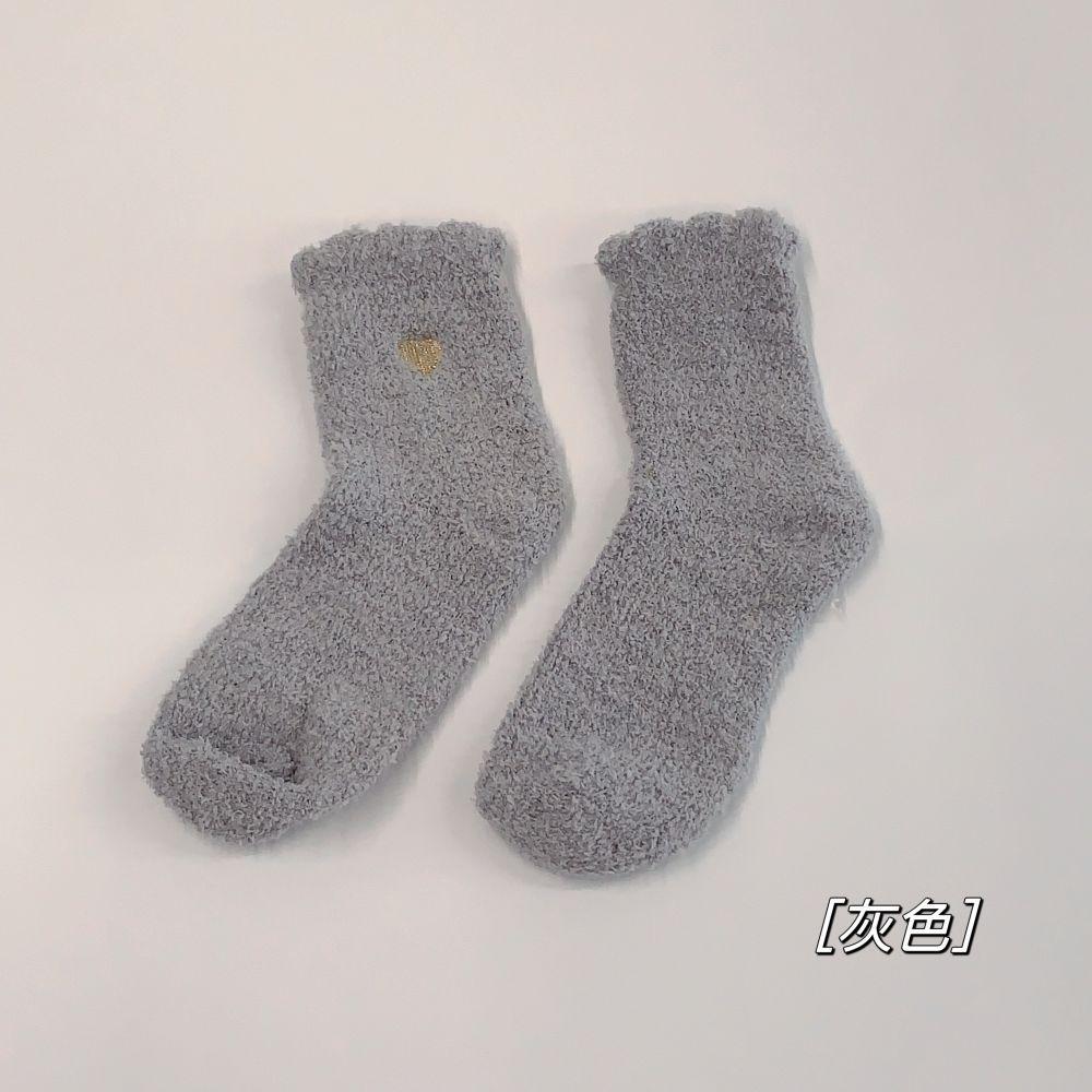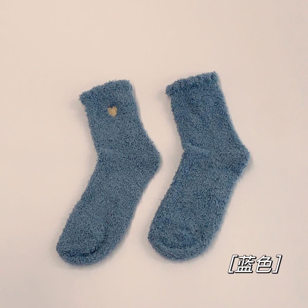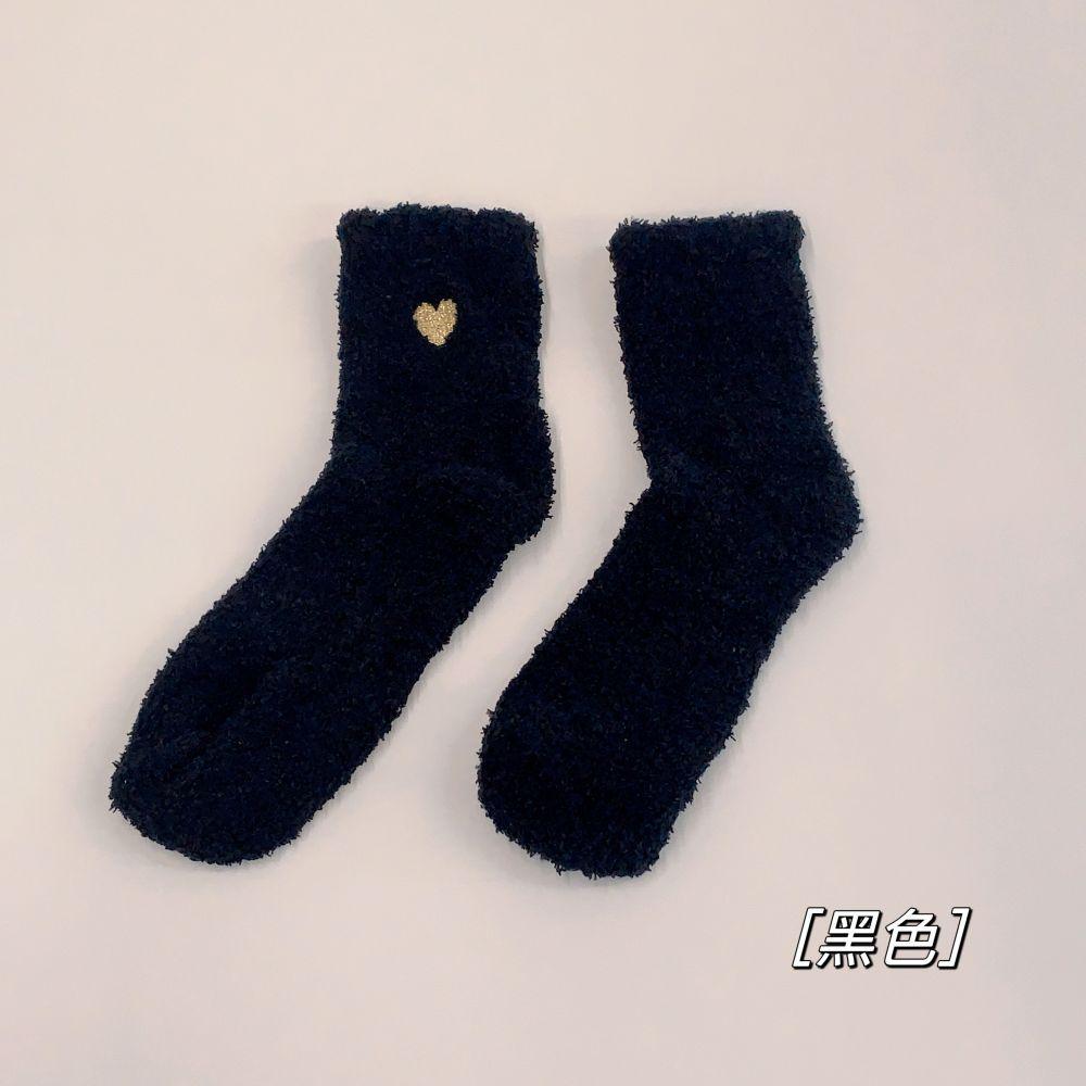 Calcetines gruesos de vellón coral hasta media pantorrilla, calcetines japoneses sencillos de algodón cálidos para el suelo, calcetines coloridos de color sólido bordados con amor para mujer
