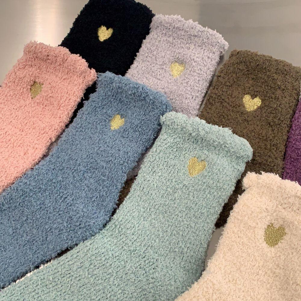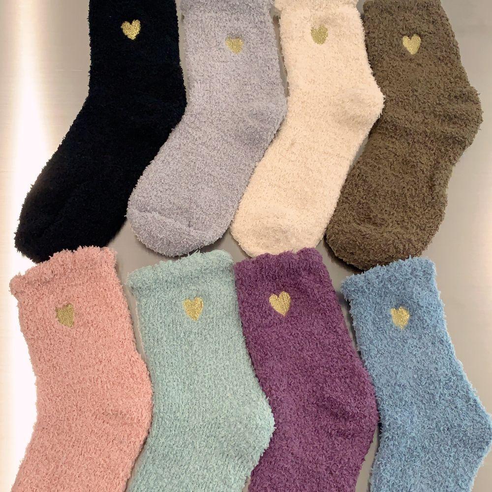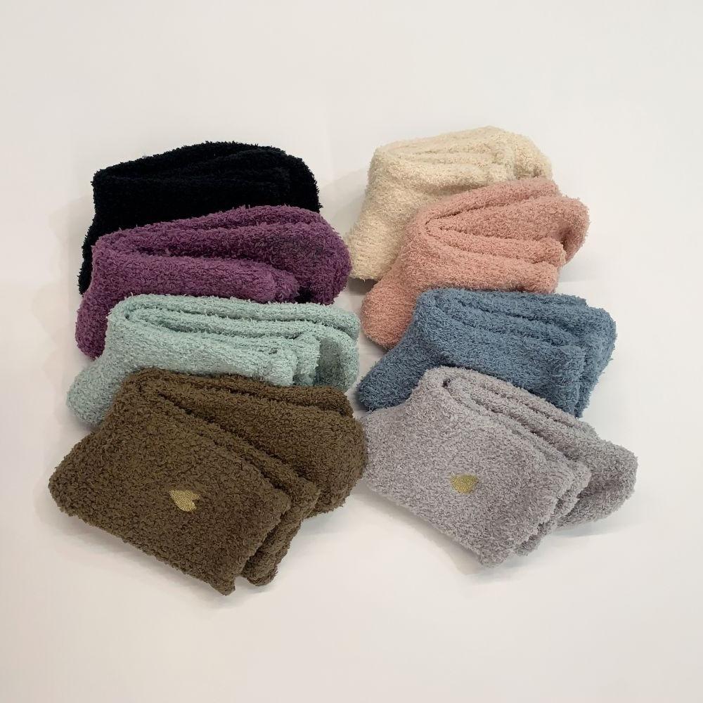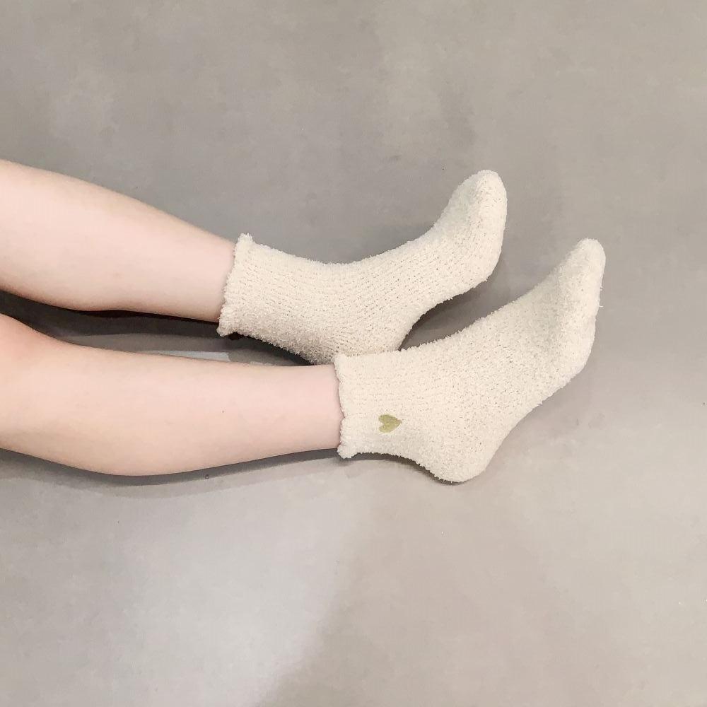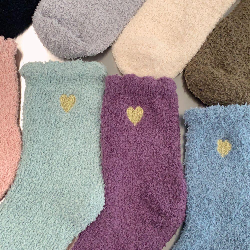 Calcetines gruesos de vellón coral hasta media pantorrilla, calcetines japoneses sencillos de algodón cálidos para el suelo, calcetines coloridos de color sólido bordados con amor para mujer