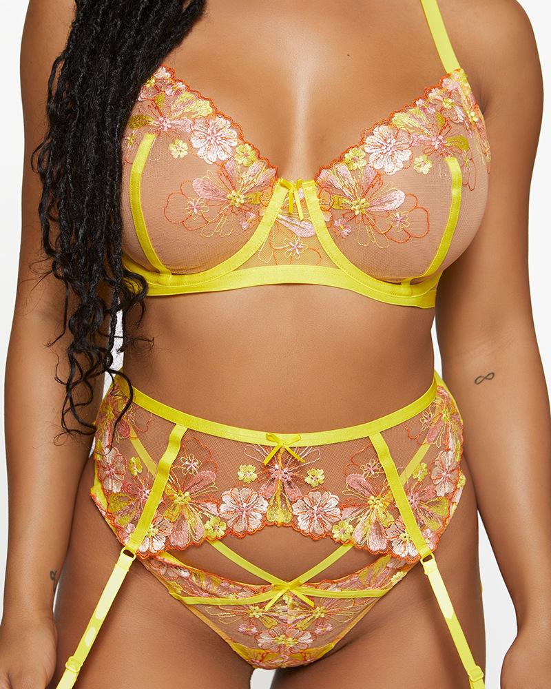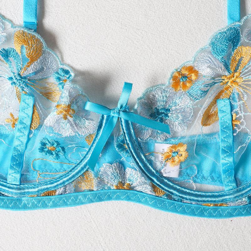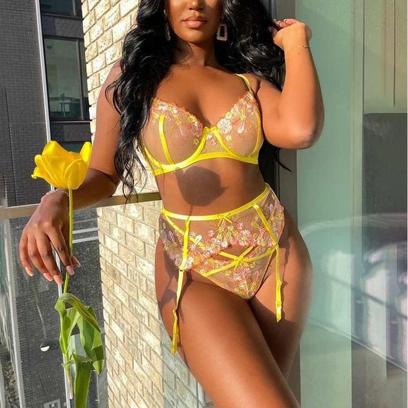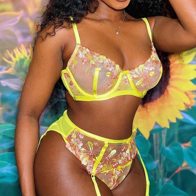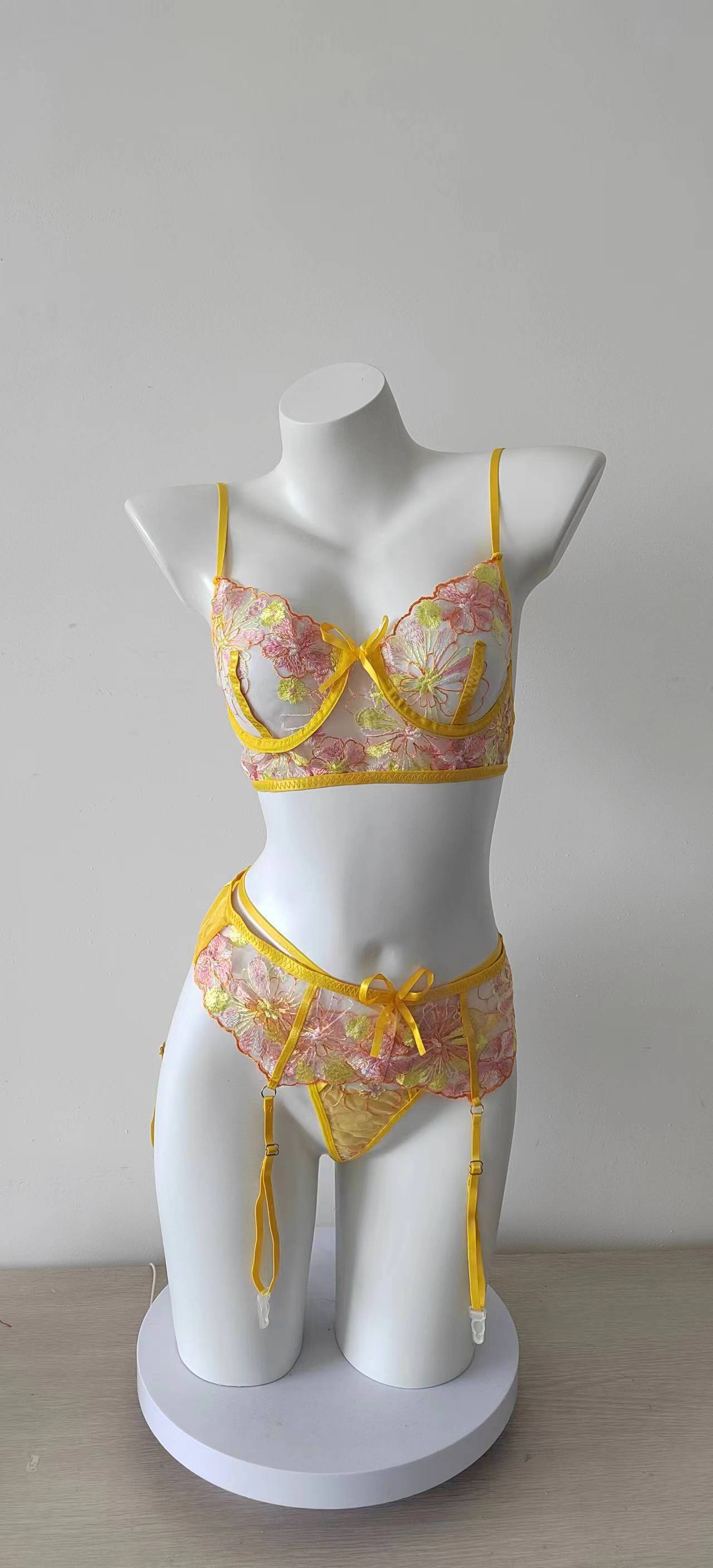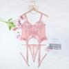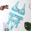 Artículos de Comercio Exterior Nuevo Sexy Malla Transparente Bordado Estampado Liguero Traje Sexy de Tres Piezas W526 con Aro de Acero