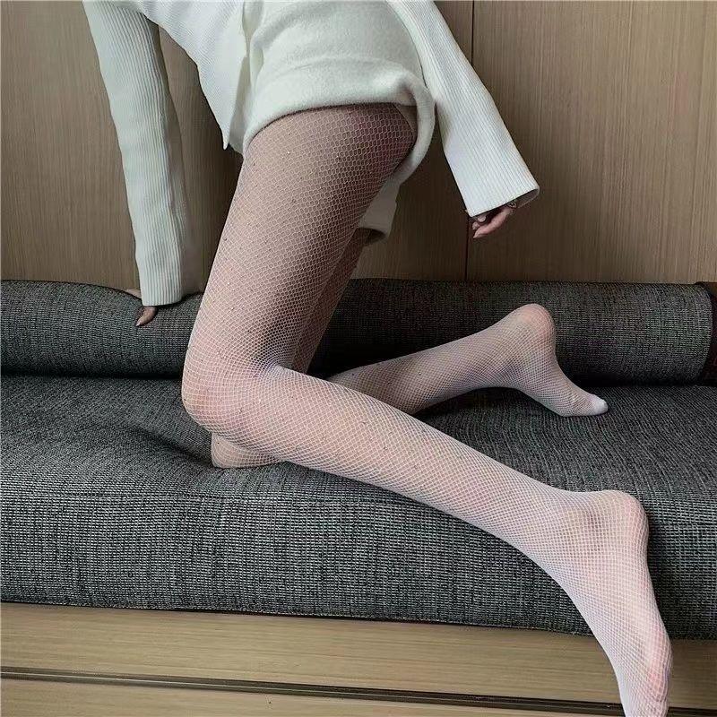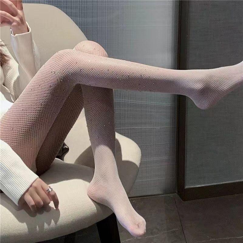 Medias negras brillantes con perforación caliente, medias negras finas para mujer, medias de rejilla sexys para primavera y verano con pantimedias populares de diamantes