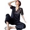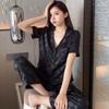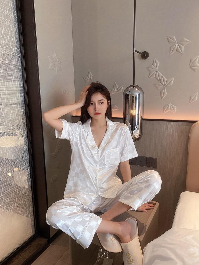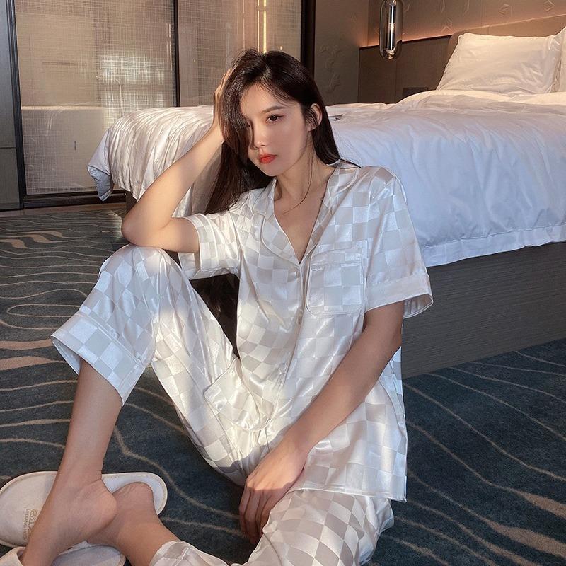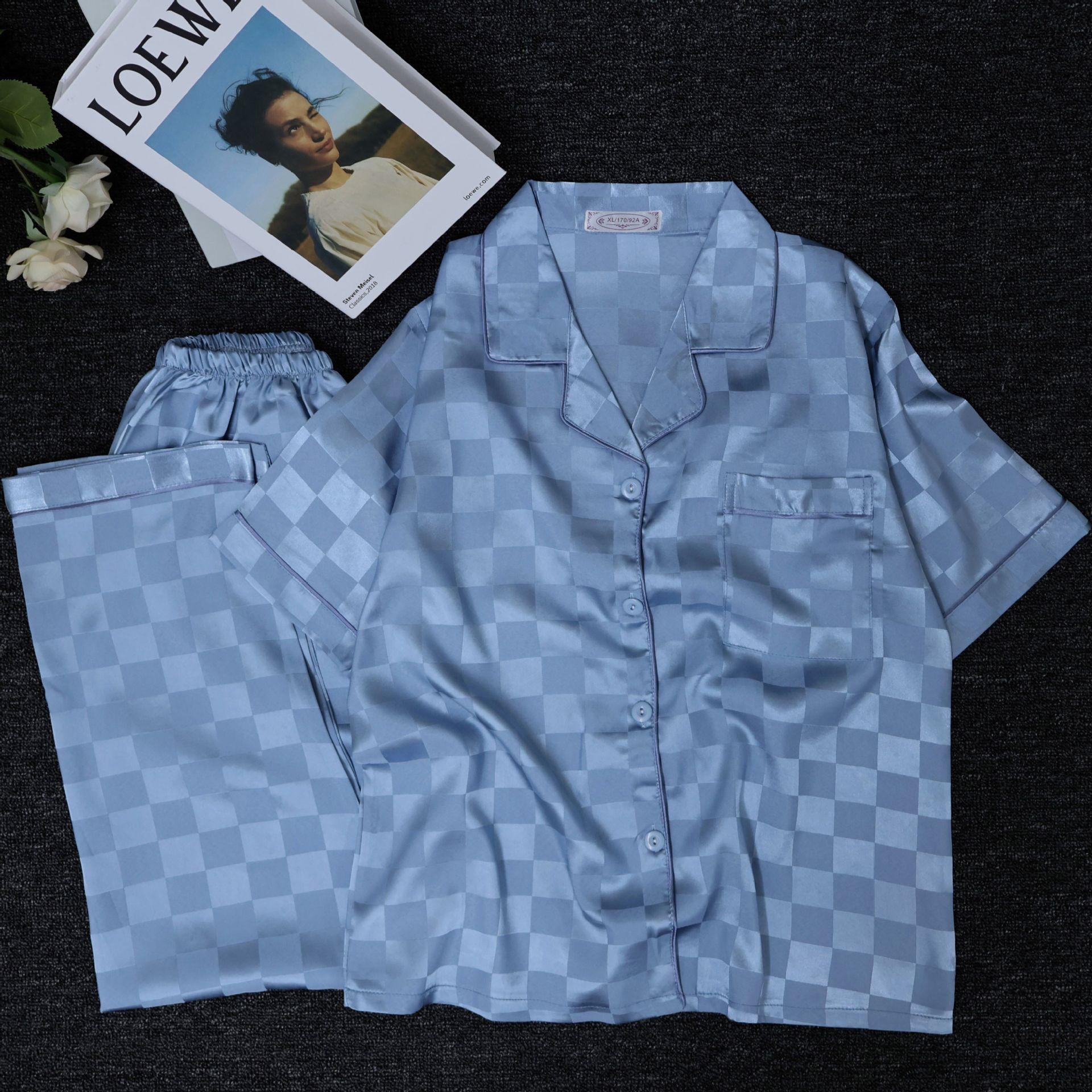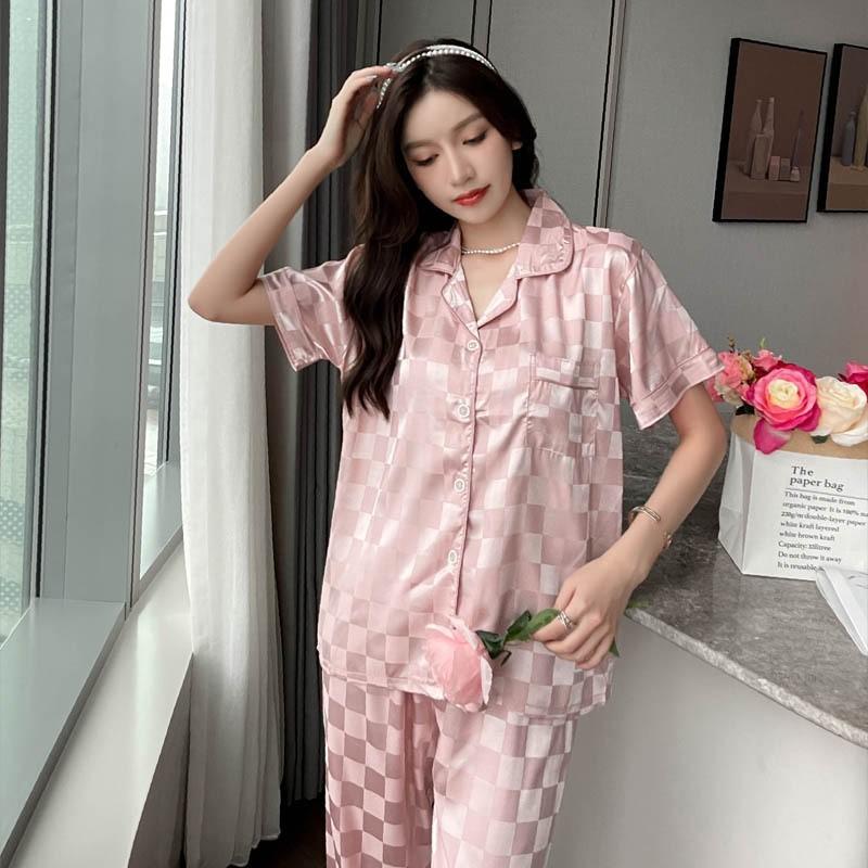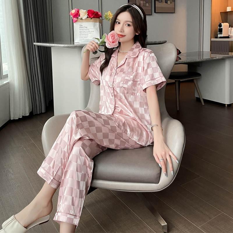Pijama Cuadrado de Verano de Seda de Hielo para Mujer Talla Grande Cárdigan de Alta Gama Moda Casual Pantalones de Manga Corta Conjunto para Estar en Casa