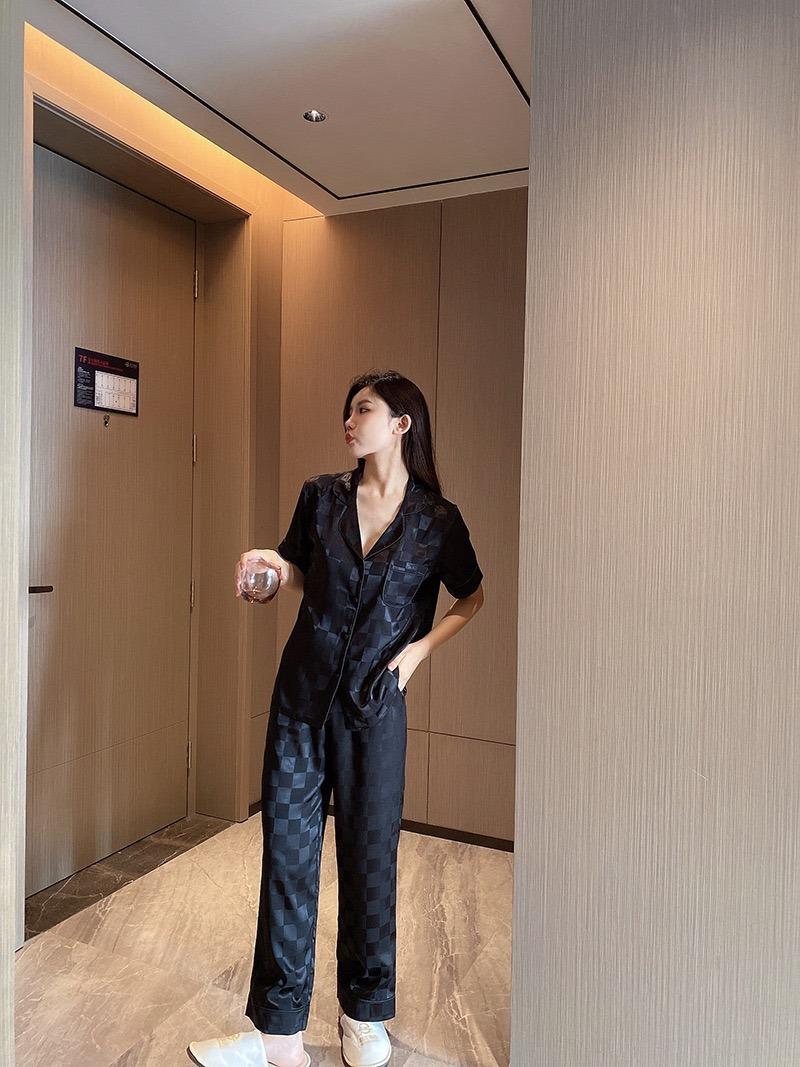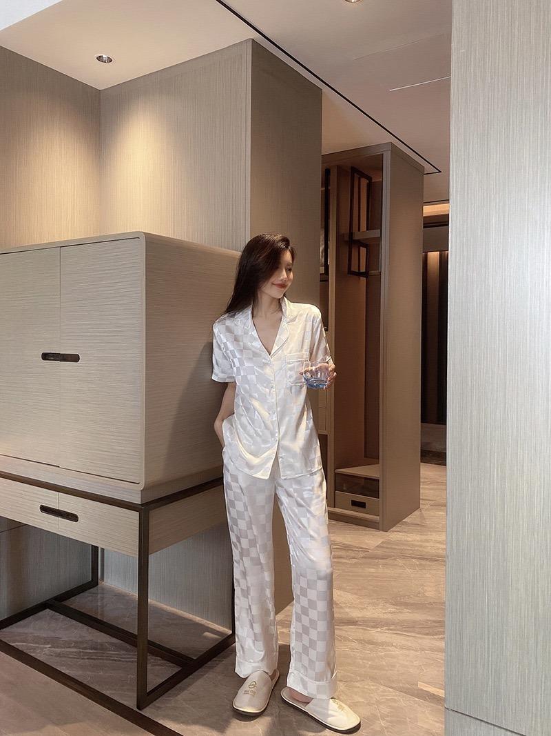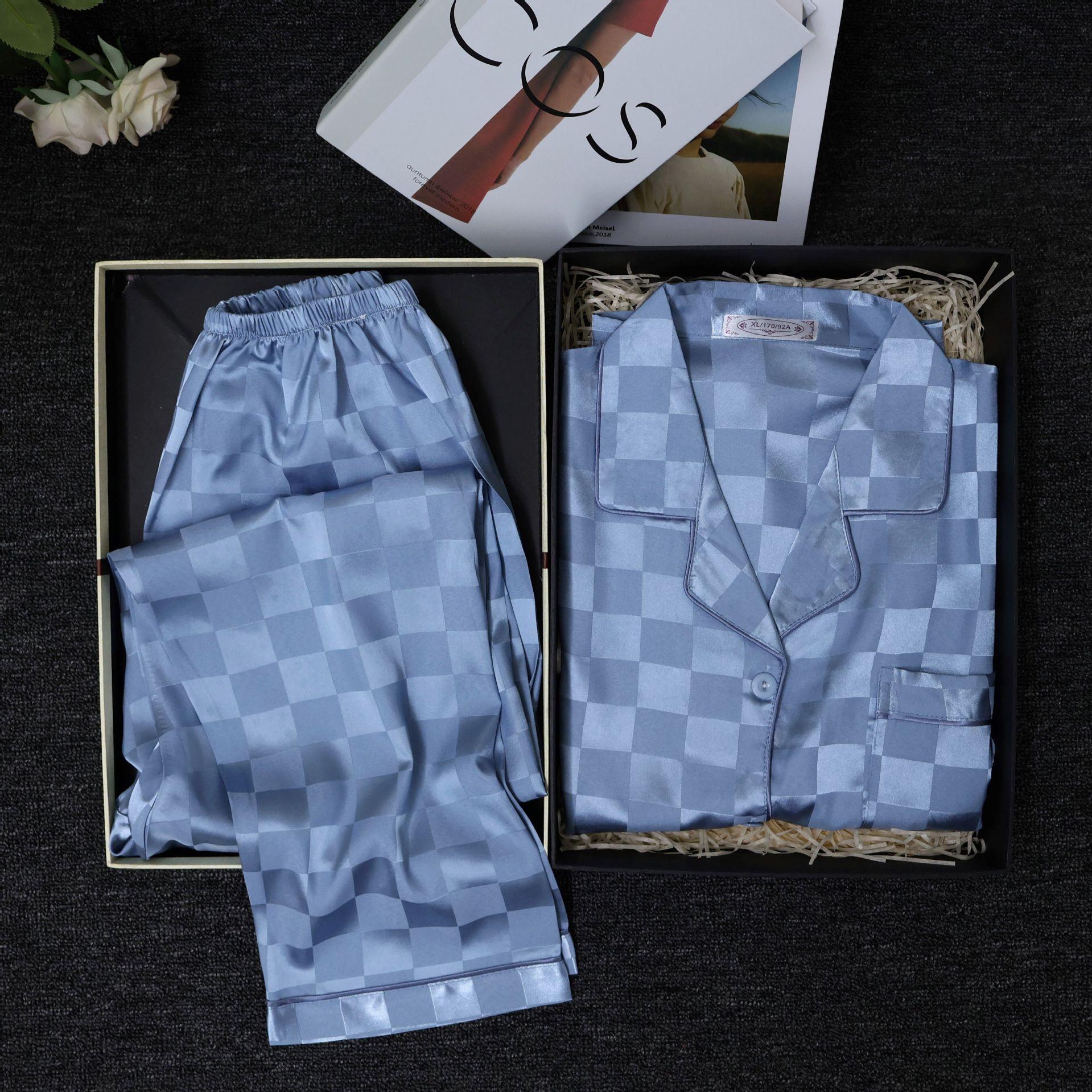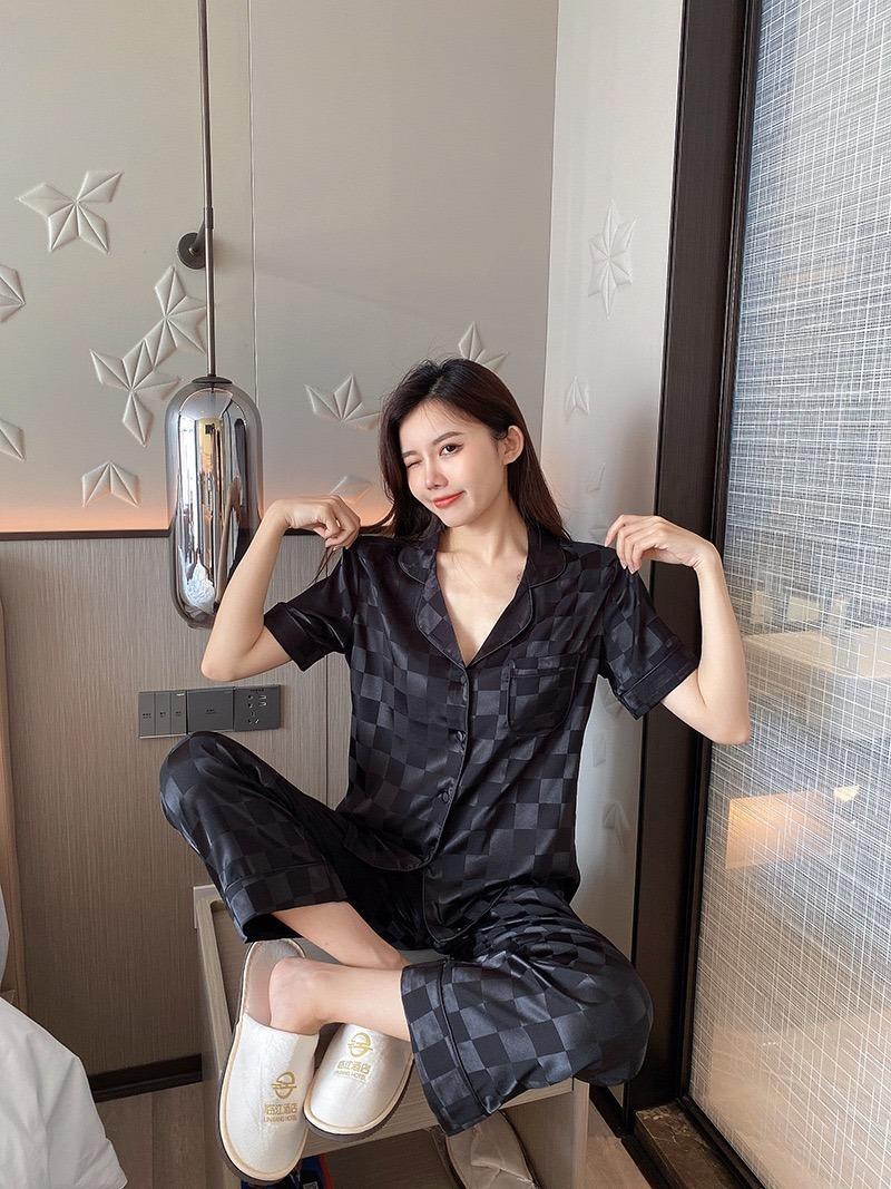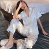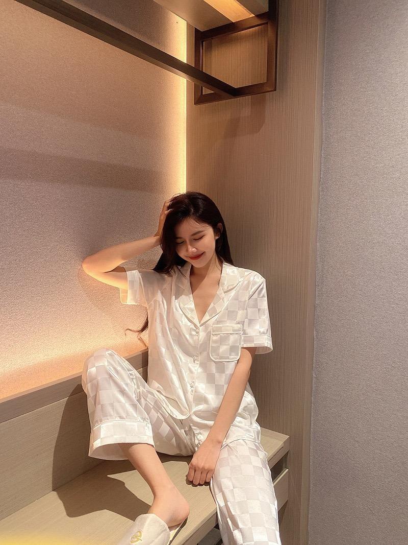 Pijama Cuadrado de Verano de Seda de Hielo para Mujer Talla Grande Cárdigan de Alta Gama Moda Casual Pantalones de Manga Corta Conjunto para Estar en Casa