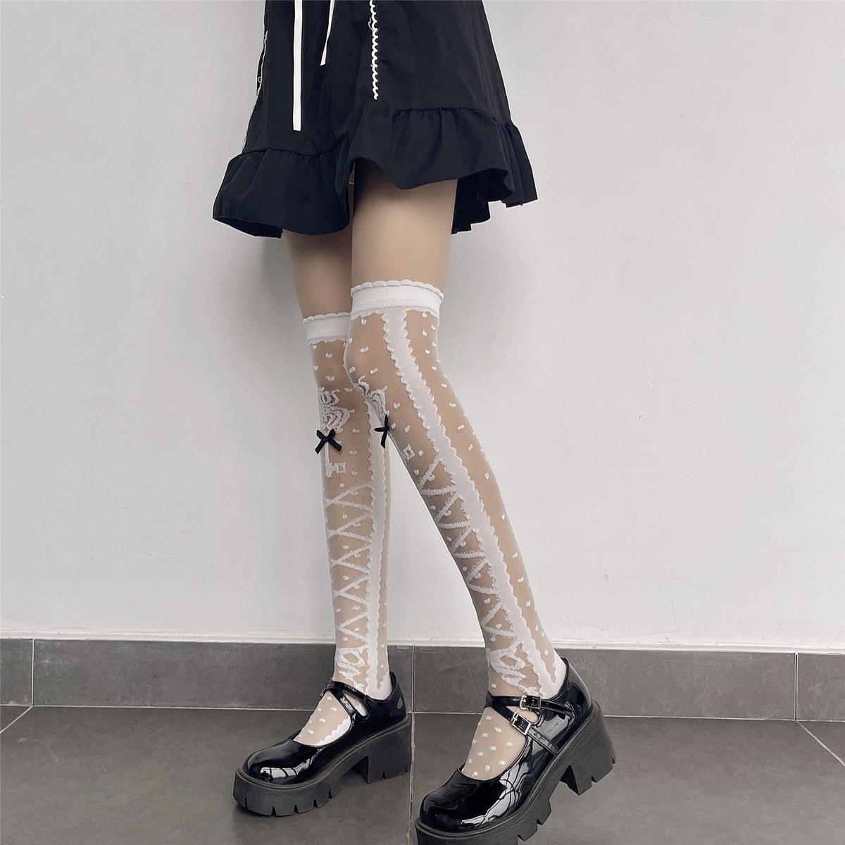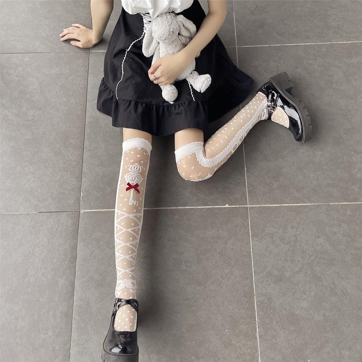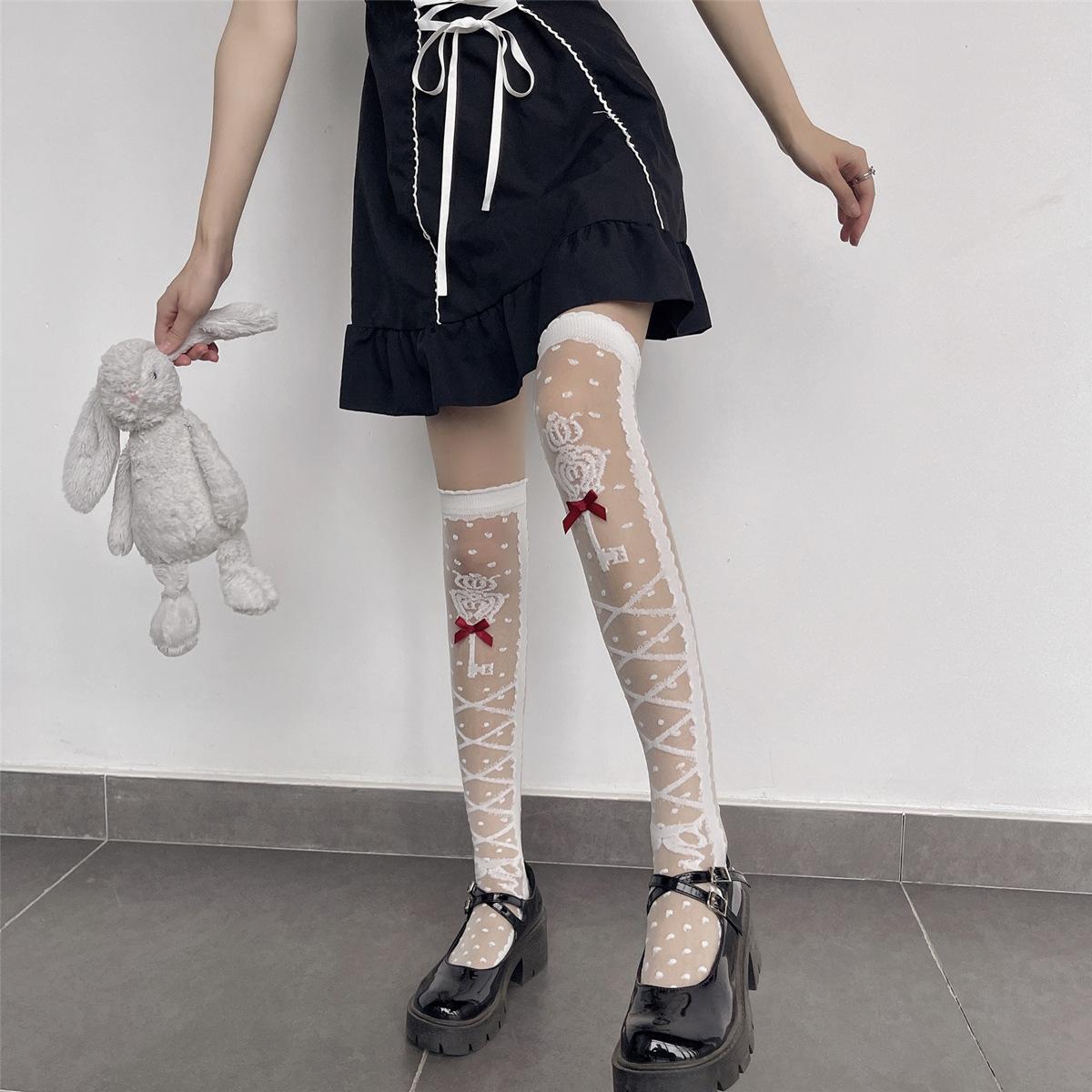 JK Lolita Princesa Hermana Suave Corona Blanca Hecho a Mano Lazo Correa Calcetines Altos hasta la Rodilla Jacquard Transparente Japonés