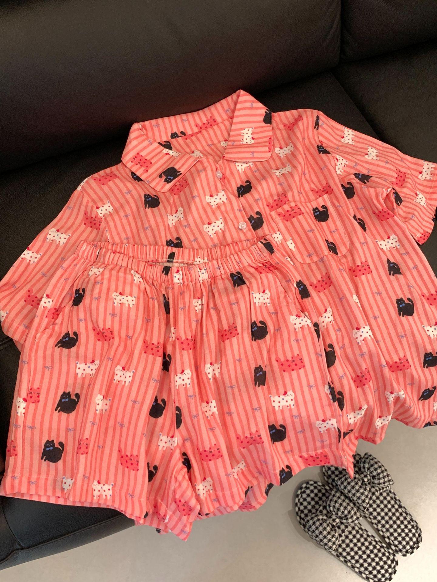 Pink Stripe Wave Dot Cat (Short Sleeve Shorts)