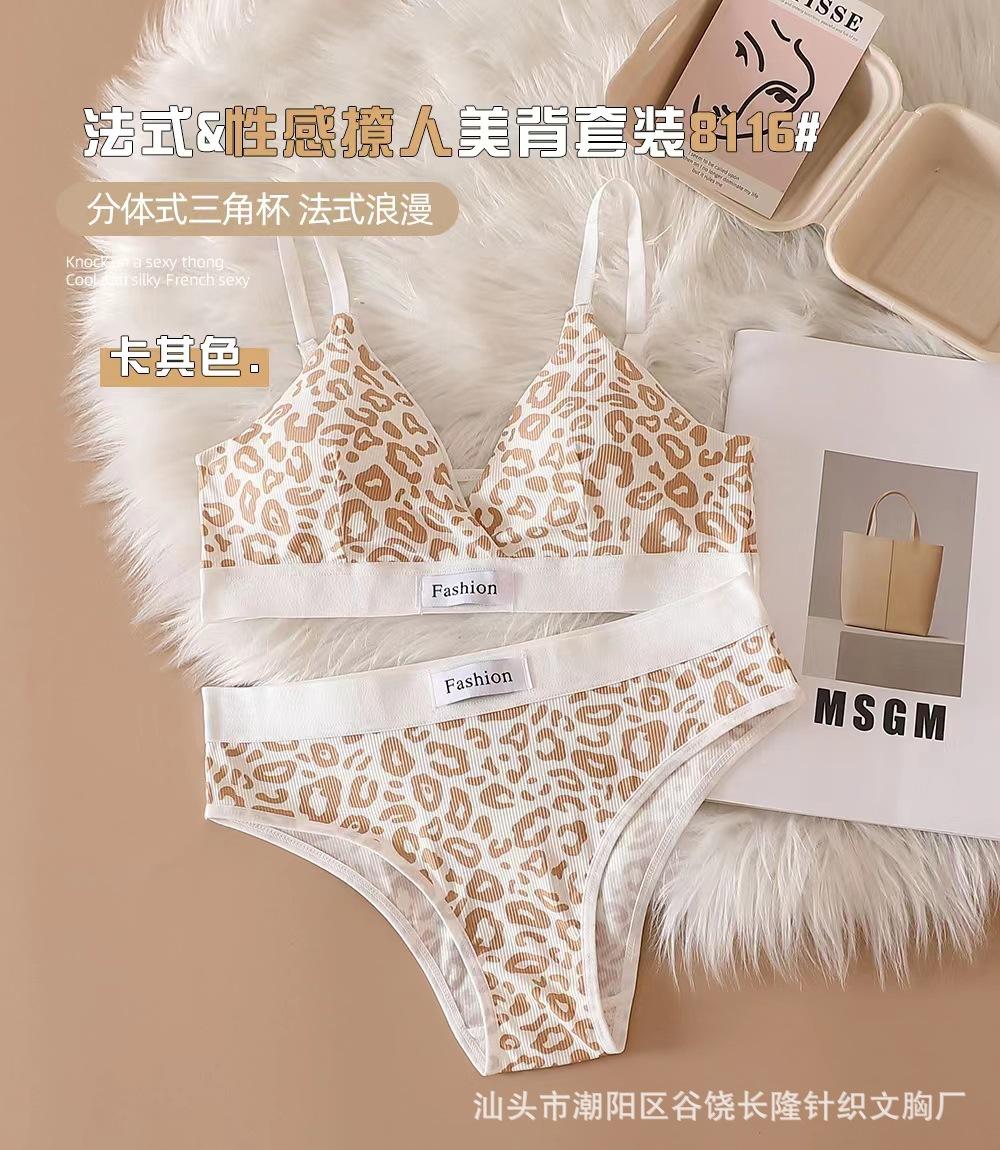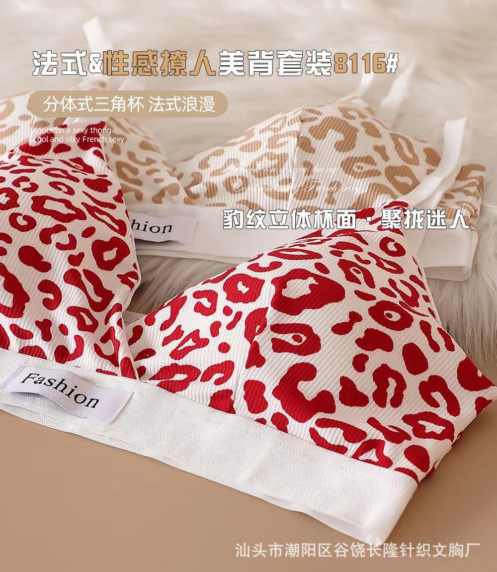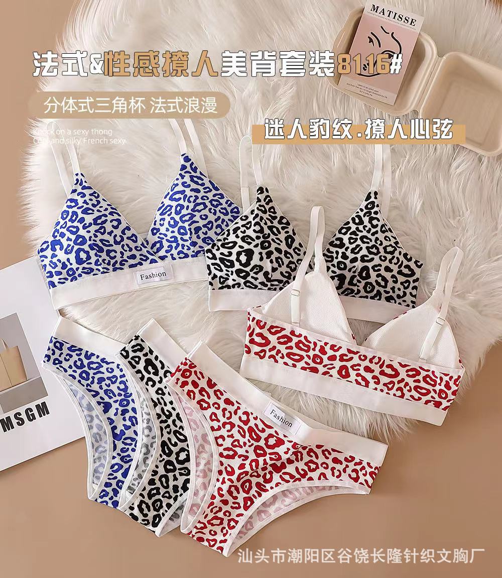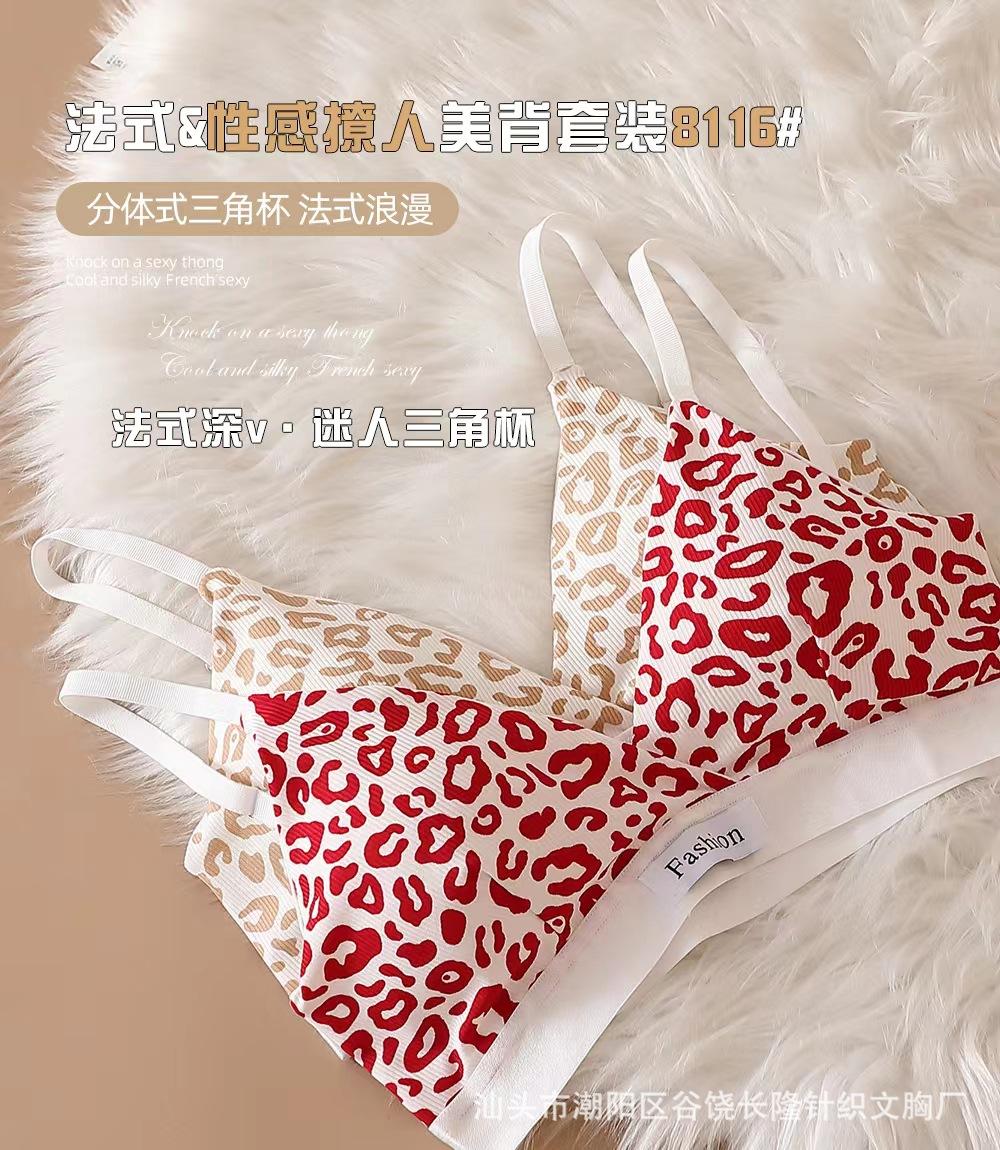 Conjunto de Lencería Sexy con Estampado de Leopardo Francés, Copa Triangular con Escote en V Profundo, Espalda Hermosa, Sujetador Fino Sin Varillas, Conjunto de Lencería, Exportación de Lencería