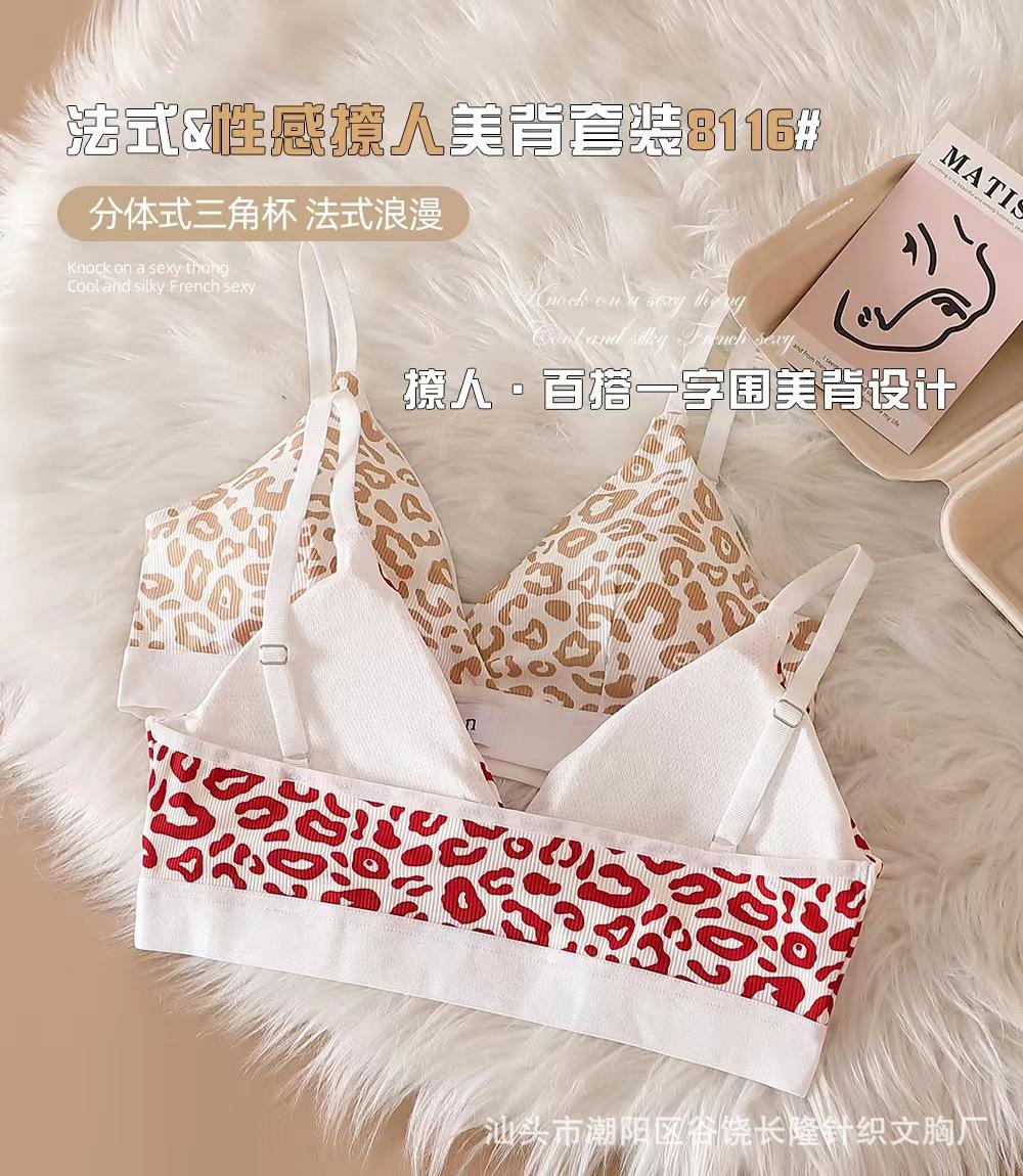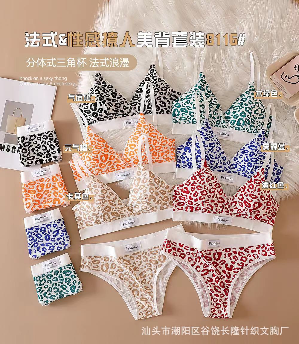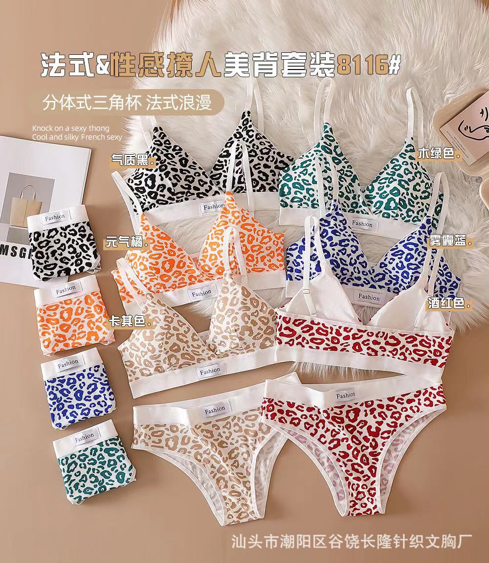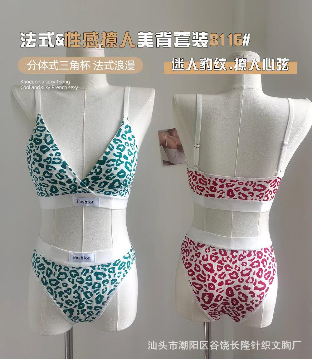 Conjunto de Lencería Sexy con Estampado de Leopardo Francés, Copa Triangular con Escote en V Profundo, Espalda Hermosa, Sujetador Fino Sin Varillas, Conjunto de Lencería, Exportación de Lencería