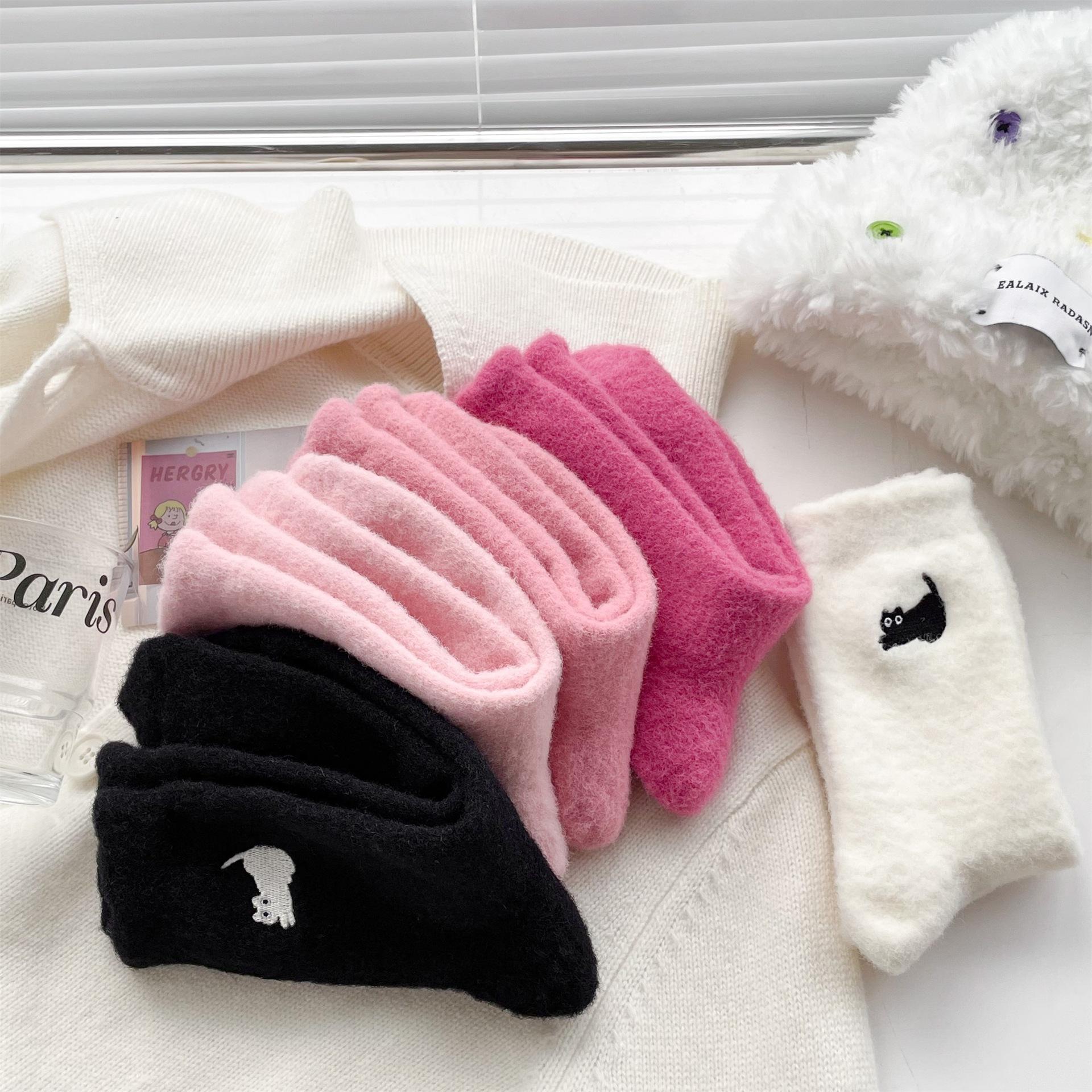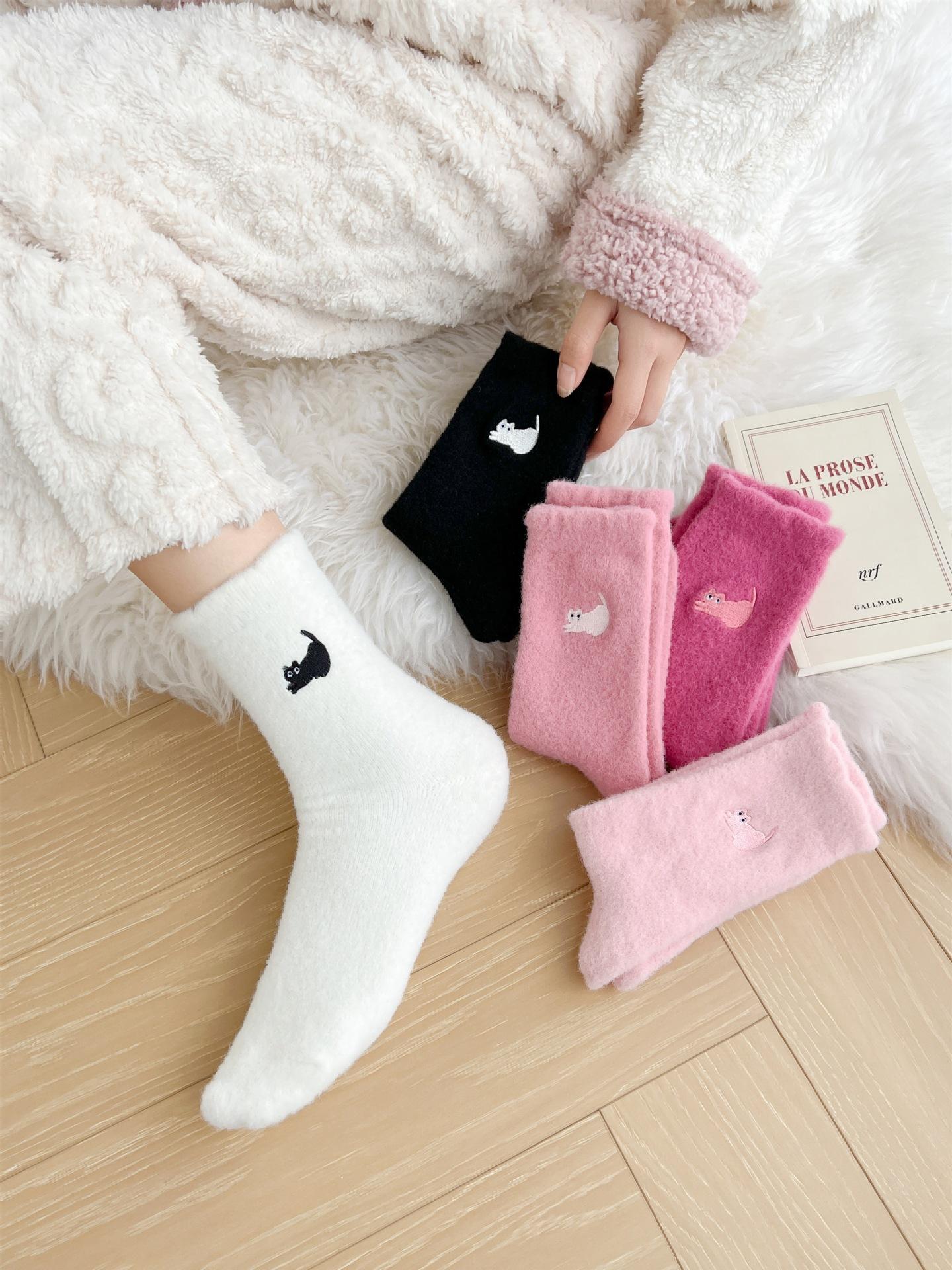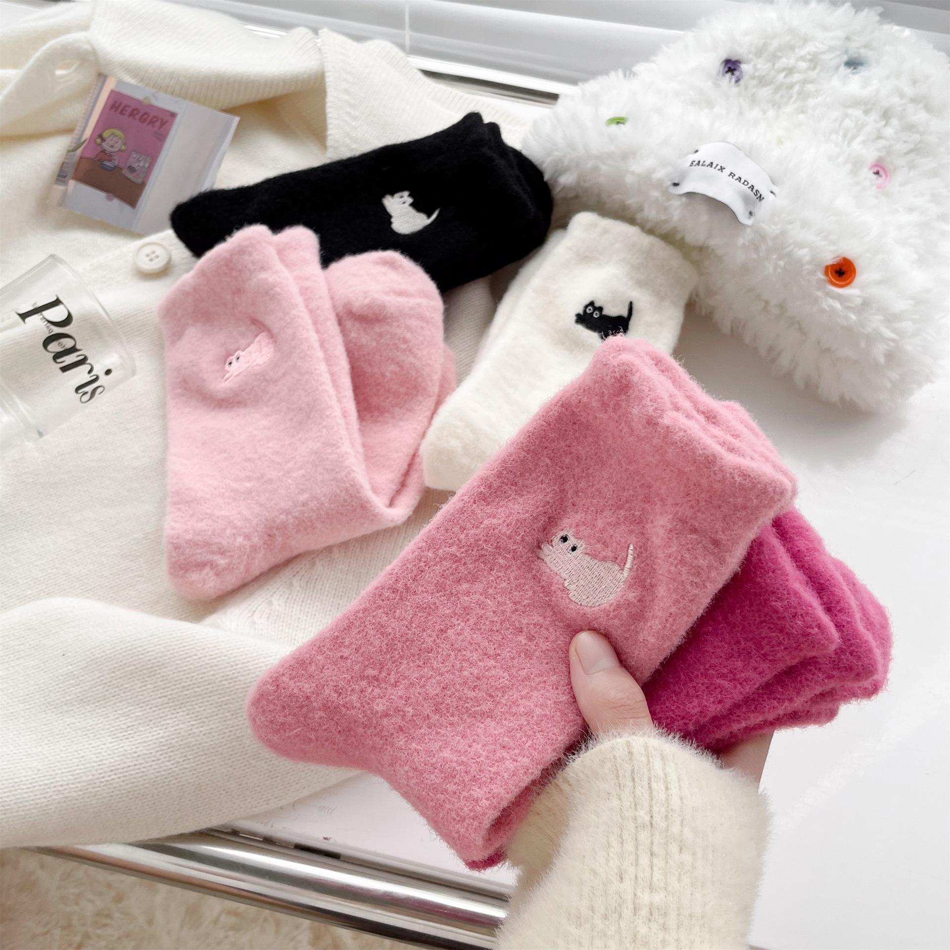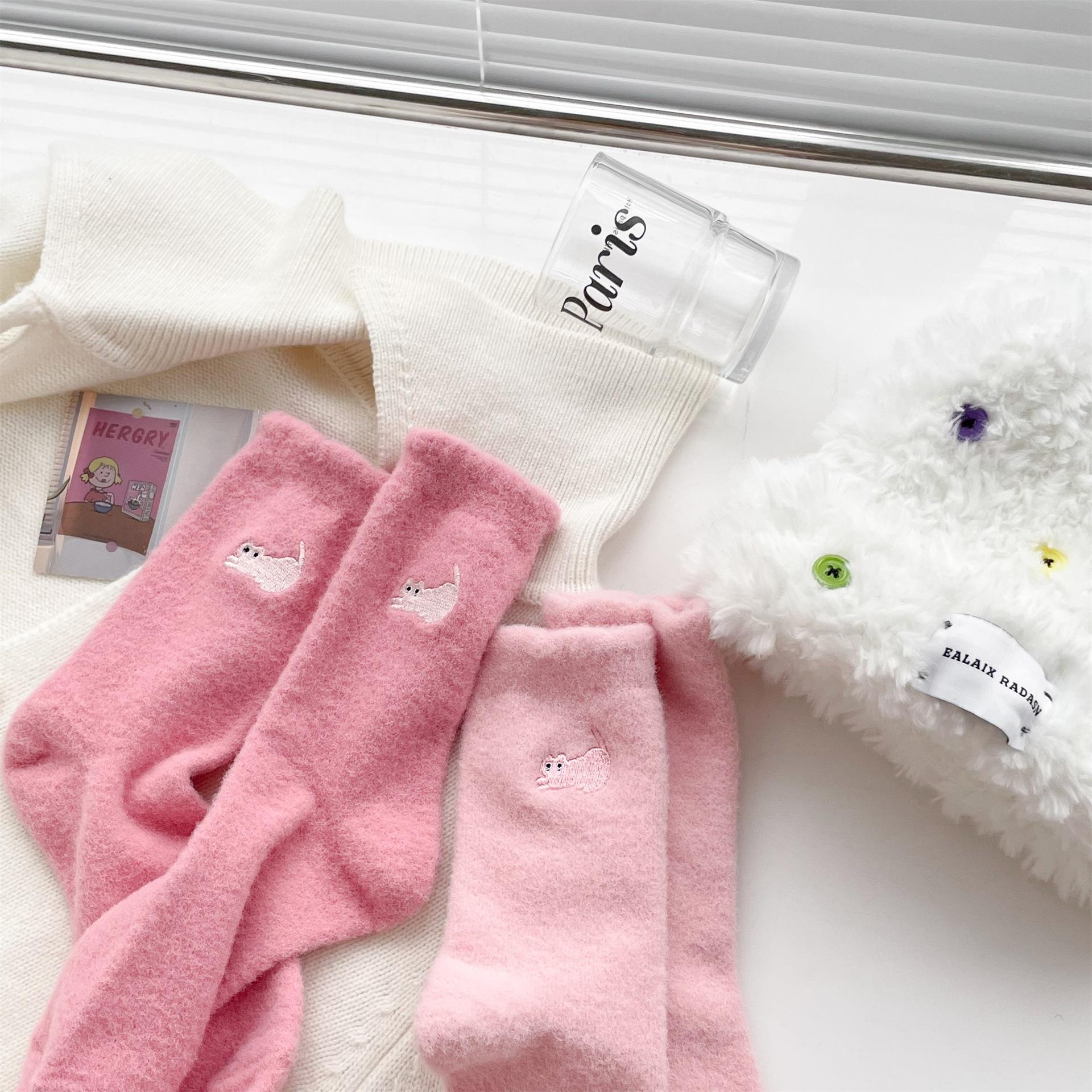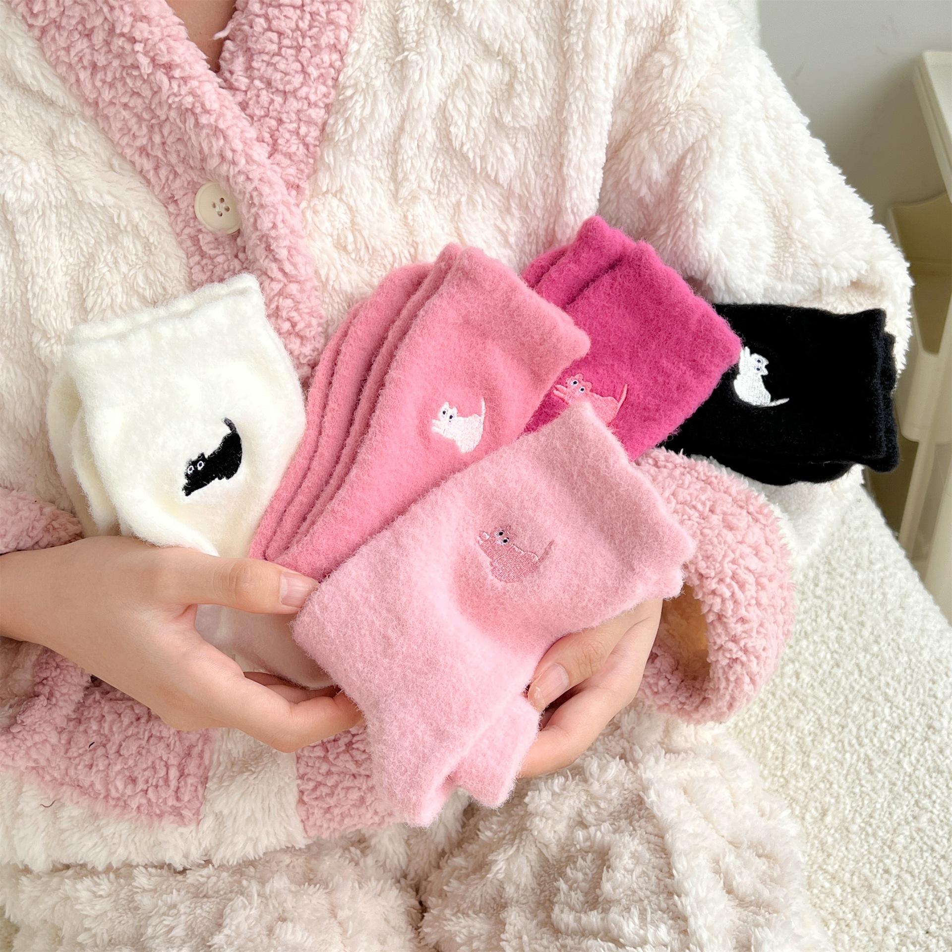 Calcetines de otoño e invierno para mujer, de terciopelo rosa cálido, gruesos y cálidos, con bonitos calcetines japoneses con bordado de gato.