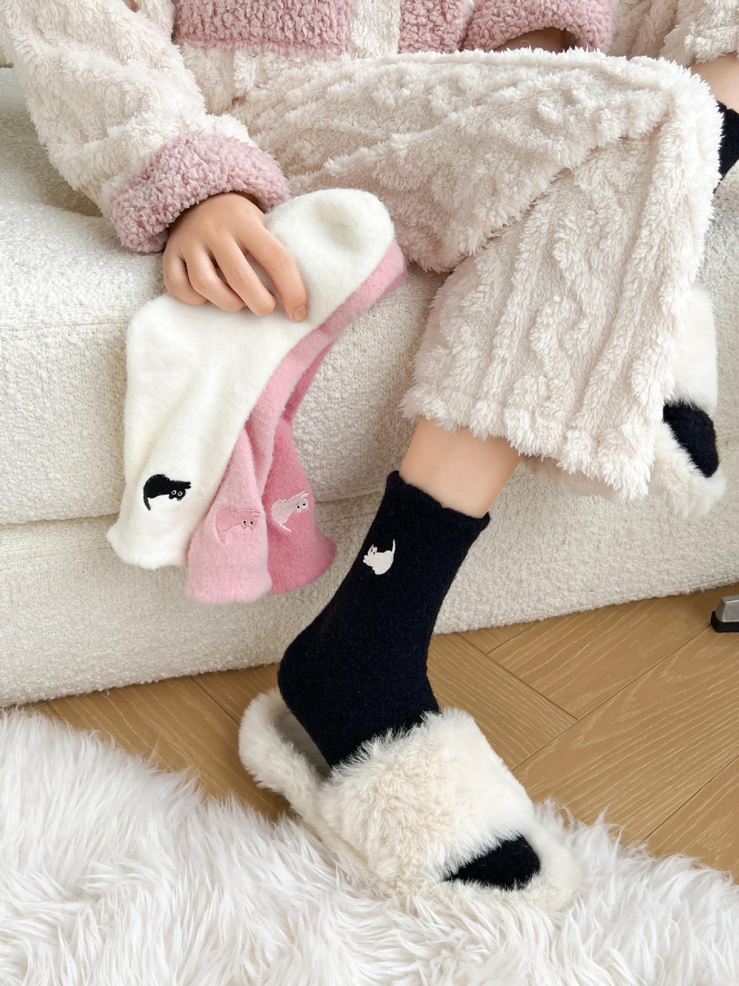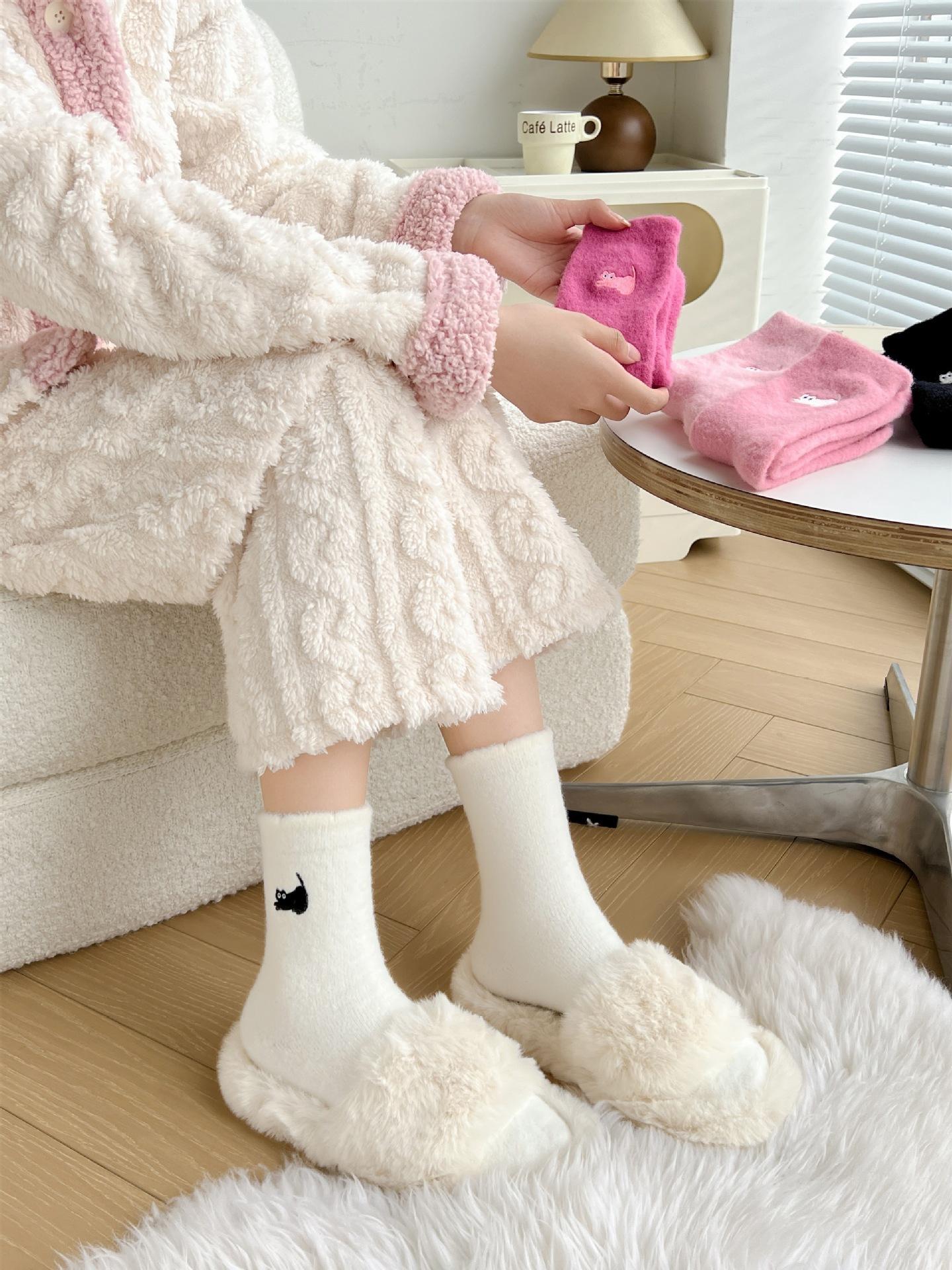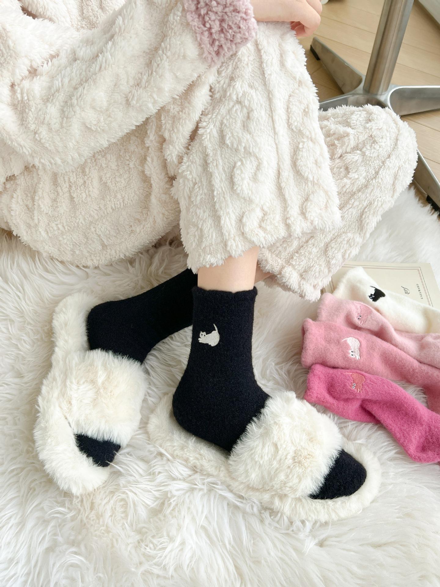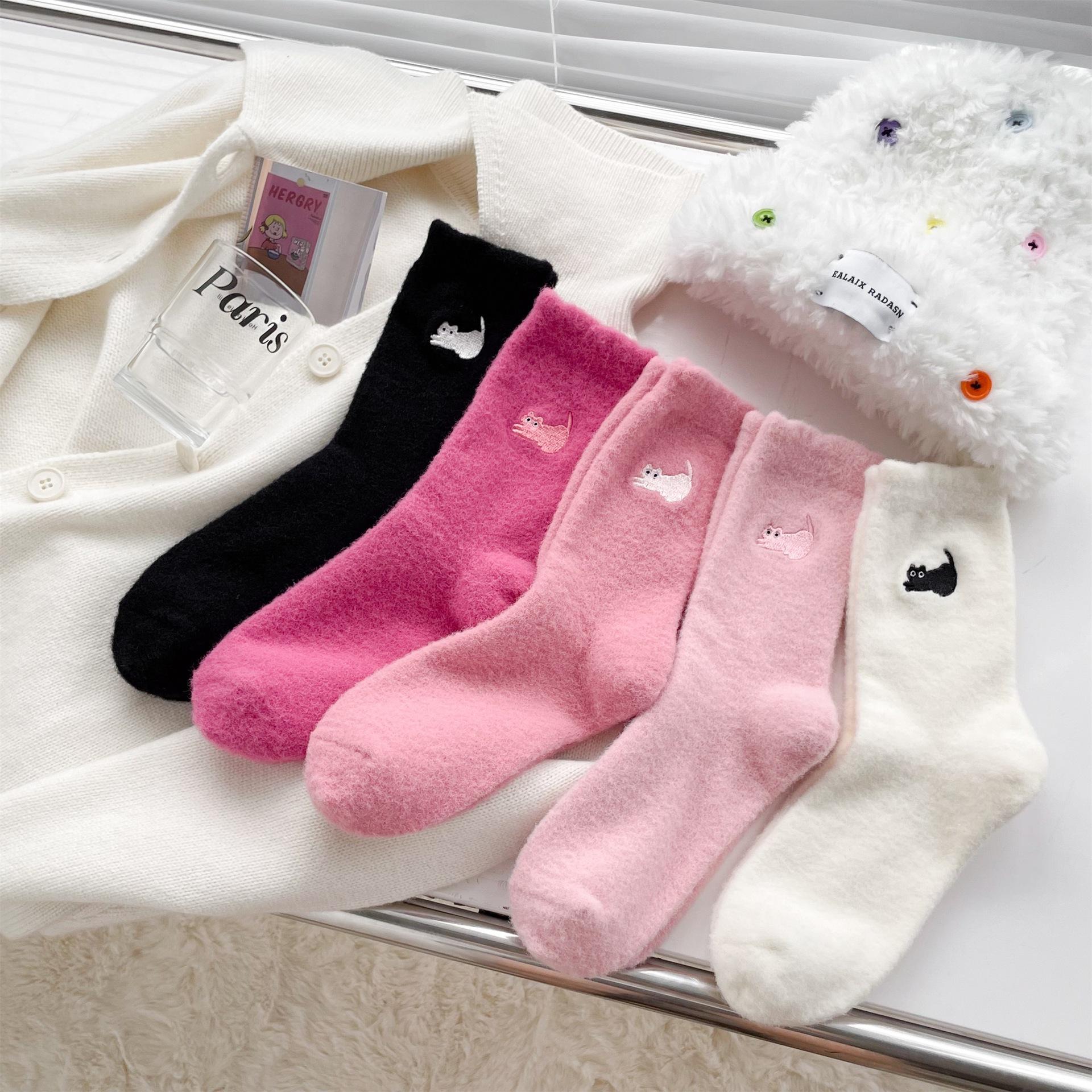 Calcetines de otoño e invierno para mujer, de terciopelo rosa cálido, gruesos y cálidos, con bonitos calcetines japoneses con bordado de gato.