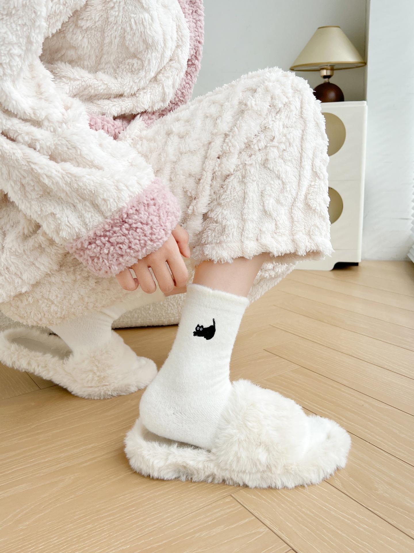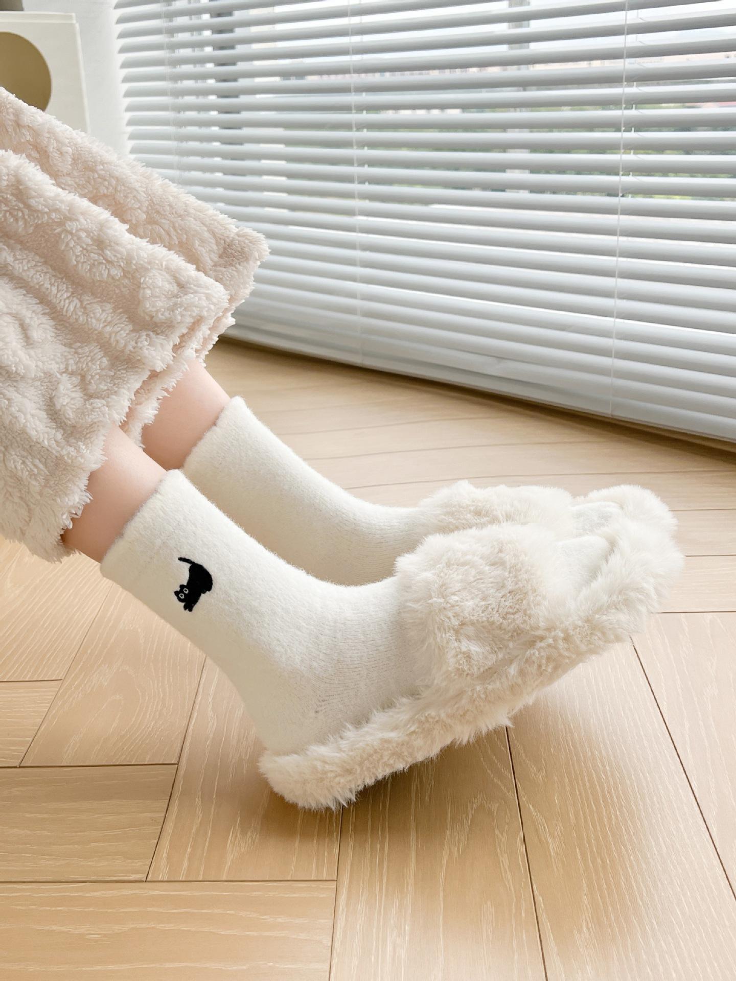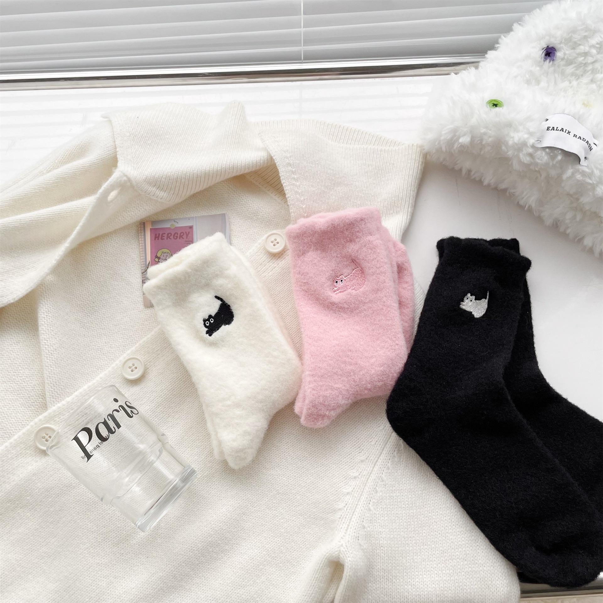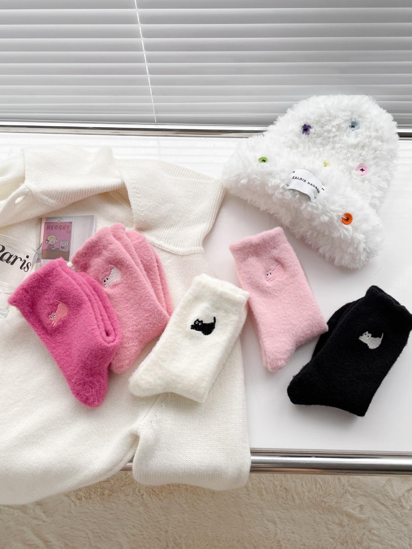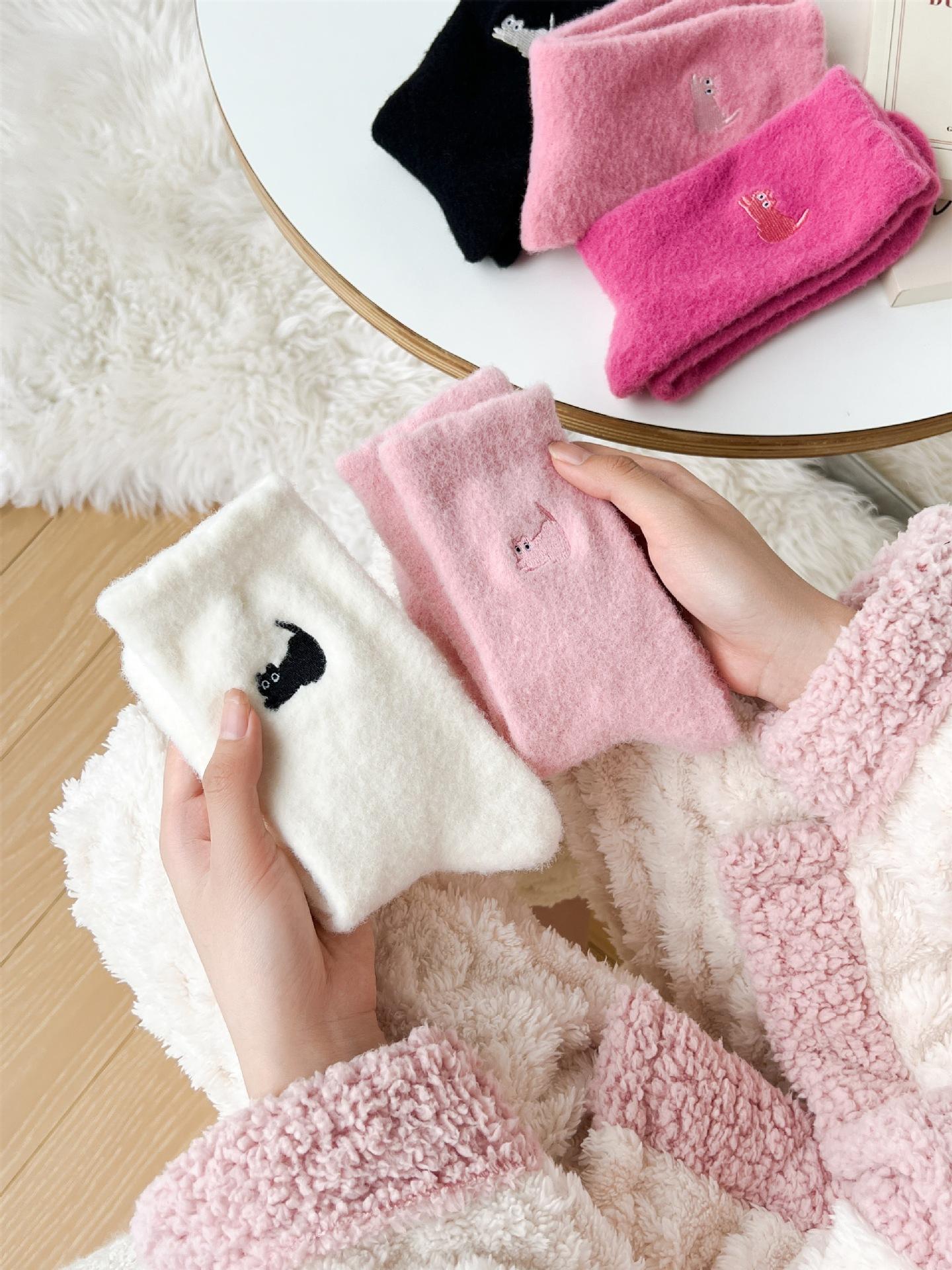 Calcetines de otoño e invierno para mujer, de terciopelo rosa cálido, gruesos y cálidos, con bonitos calcetines japoneses con bordado de gato.