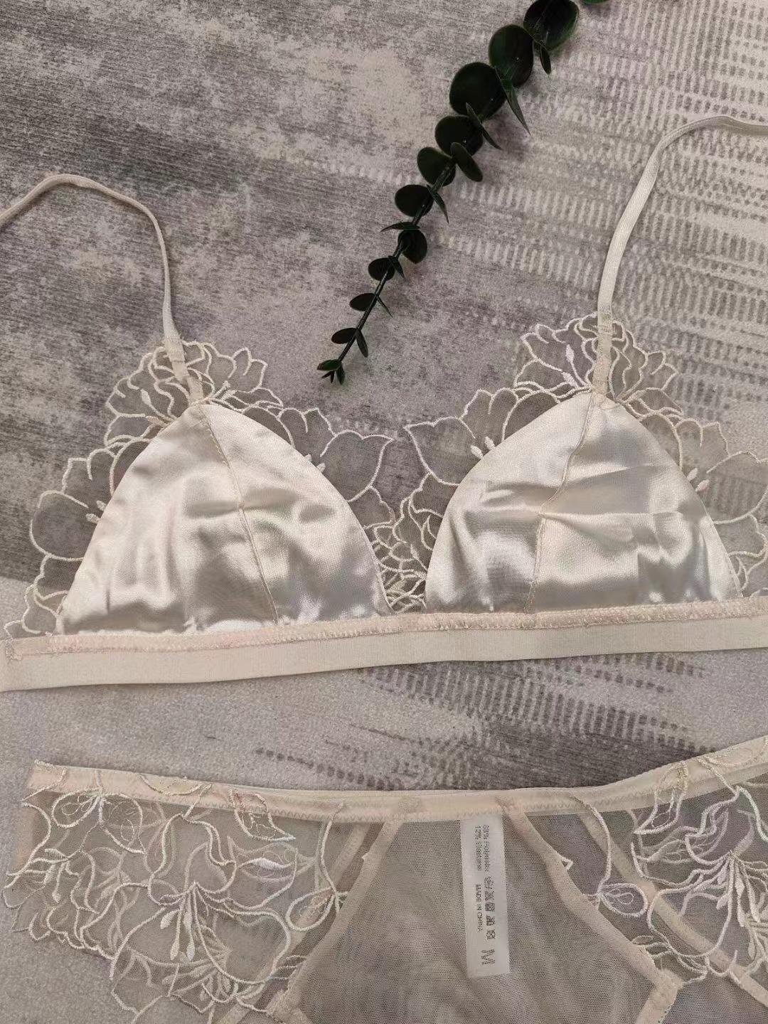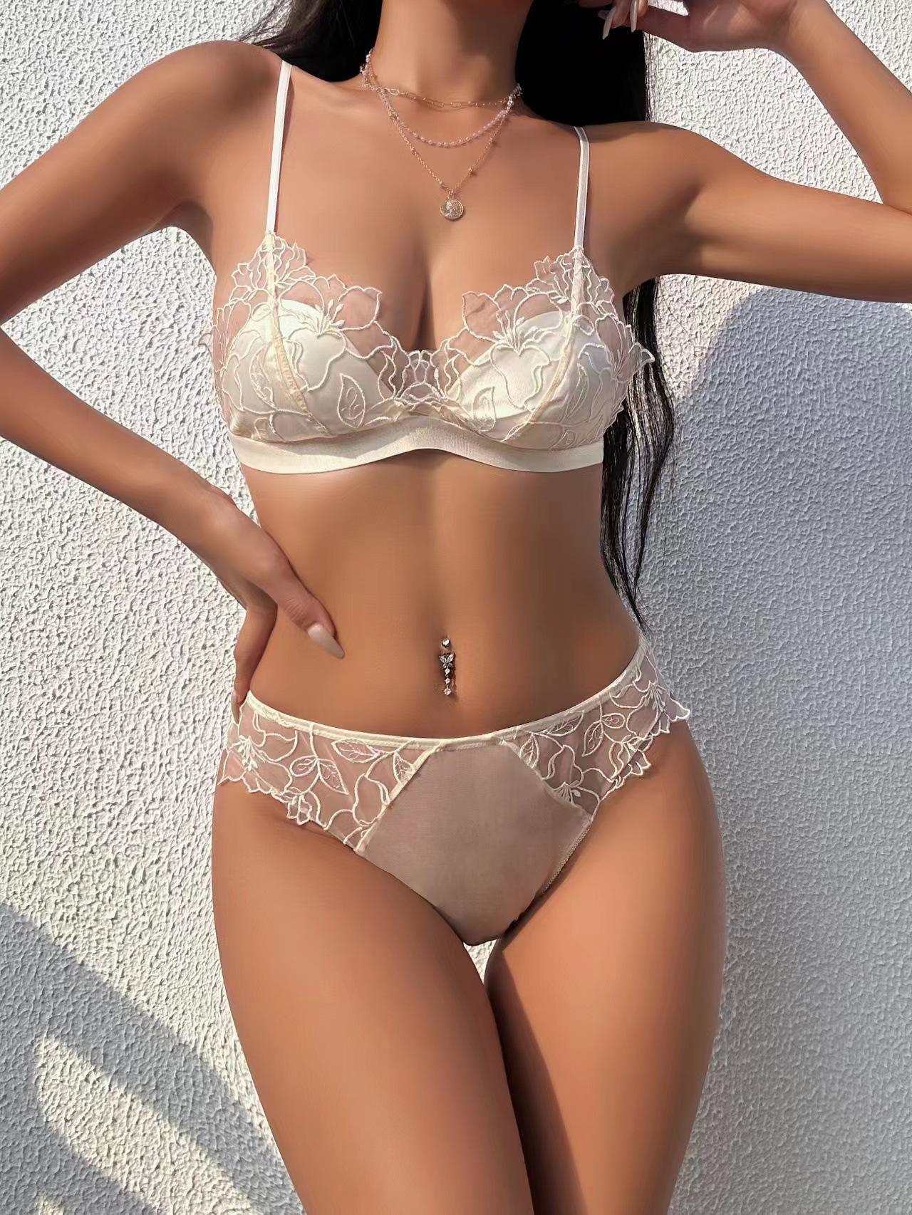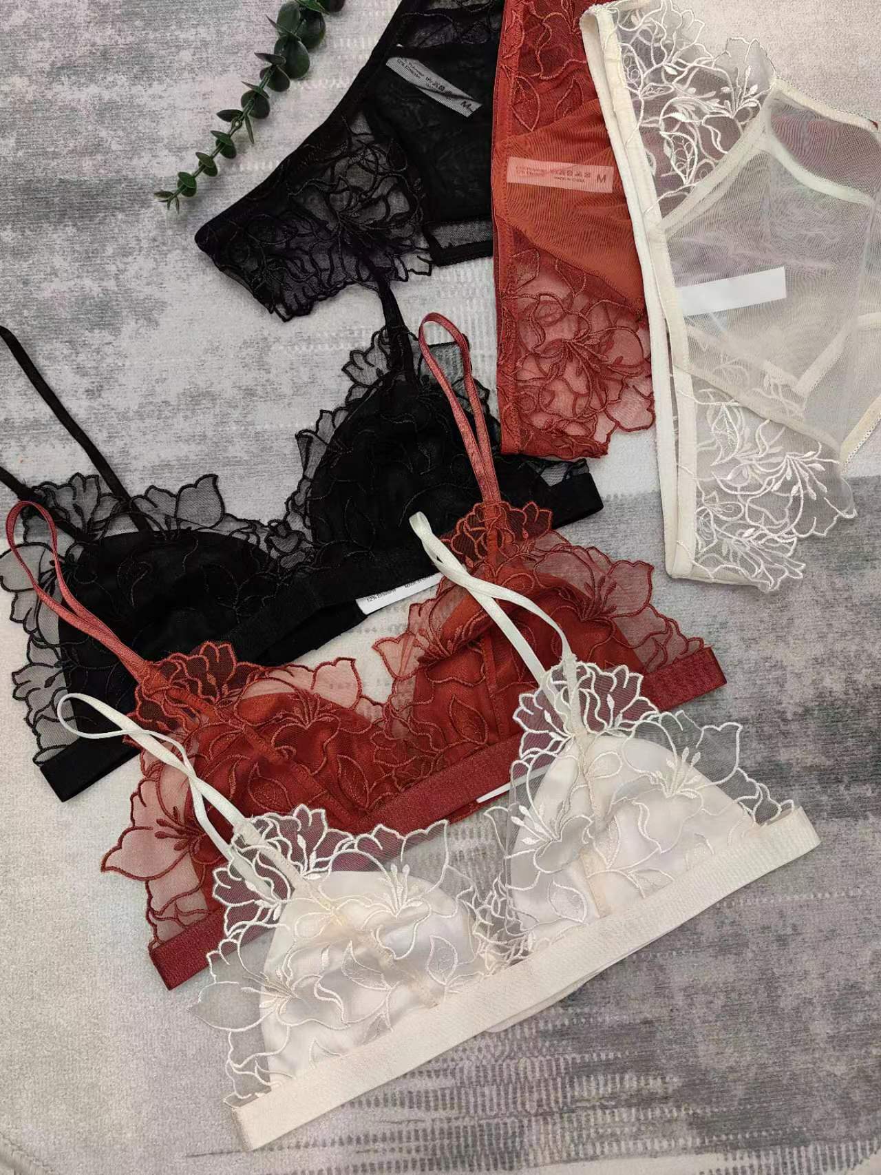 Lencería sexy transfronteriza de verano, lencería bordada de malla con perspectiva ultrafina, conjunto de sujetador antiflacidez pequeño con pecho grande |
