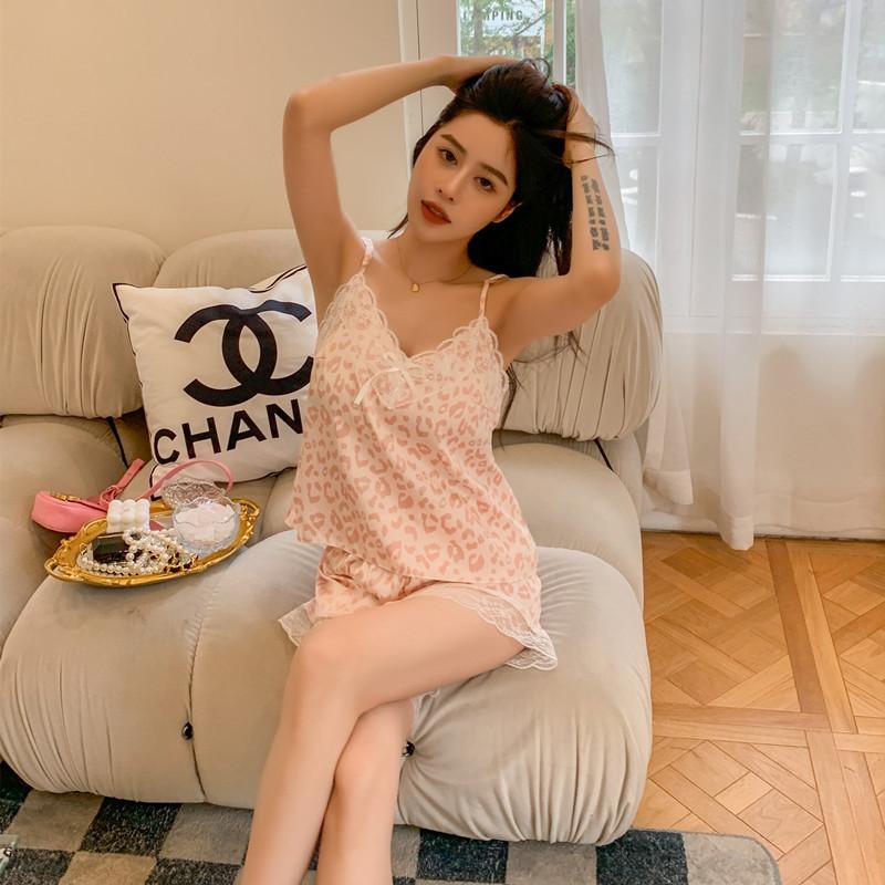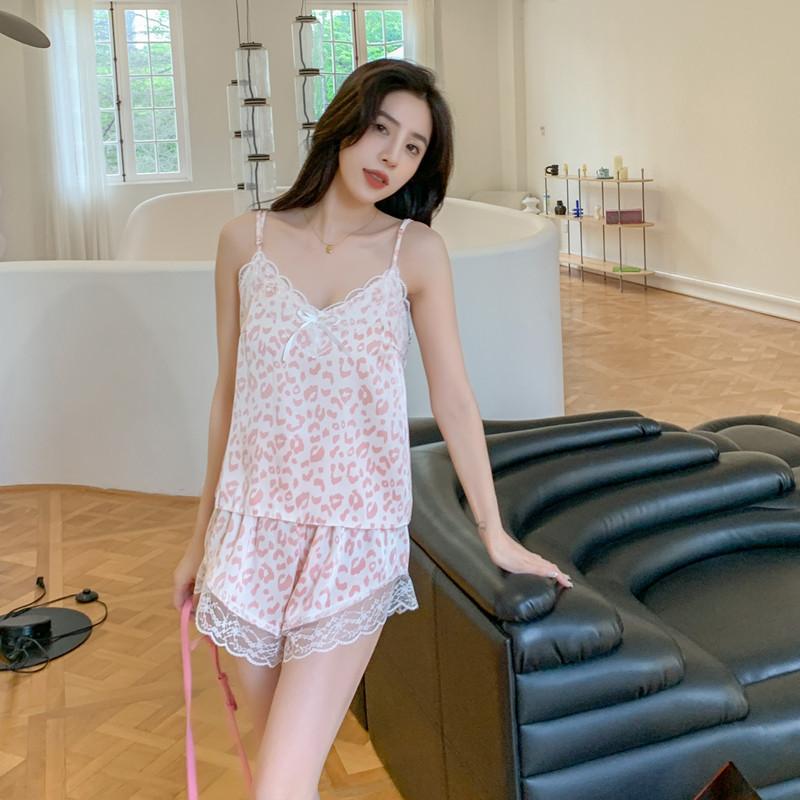 Pijama de verano para mujer, de seda helada, con tirantes y pantalones cortos, conjunto de dos piezas con estampado de encaje dulce y estampado de leopardo, ropa fina para el hogar