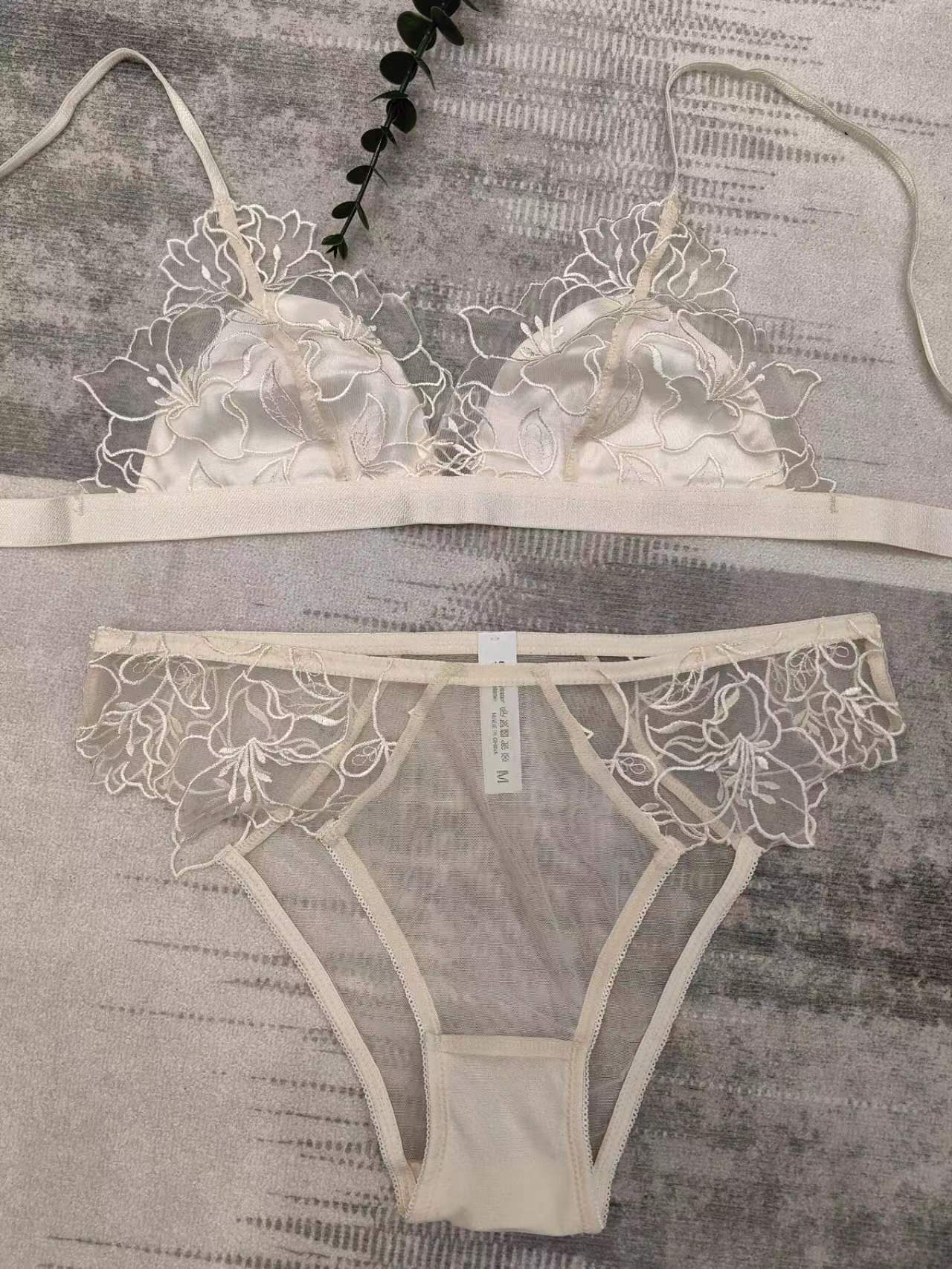 Lencería Sexy Europea y Americana Francesa Ultradelgada Transparente Encaje Bordado Brasier Busto Grande Luce Más Pequeño Conjunto de Lencería Talla Grande