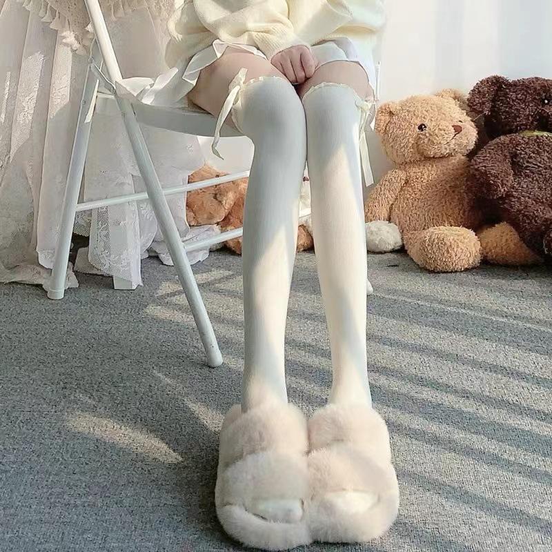 Calcetines hasta el muslo estilo japonés Lolita College, calcetines blancos de encaje por encima de la rodilla, medias de algodón de color liso con lazo para mujer