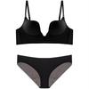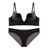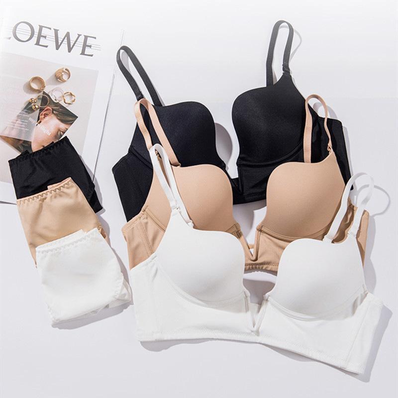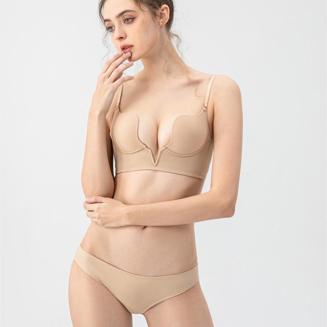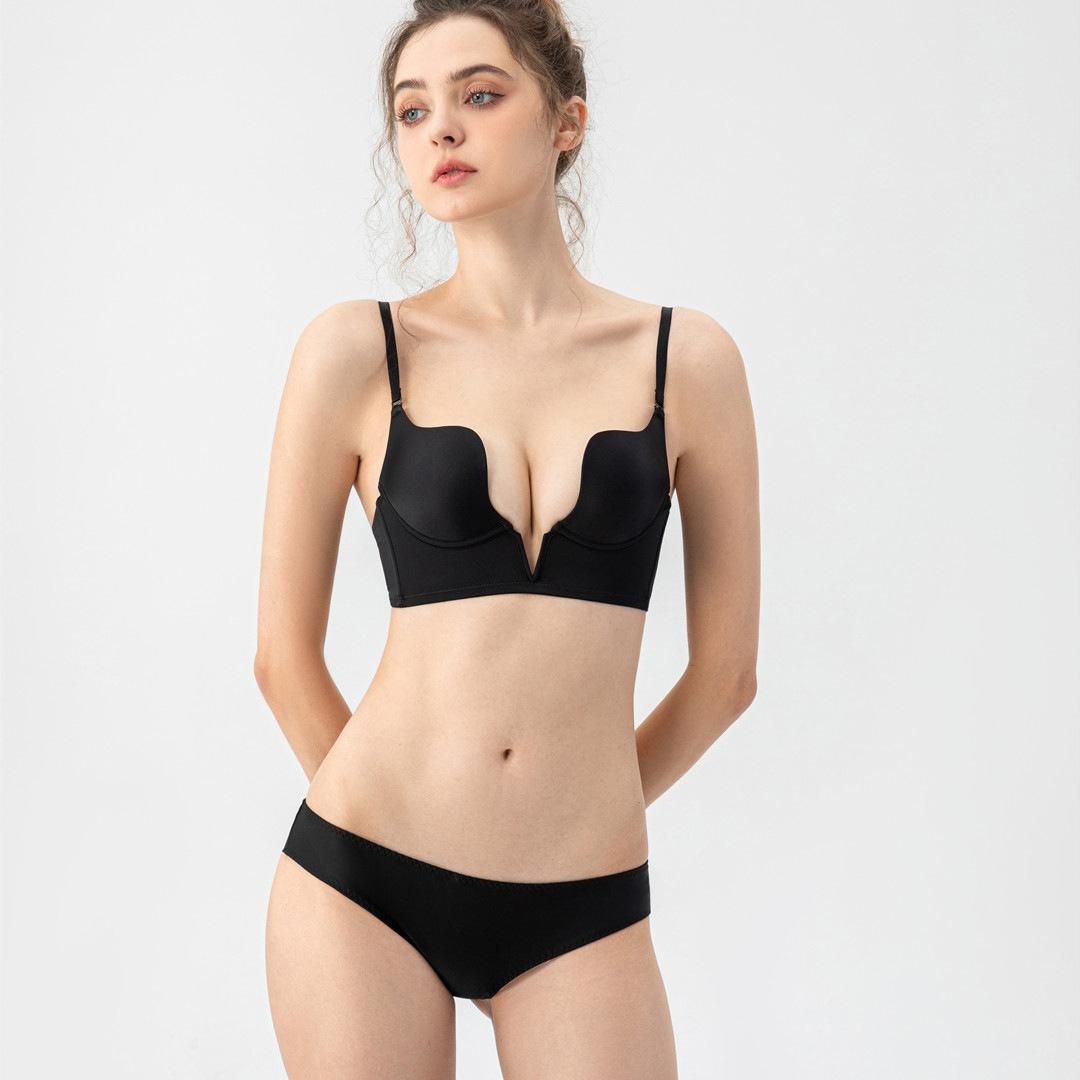 Íntimos Sexy Brillantes Sin Costuras Escote en V Profundo Espalda Hermosa Sujetador Negro Pecho Pequeño Push-Up Anticaída Set de Sujetador
