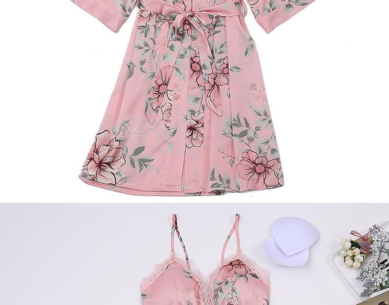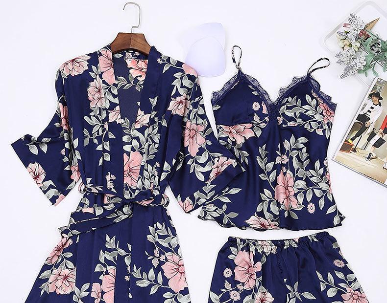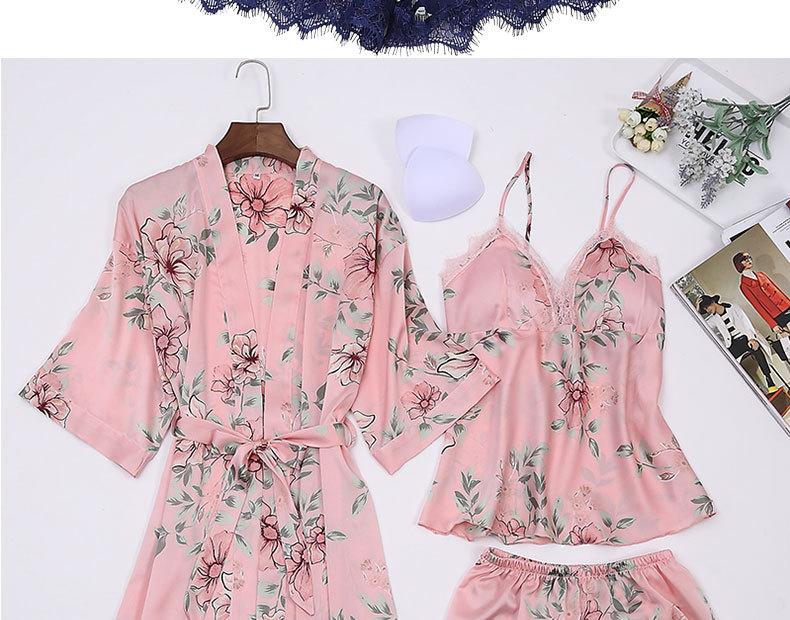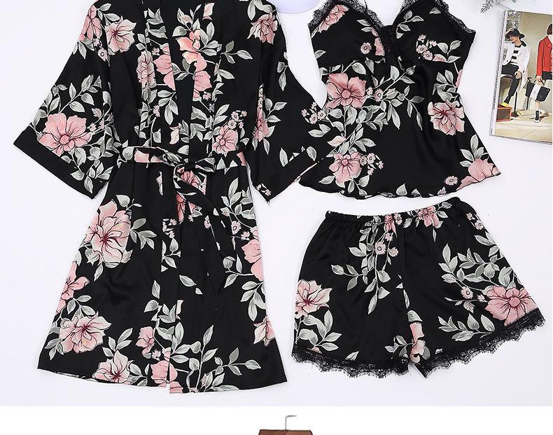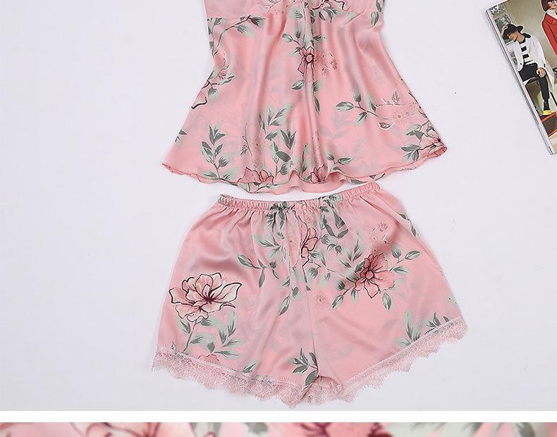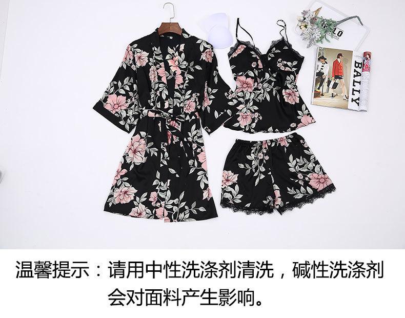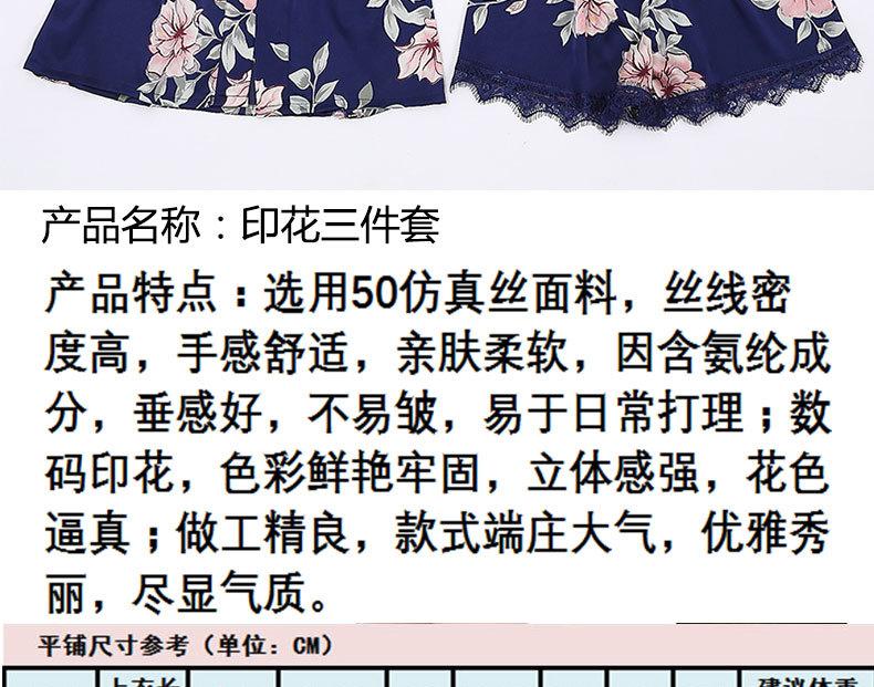 Pijama Nuevo Floral Tipo Seda para Mujer Sexy Encaje Cinturón Almohadilla Pecho Top Sling Pantalones Conjunto de Tres Piezas Venta al por Mayor