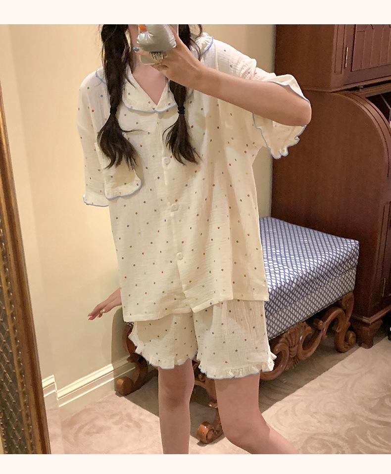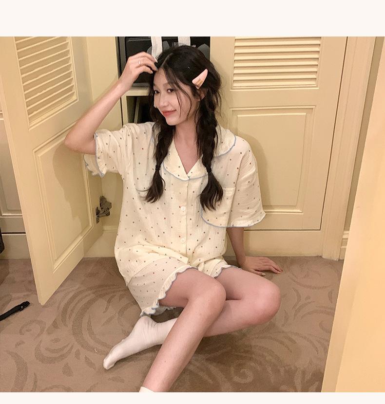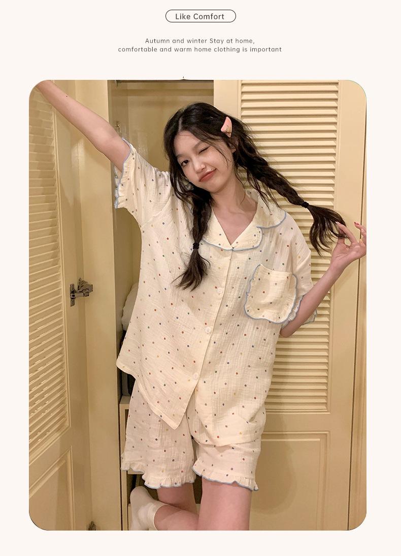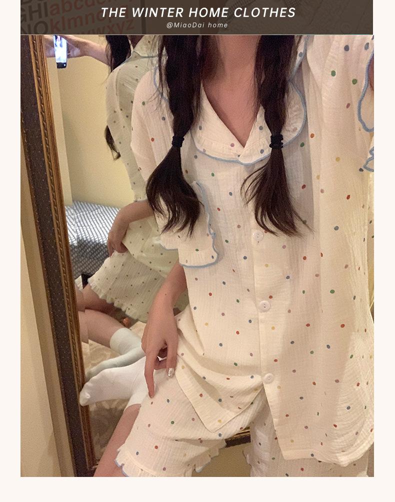 Pijama de lunares polares de estilo coreano para mujer, de verano, de manga corta, con pantalones cortos y cárdigan con volantes, conjunto de ropa para el hogar