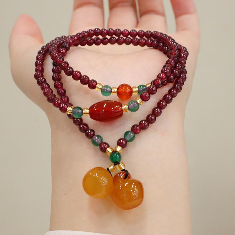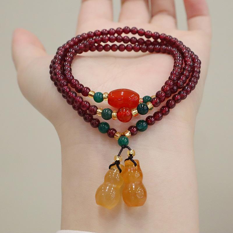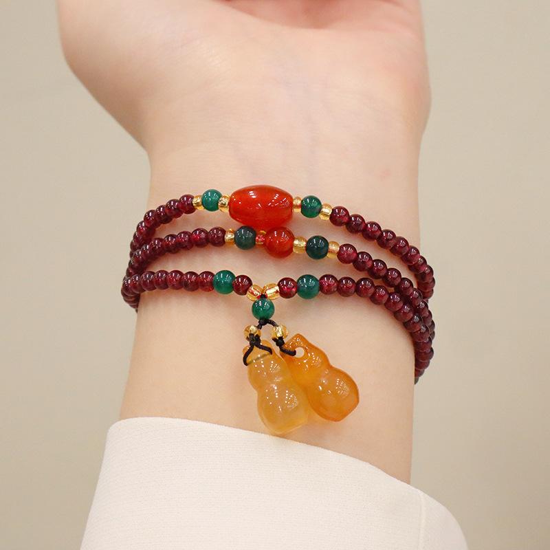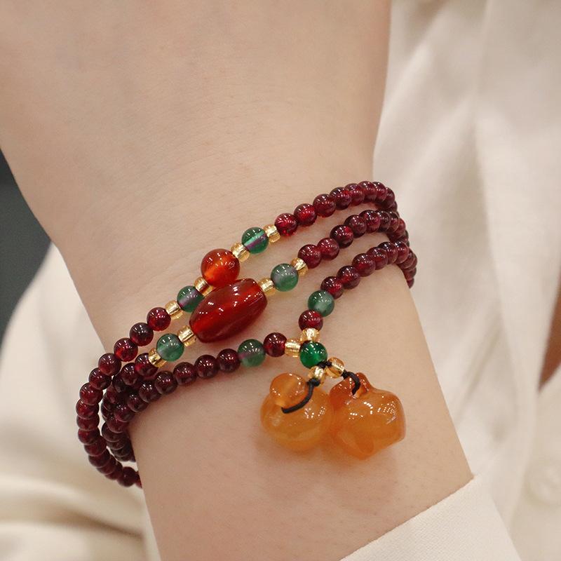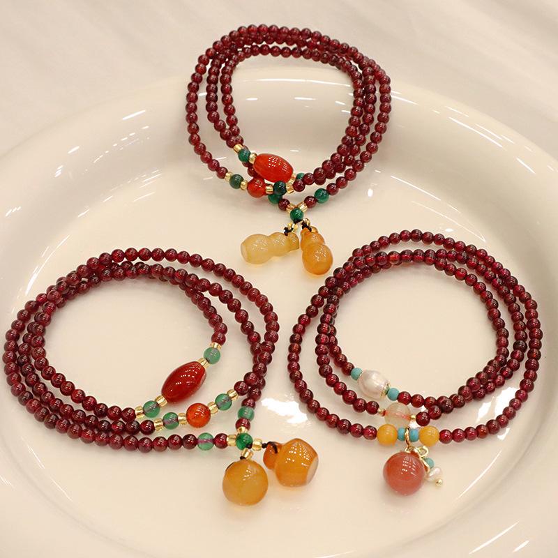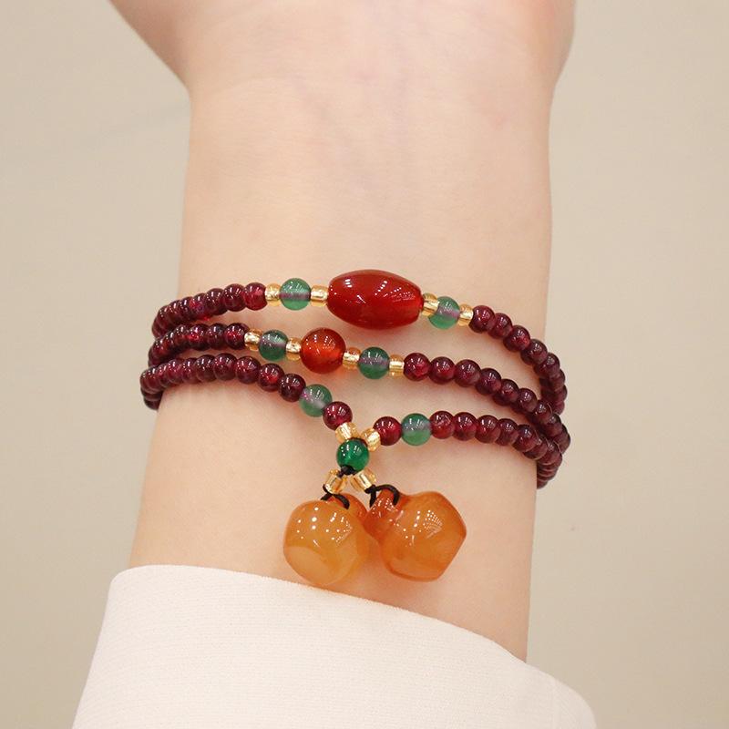 Pulsera de granate natural de tres anillos estilo chino nuevo para mujer, pulsera de calcedonia con colgante de calabaza manzana, joyería, en vivo, caliente