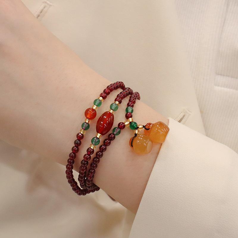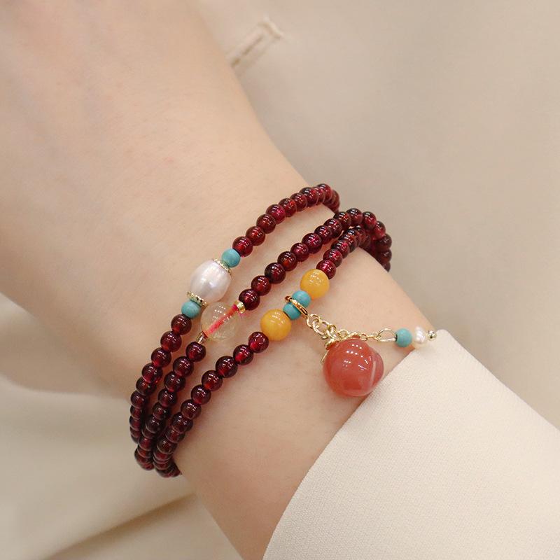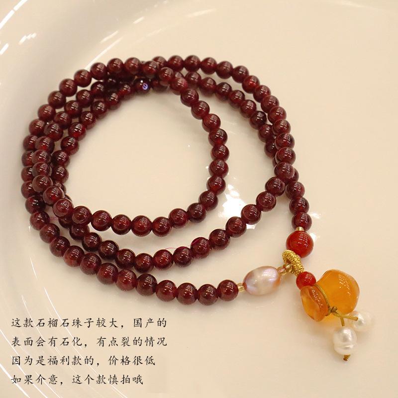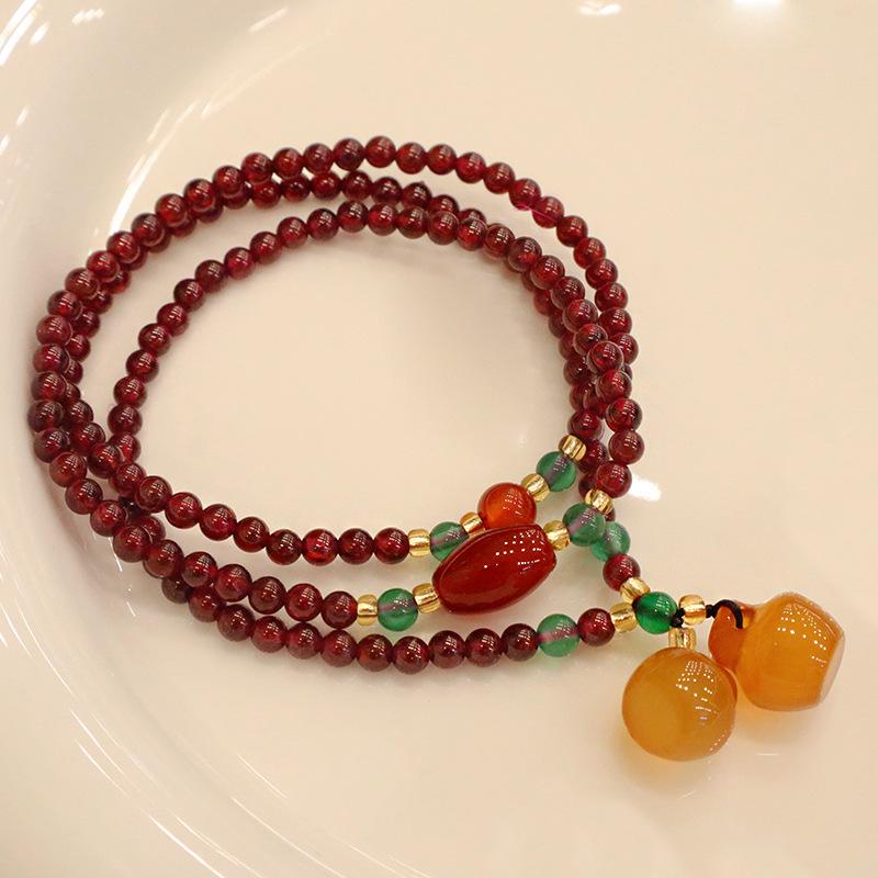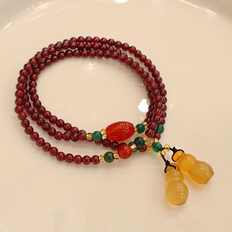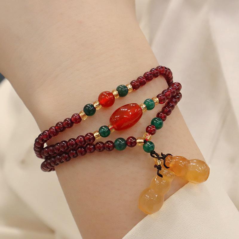 Pulsera de granate natural de tres anillos estilo chino nuevo para mujer, pulsera de calcedonia con colgante de calabaza manzana, joyería, en vivo, caliente