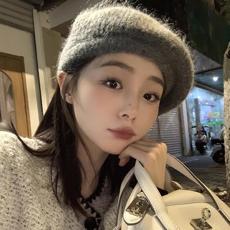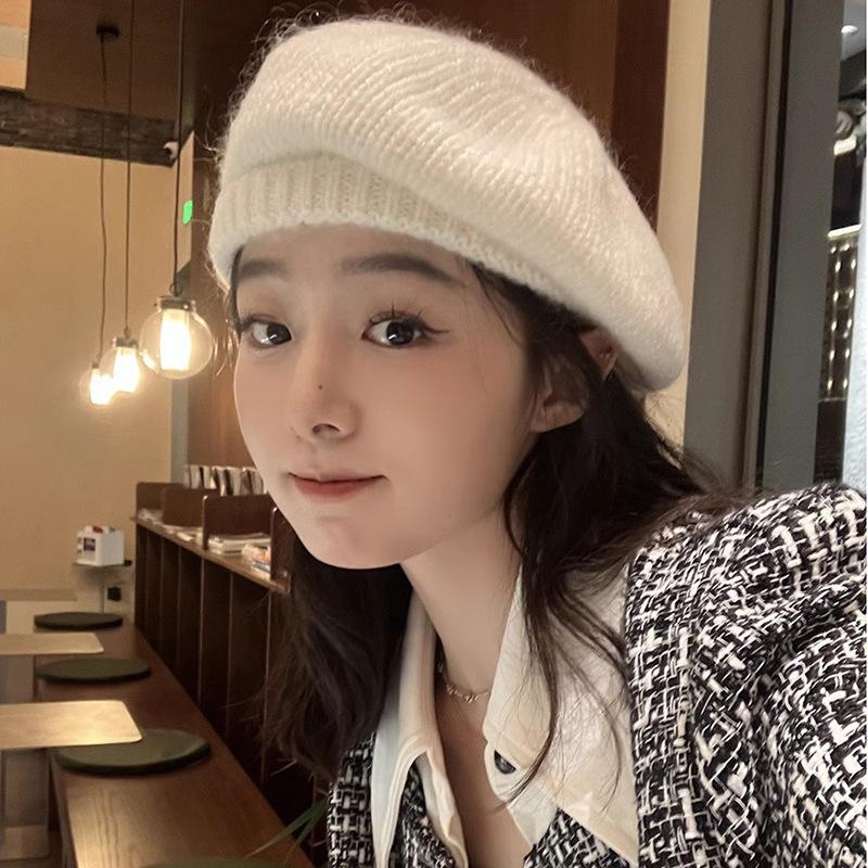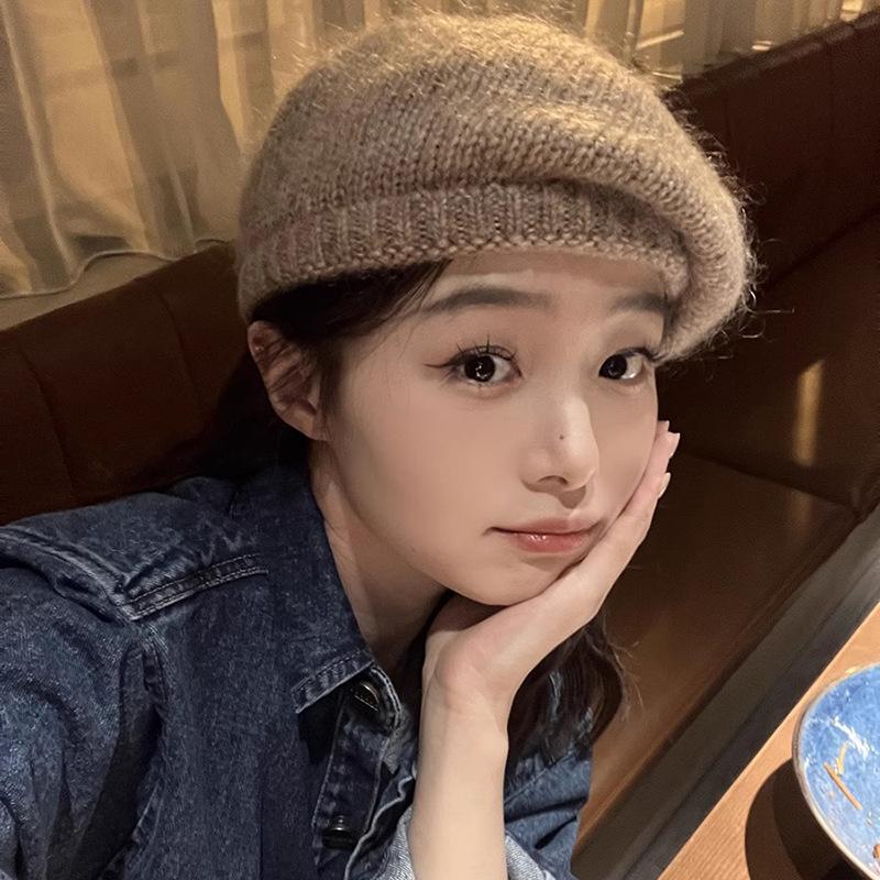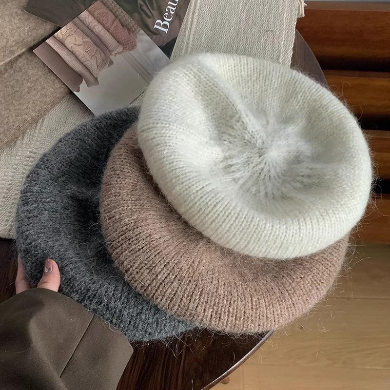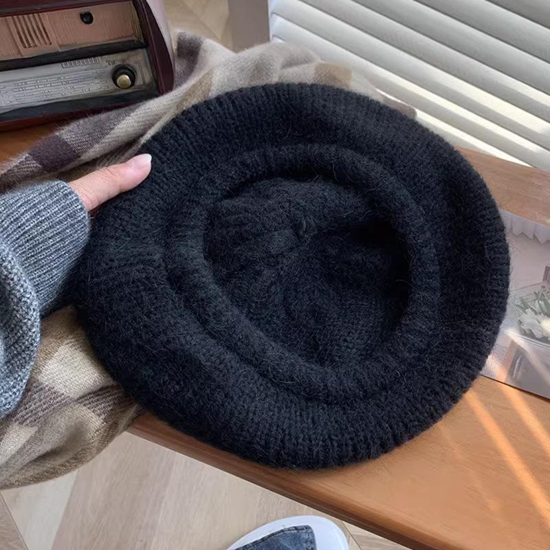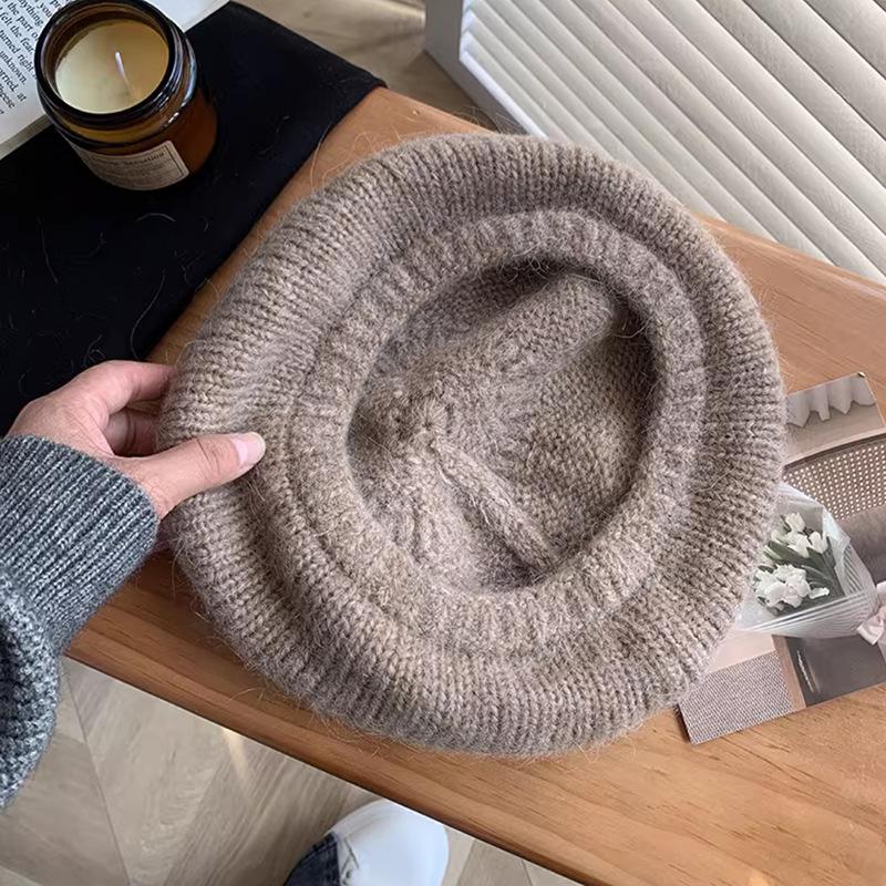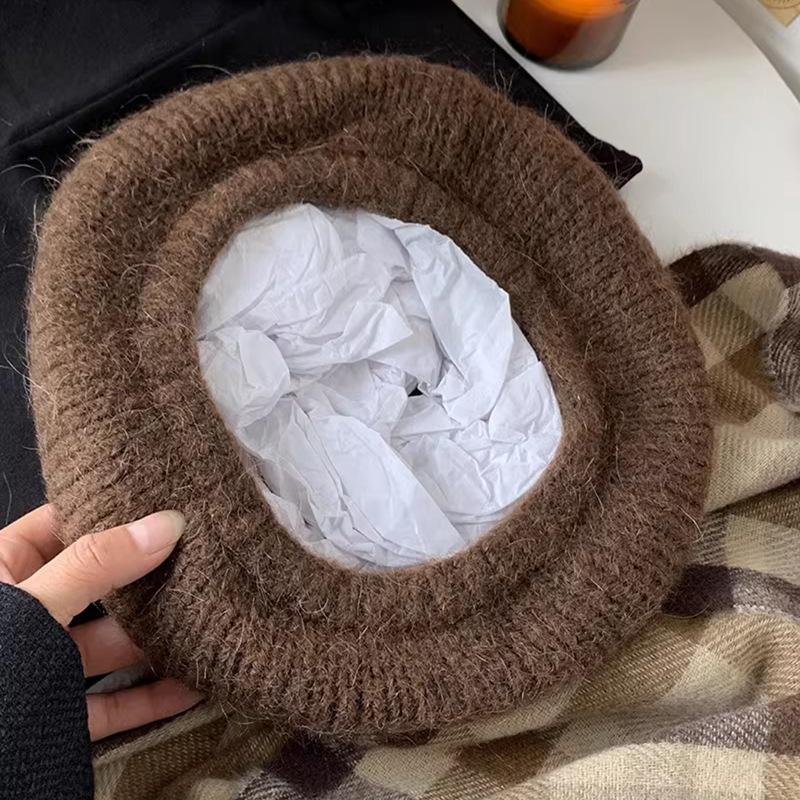 Gorro de punto de mohair suave, gorro de pintor de felpa para mujer, boina cálida y gruesa de invierno, gorro de lana con circunferencia de cabeza grande para mujer