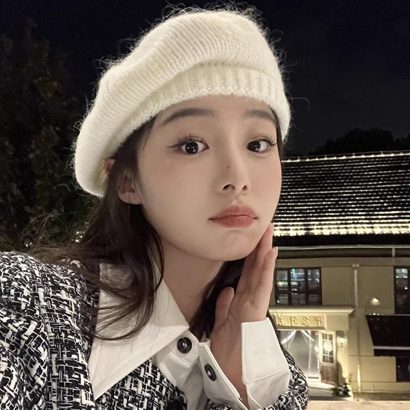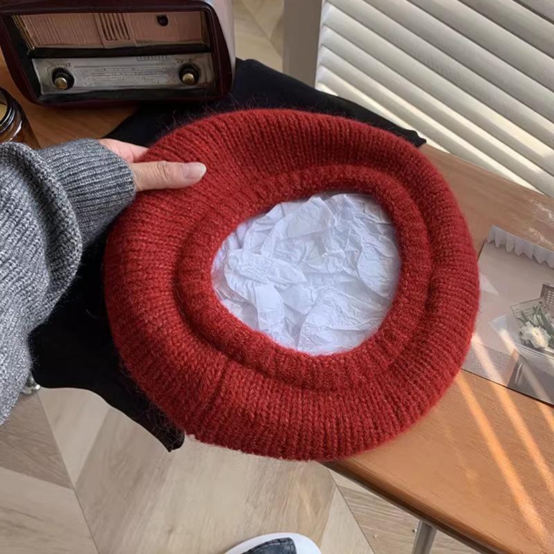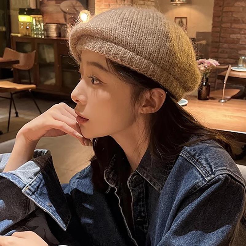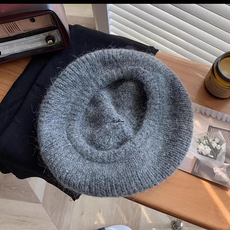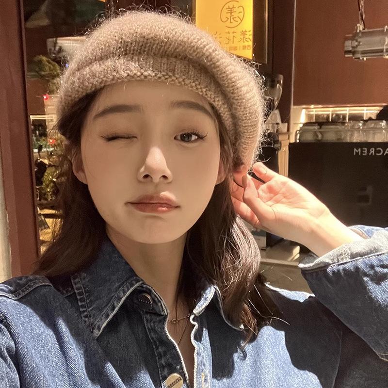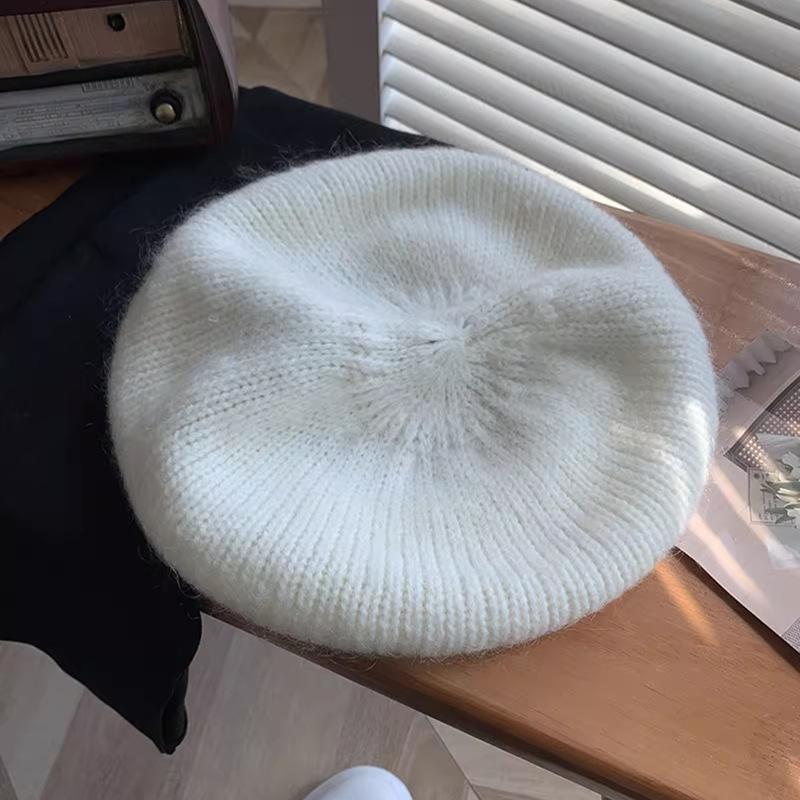 Gorro de punto de mohair suave, gorro de pintor de felpa para mujer, boina cálida y gruesa de invierno, gorro de lana con circunferencia de cabeza grande para mujer