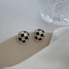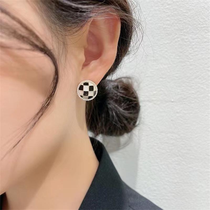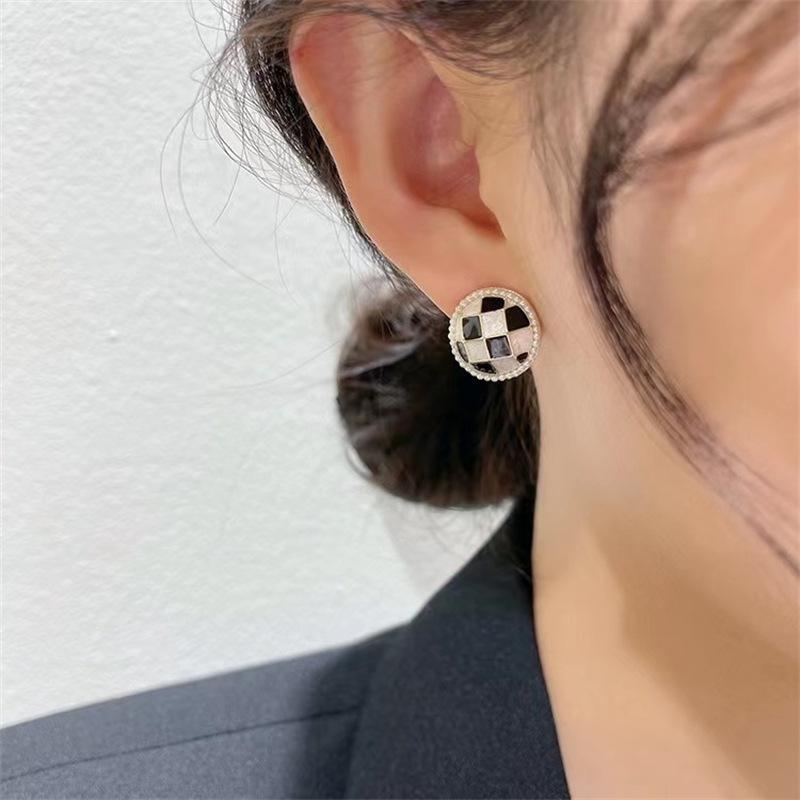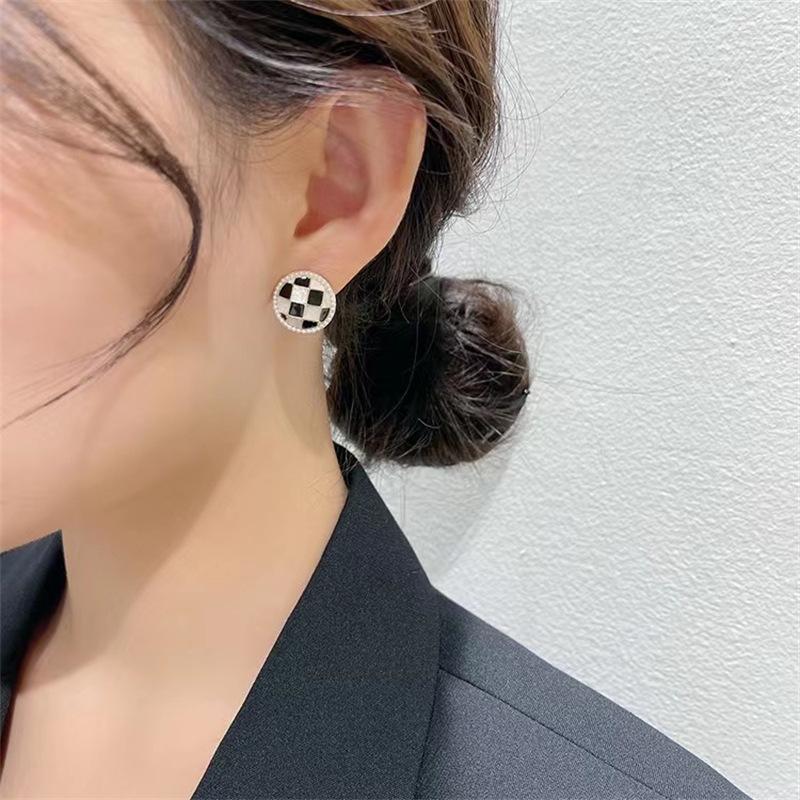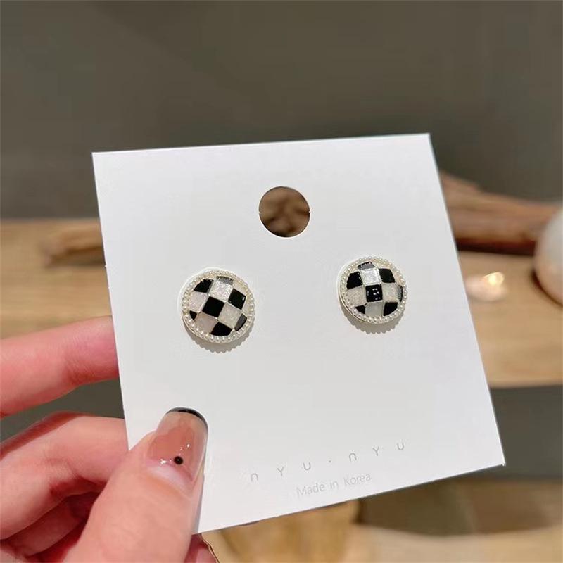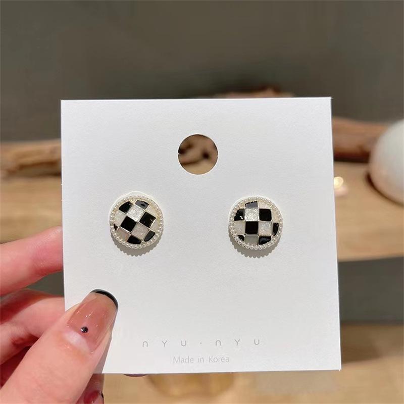 Pendientes de plata de ley S925 con diseño de tablero de ajedrez en blanco y negro de otoño e invierno de Dongdaemun, Corea del Sur.