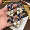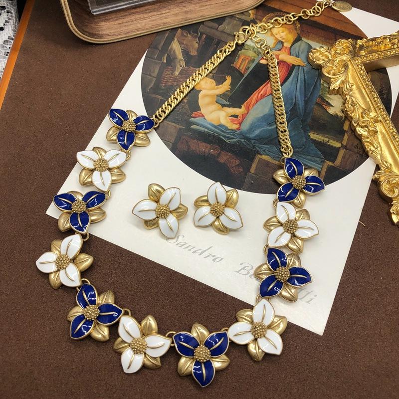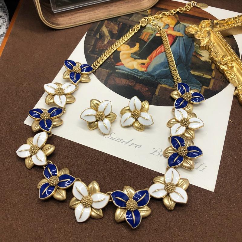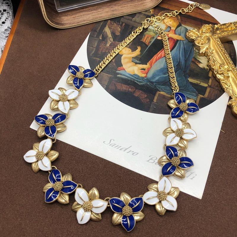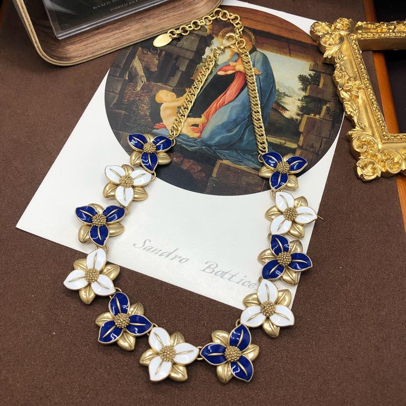 Collar estilo Chanel de la Antigüedad Occidental Media para mujer, elegante y antiguo, con esmalte de flores azules y blancas, cadena de clavícula para suéter.
