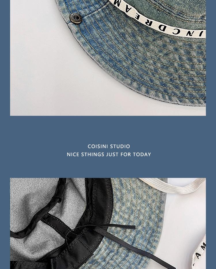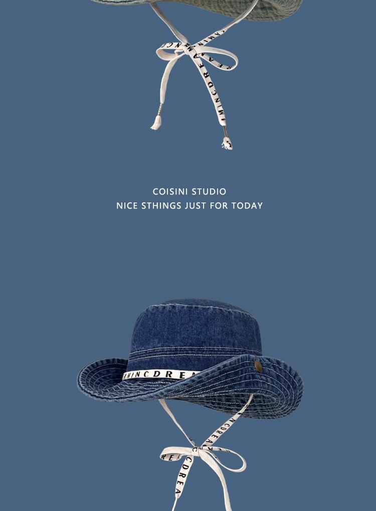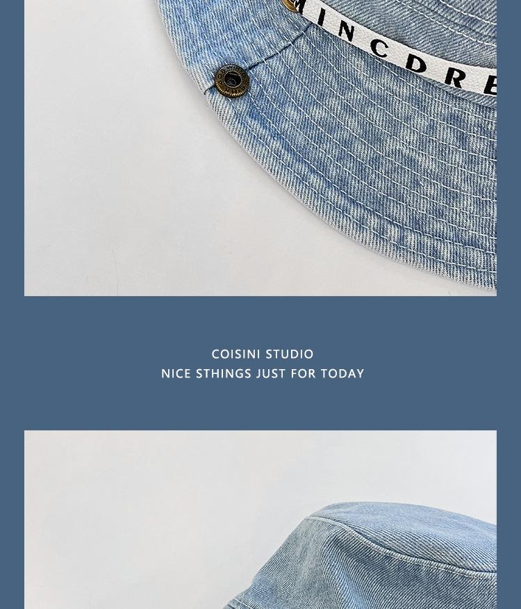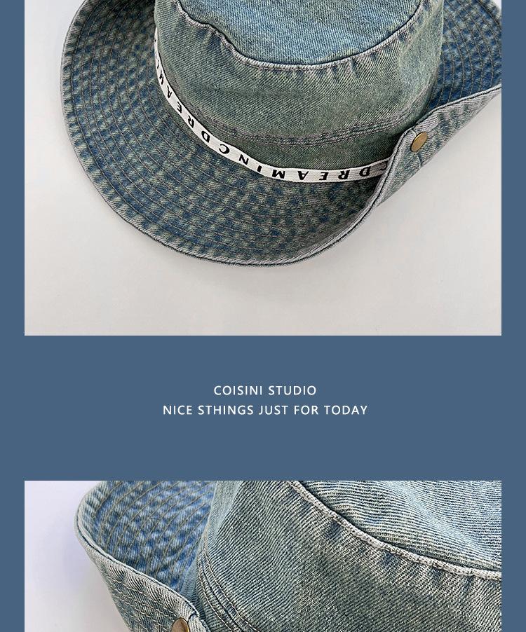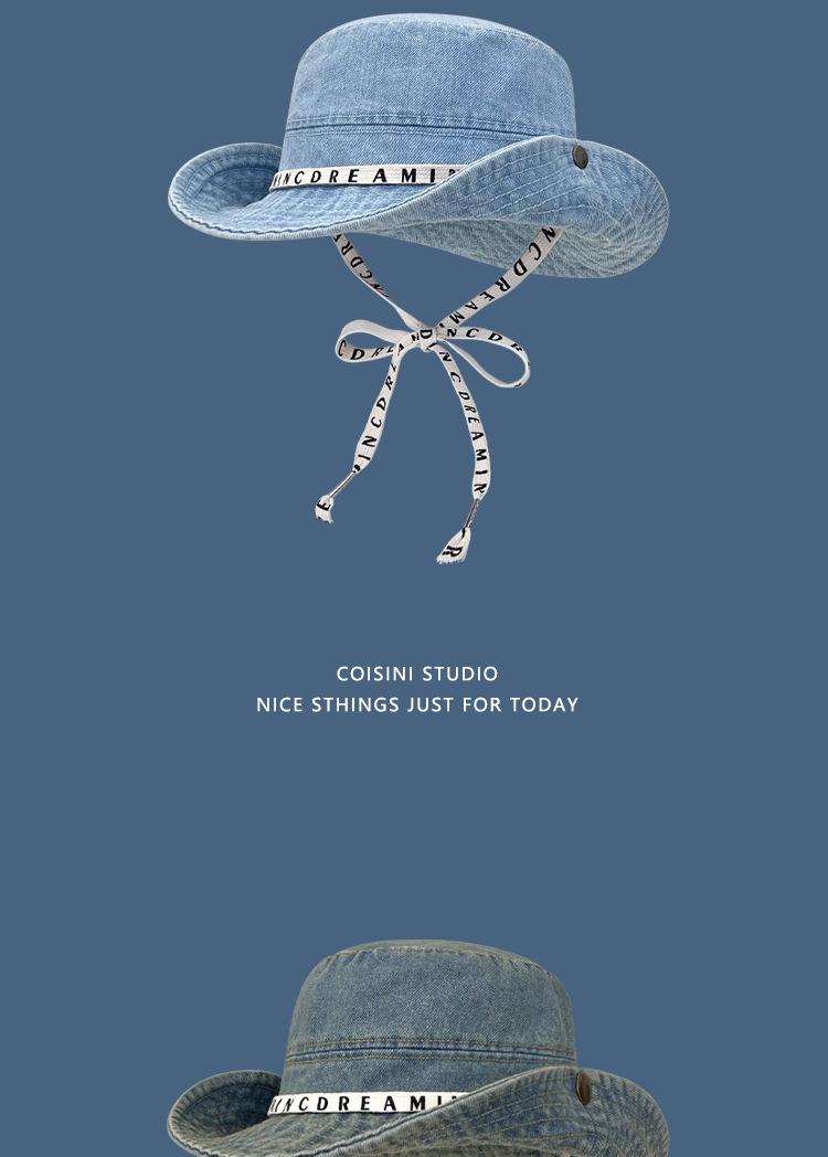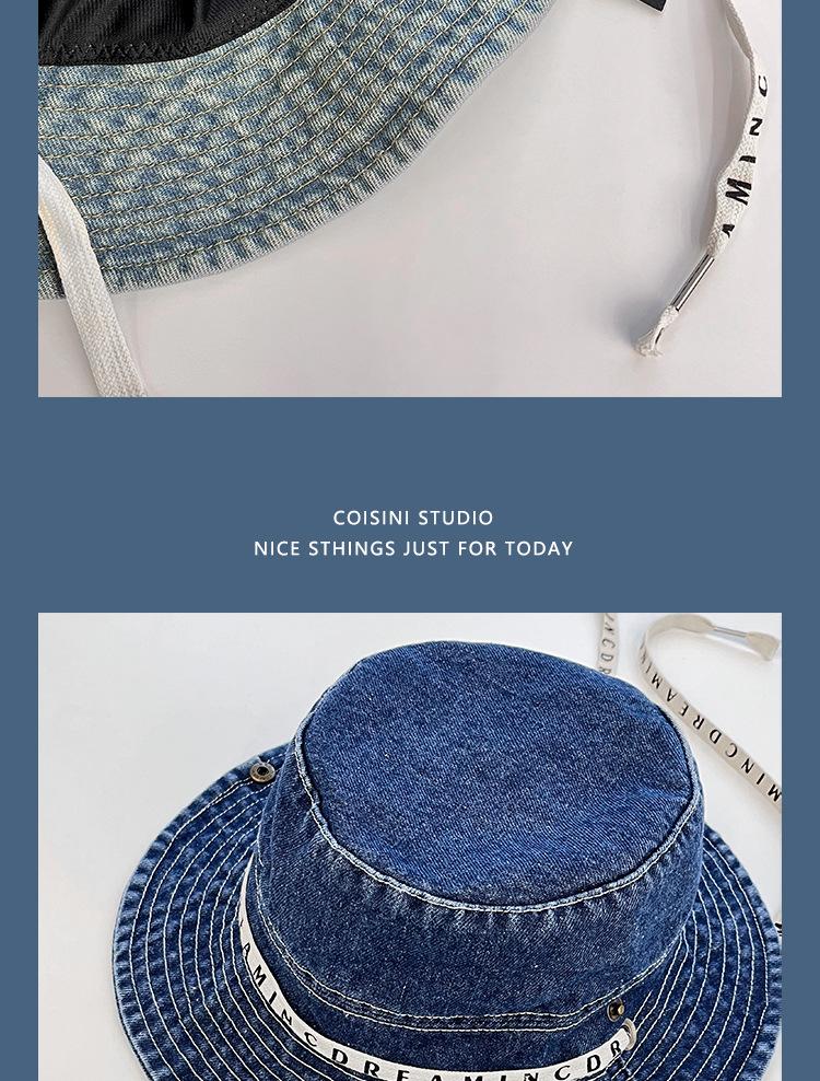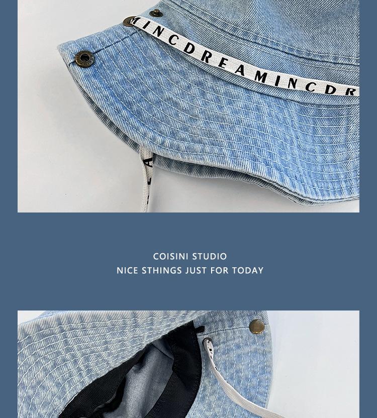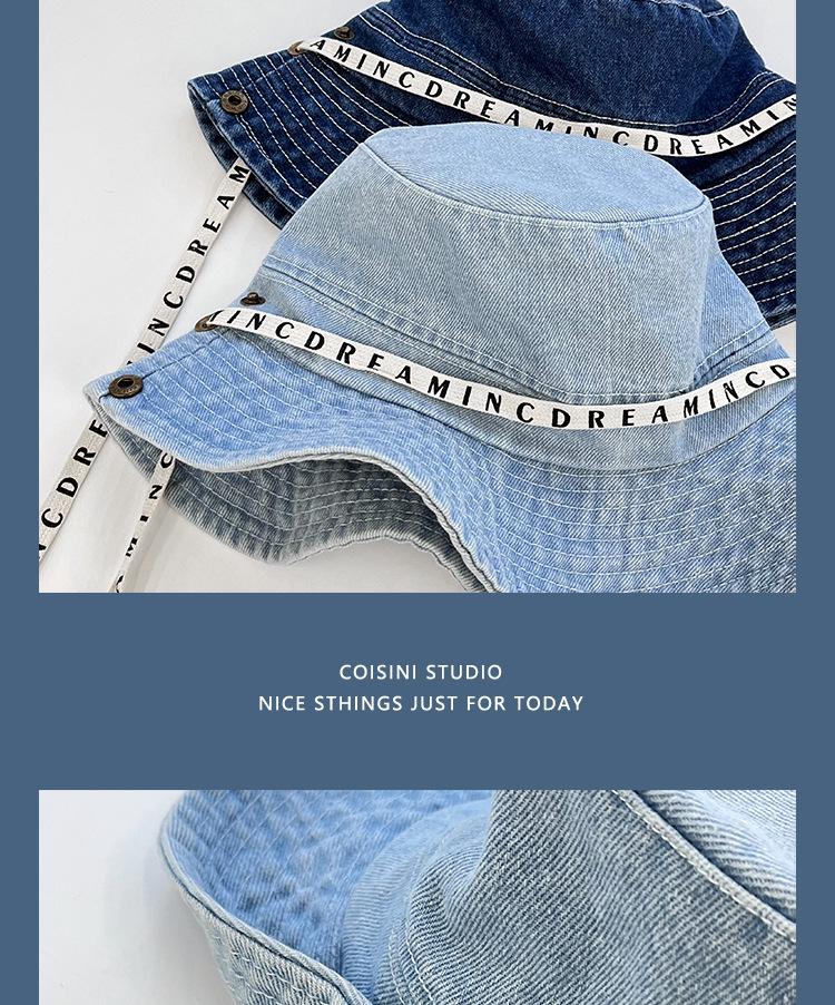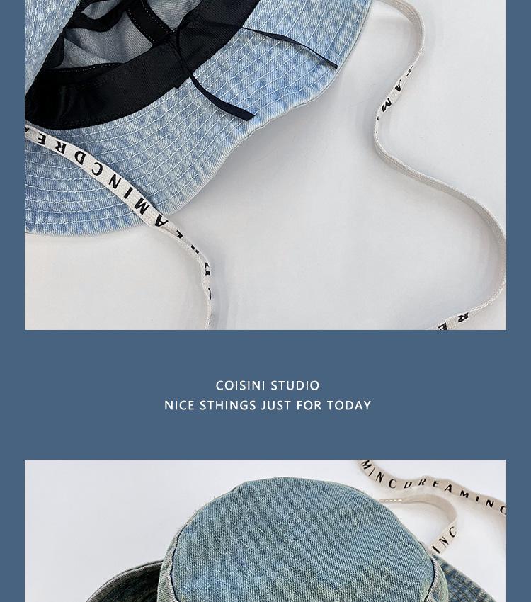 Sombrero de pescador de mezclilla con correa de letras de estilo coreano, sombrero de verano versátil para mujer con protección solar y protección UV, sombrero de lavabo de ala grande para hombre