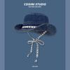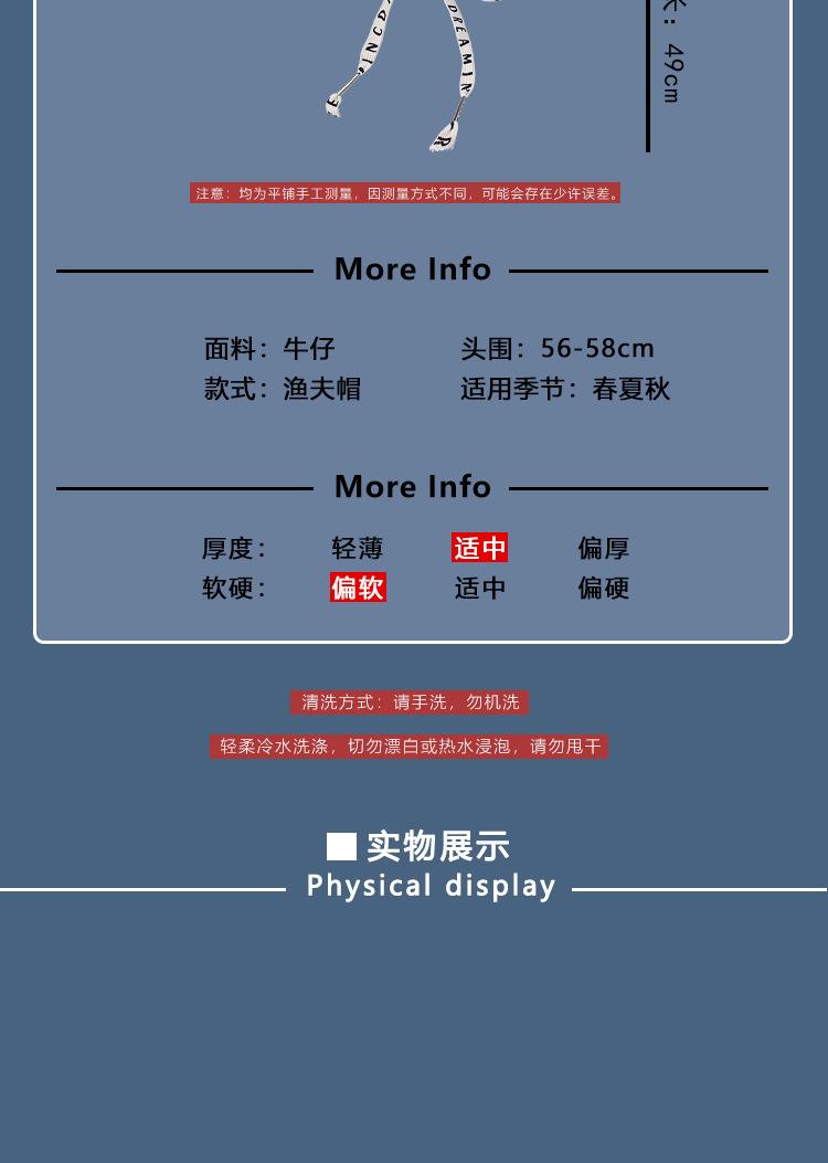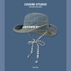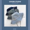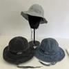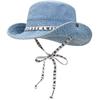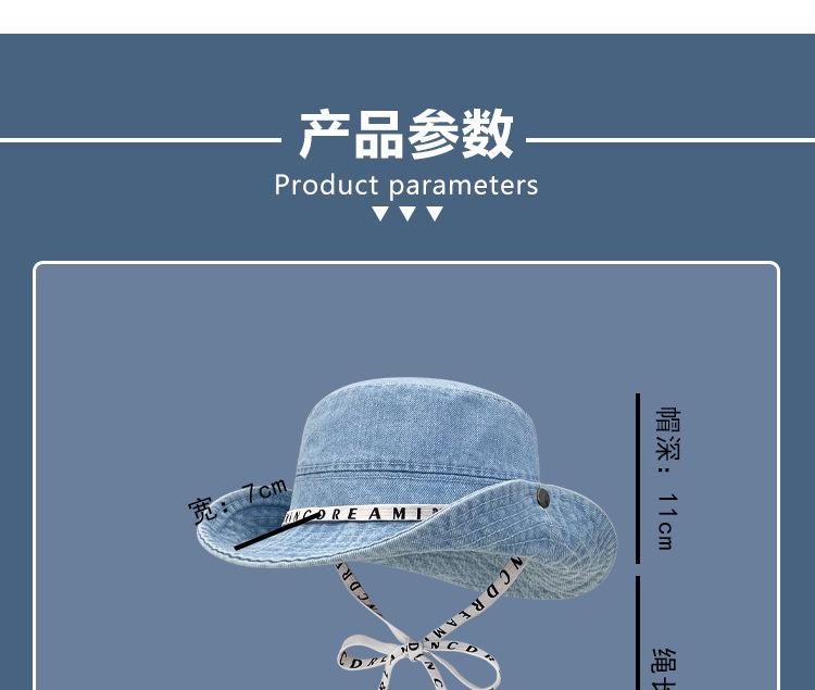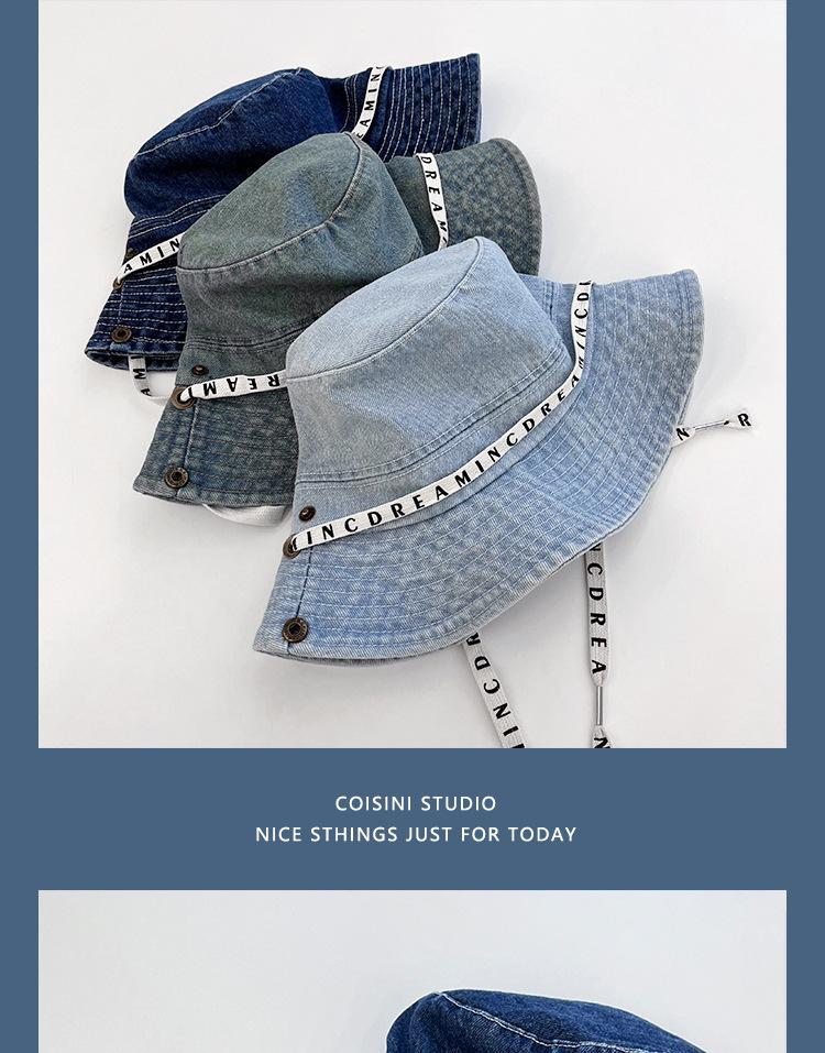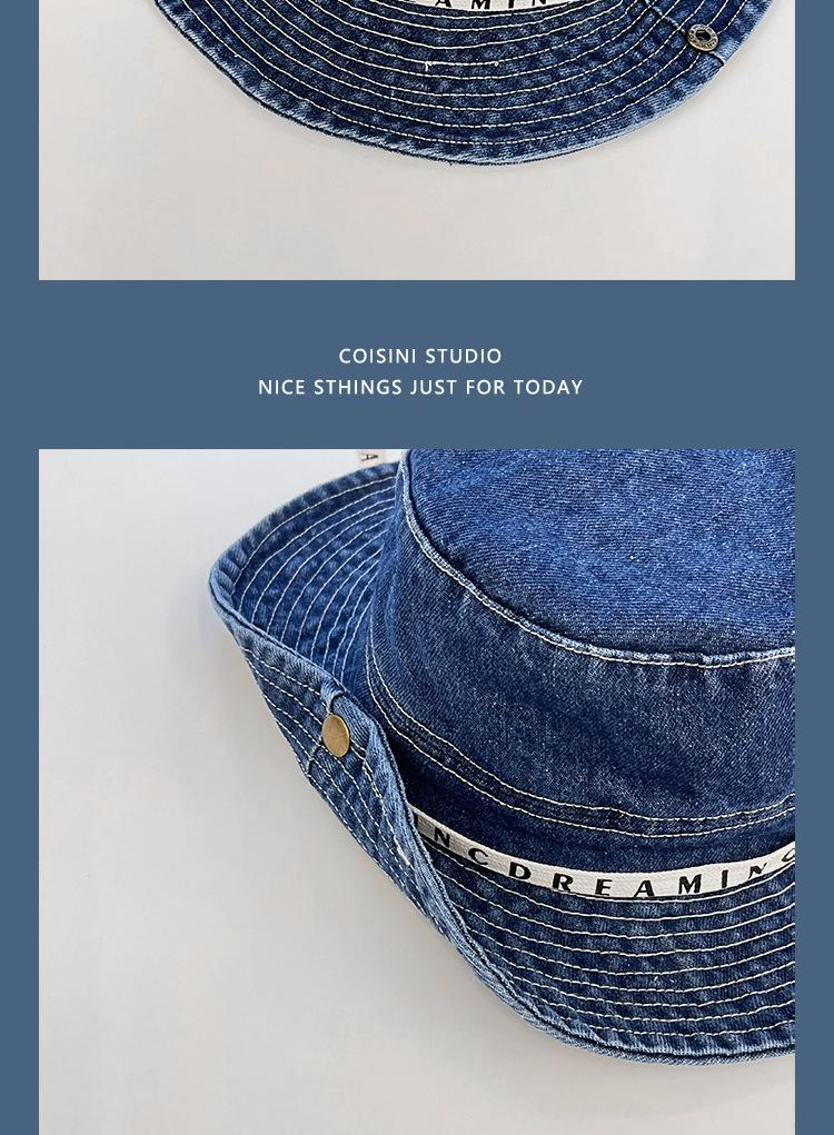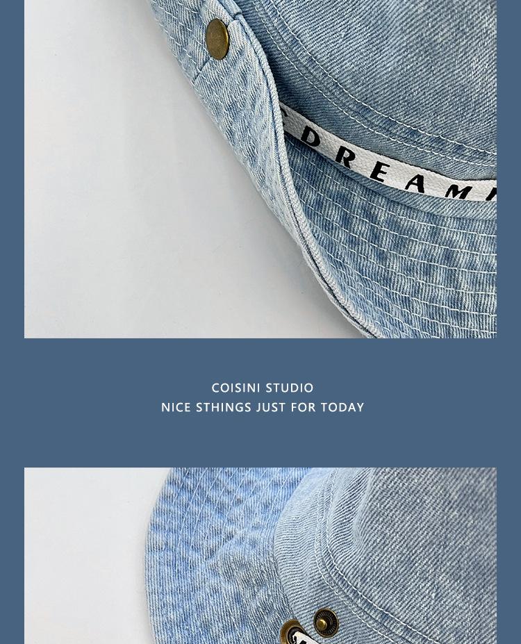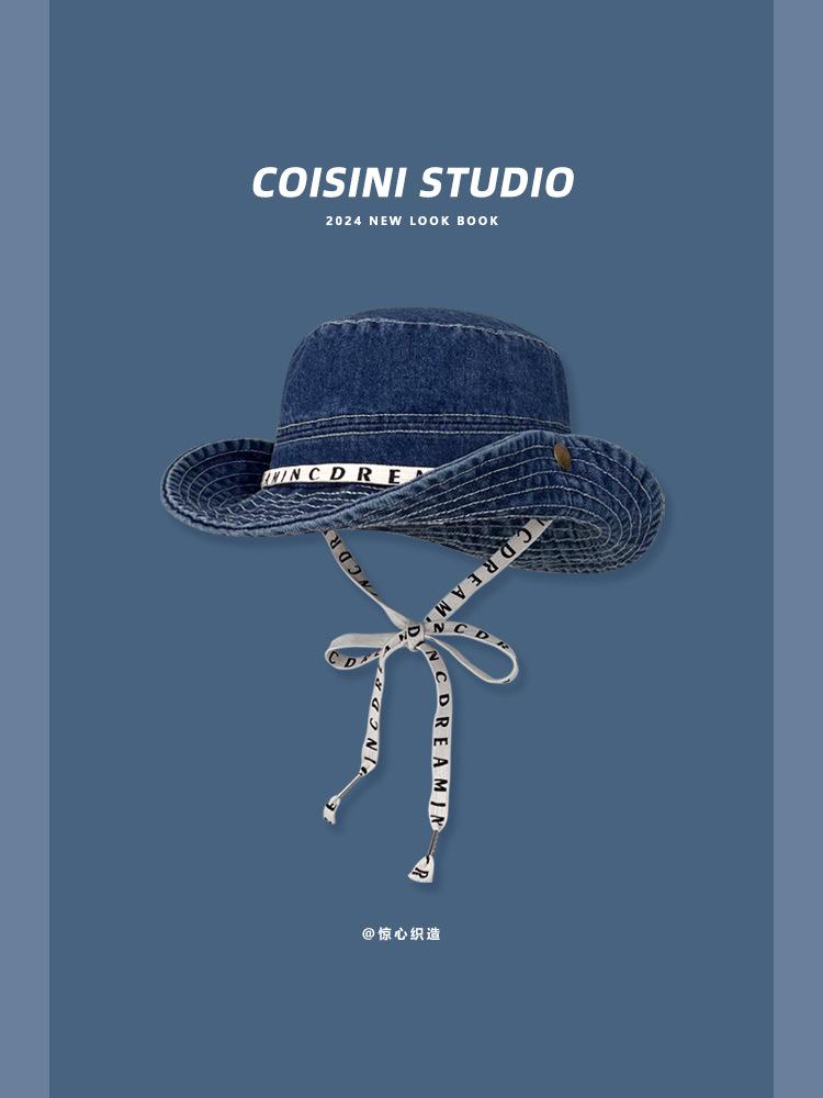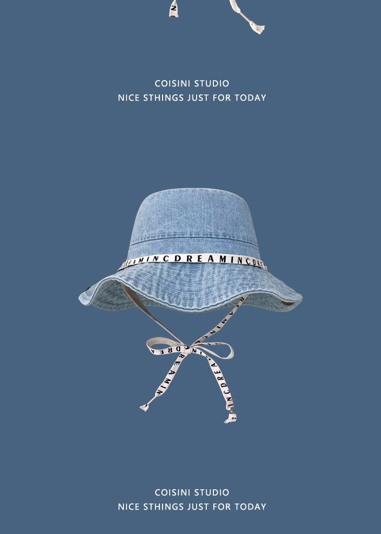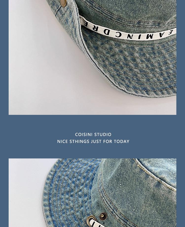 Sombrero de pescador de mezclilla con correa de letras de estilo coreano, sombrero de verano versátil para mujer con protección solar y protección UV, sombrero de lavabo de ala grande para hombre