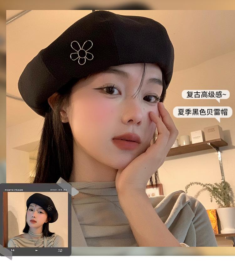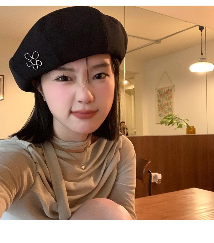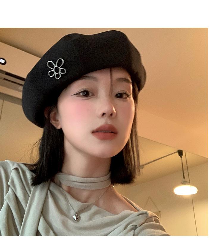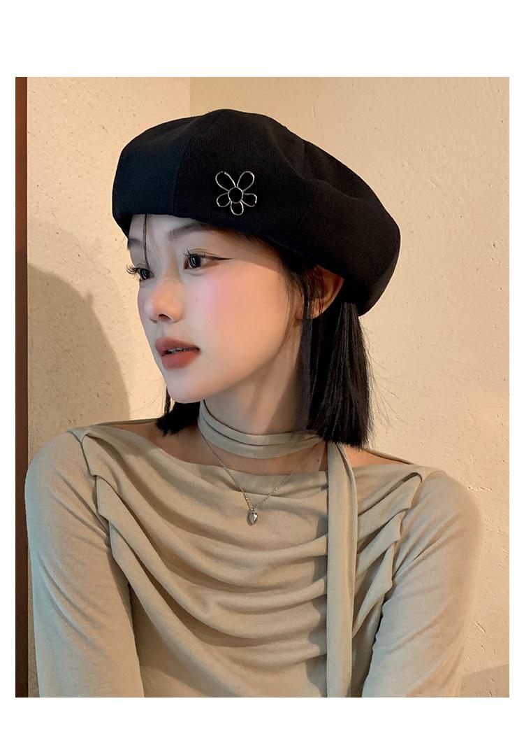Boina de punto de flor negra para mujer estilo coreano versátil que afina el rostro, sombrero de pintor Beilei de cabeza pequeña, sombrero de circunferencia de cabeza grande, moda