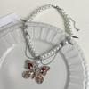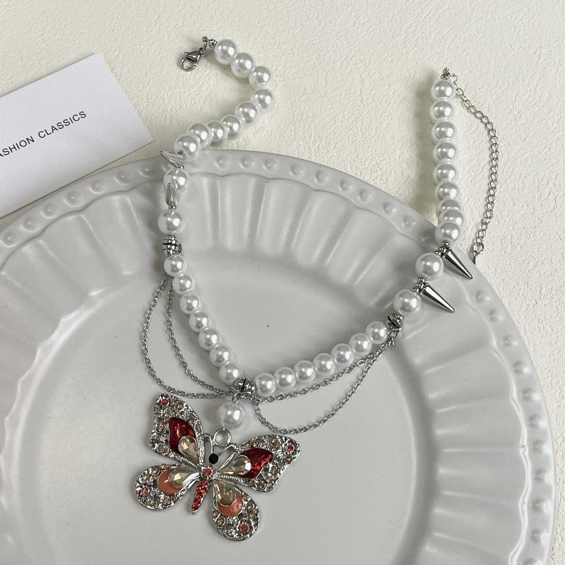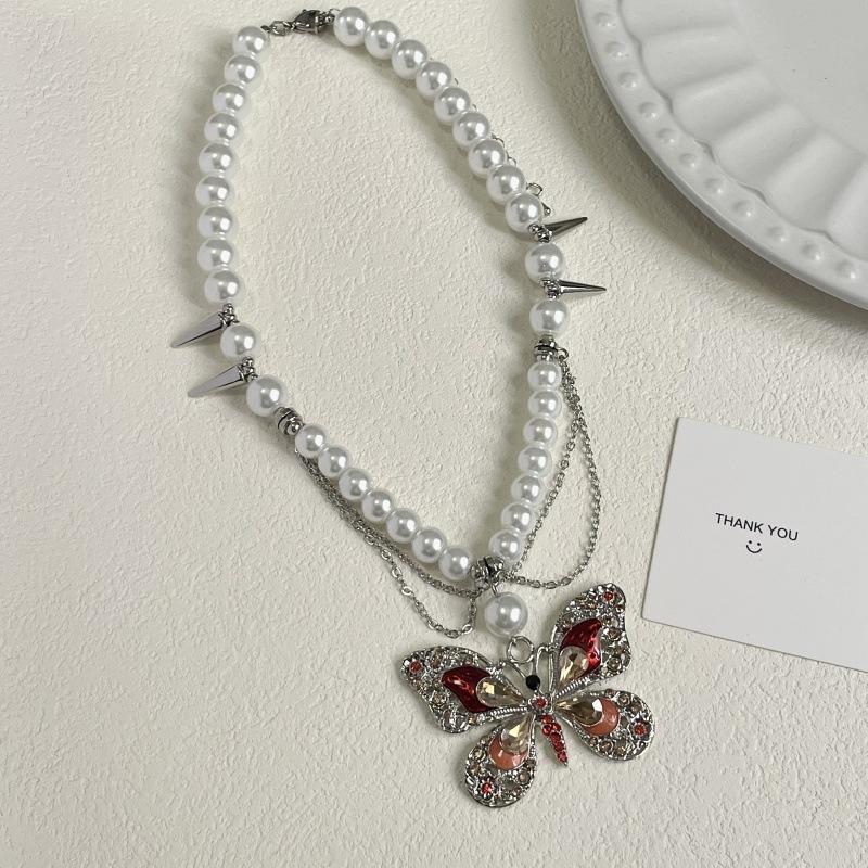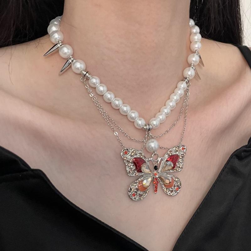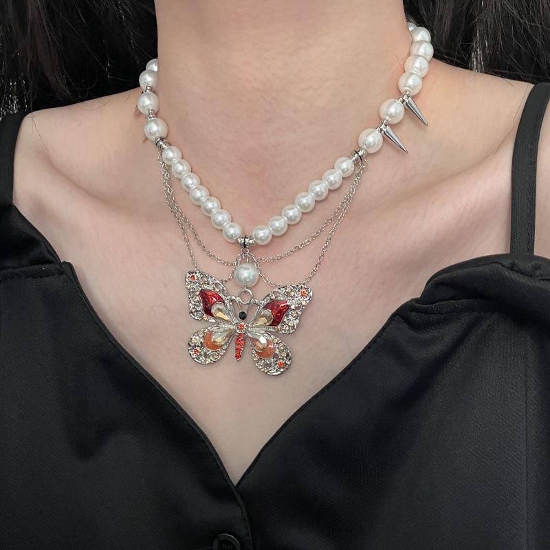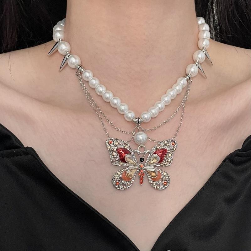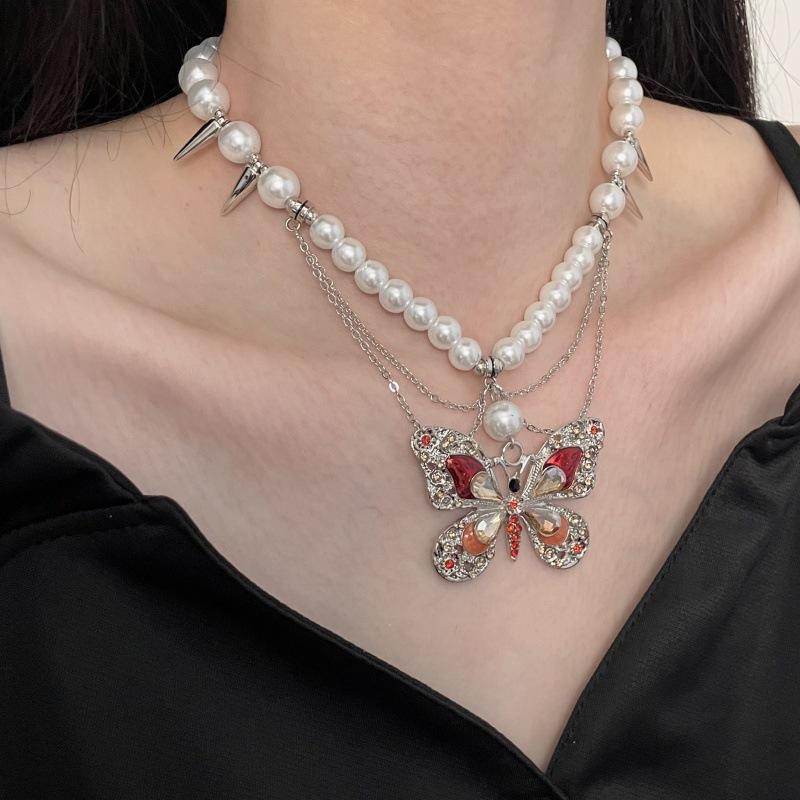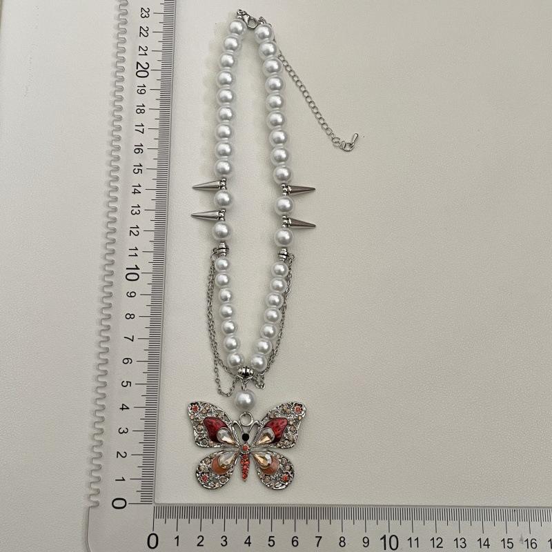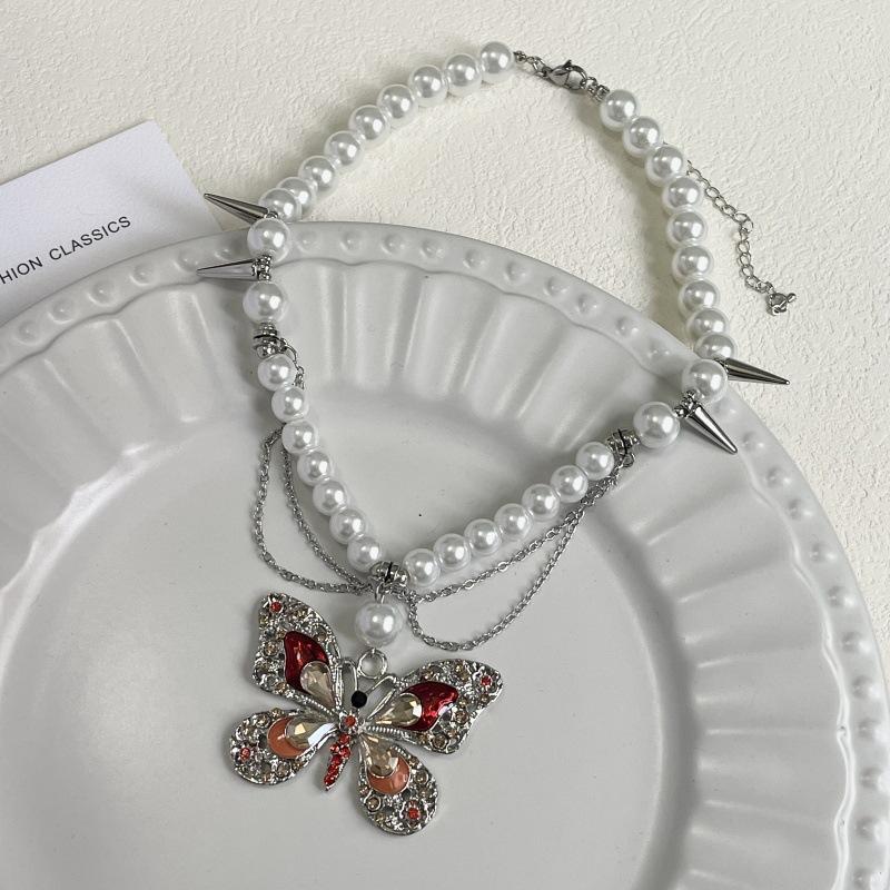 Nuevo collar de moda con perlas frescas, estilo industrial pesado, con borlas de mariposa y remaches, ligero, lujoso, de diseño único y nicho, con cadena para clavícula.