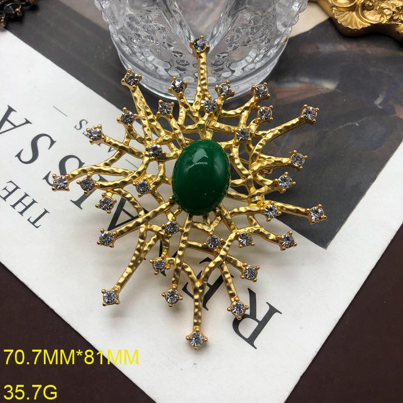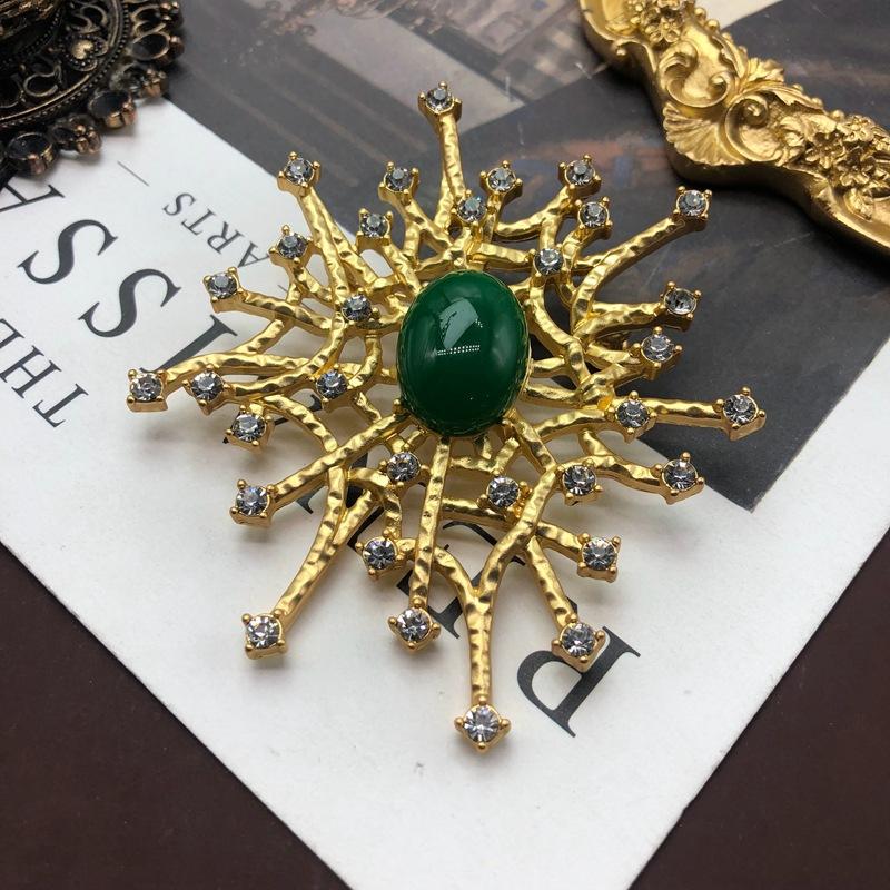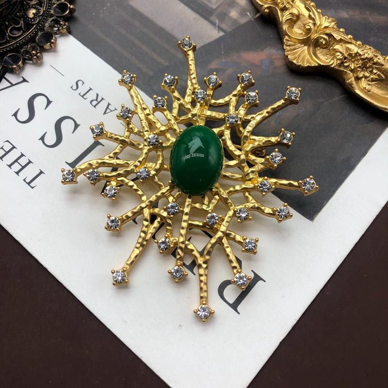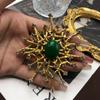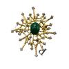 Broche de esmeralda vintage con incrustaciones de gemas y diamantes, diseño de patrón hueco, broche vintage chapado en oro.