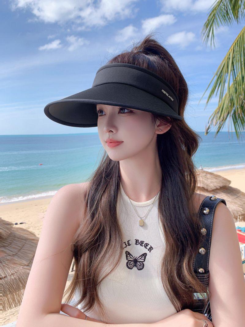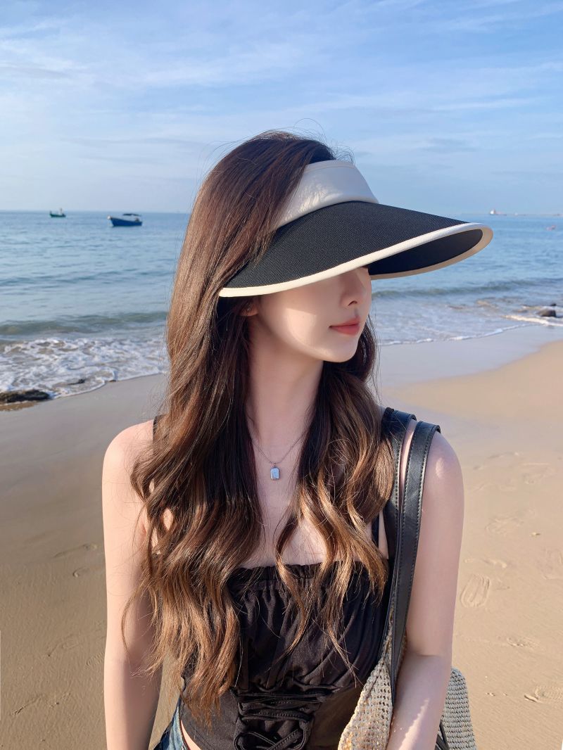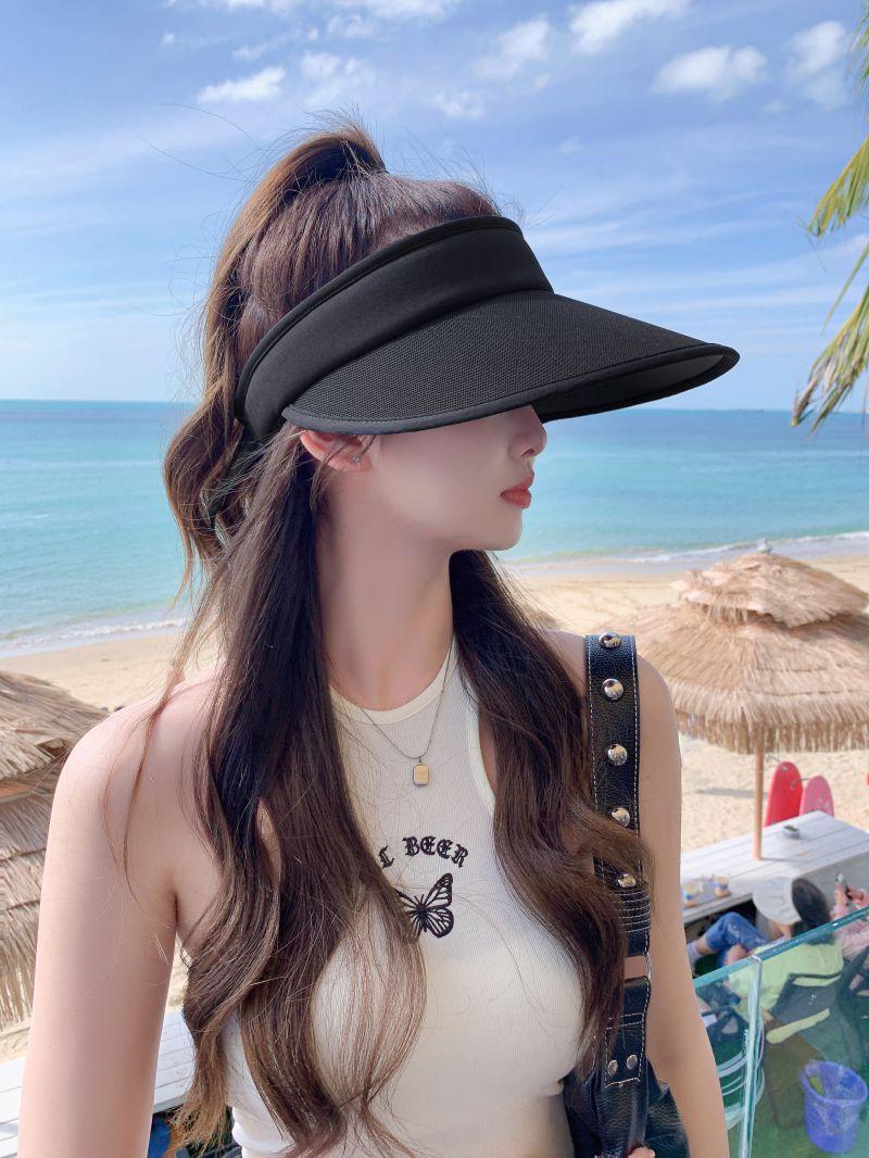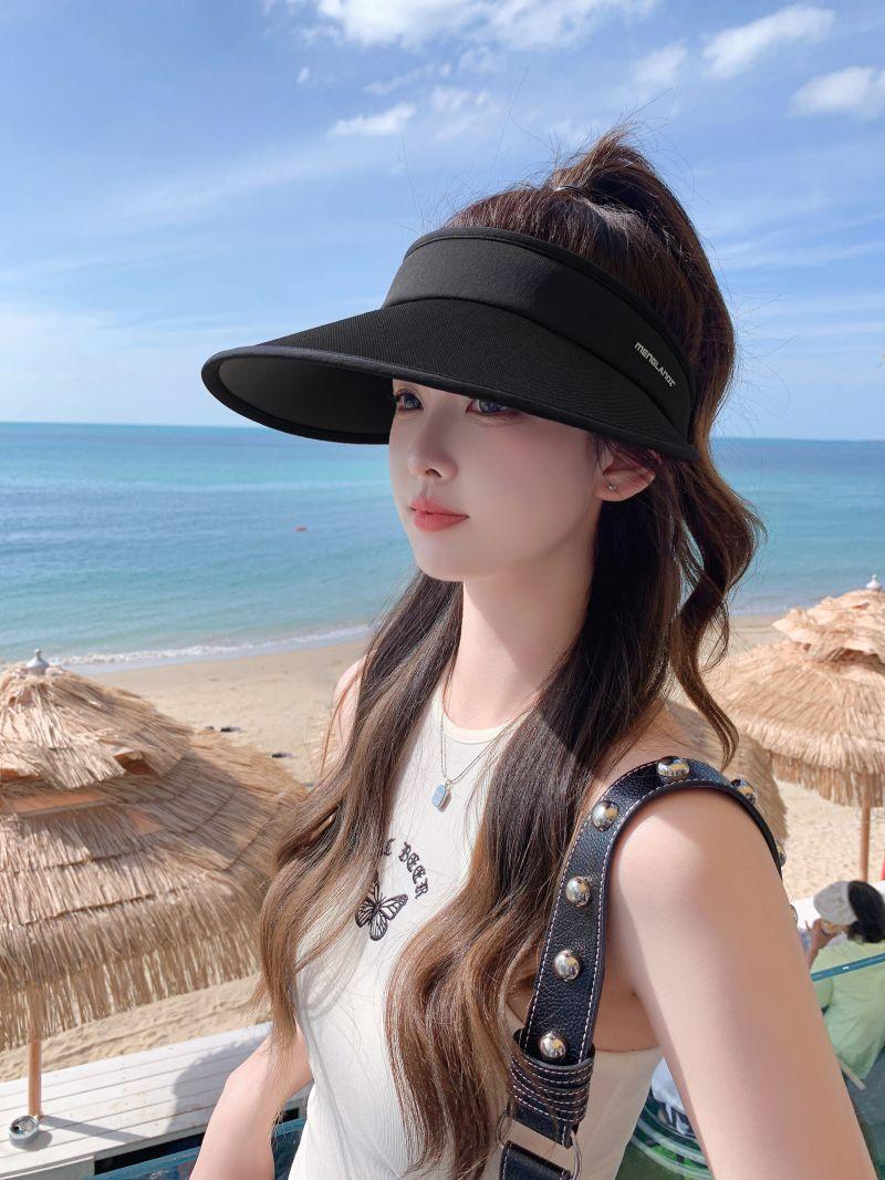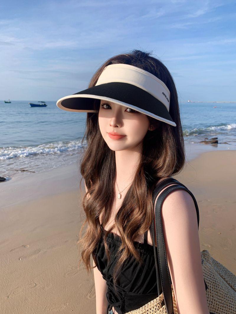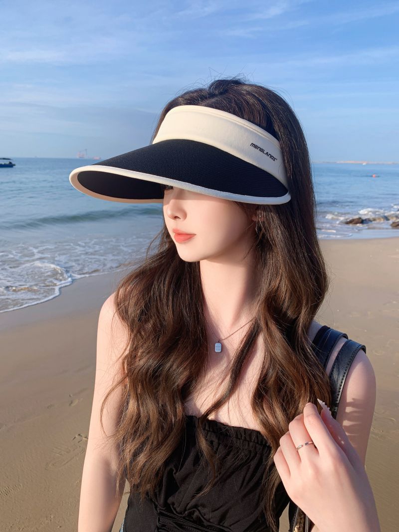 Sombrero de Sol para Mujer 2024 Nuevo Verano Anti-UV Ala Ancha Top Vacío Sombrero de Sol Contraste Seda de Hielo Sombrero Protector Solar