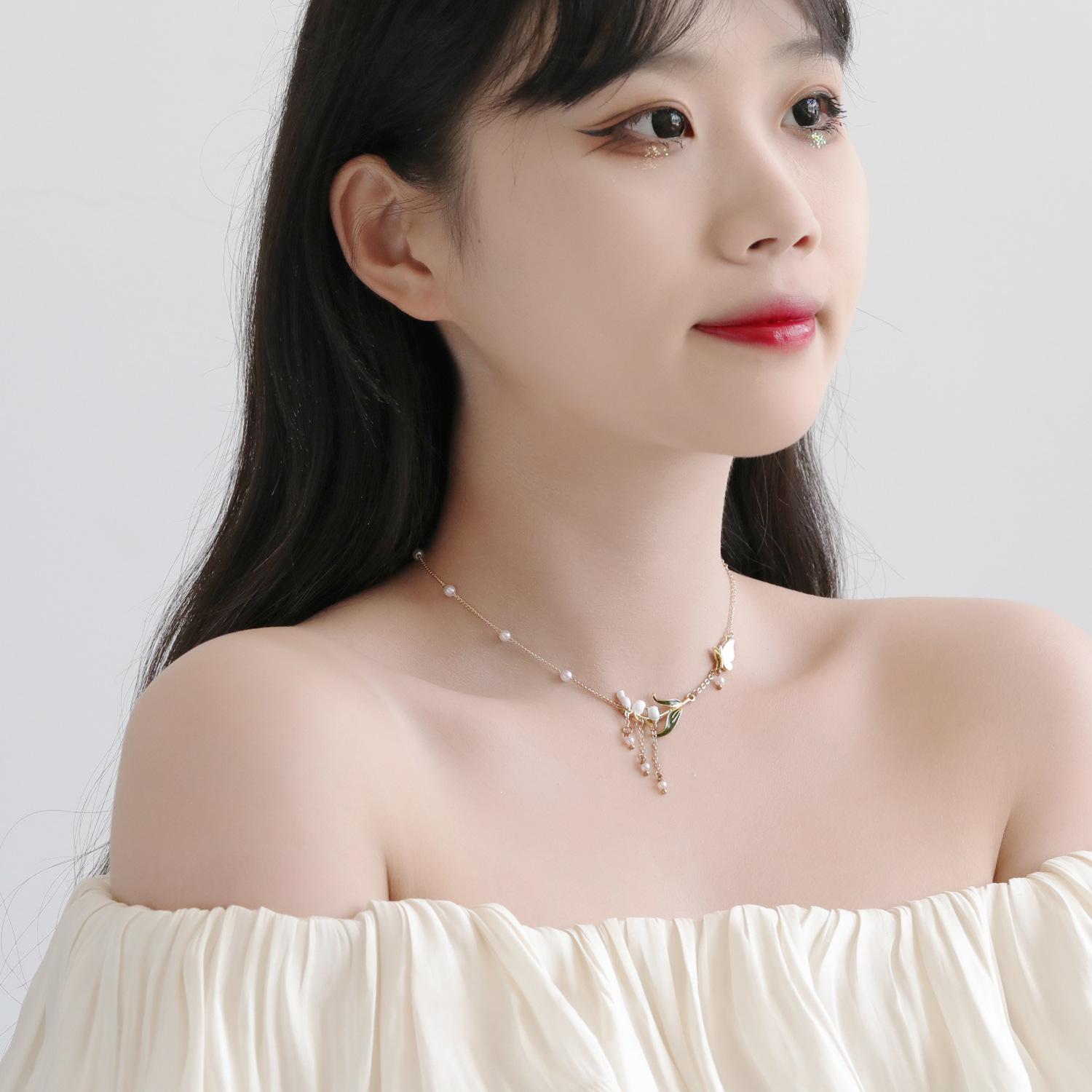 Collar de cadena de suéter de lujo con diseño de nicho de flor de metal y perla ligera para mujer, accesorios de joyería de otoño e invierno, collar para mujer