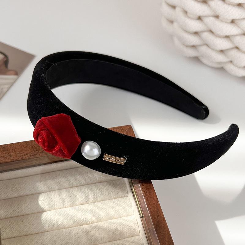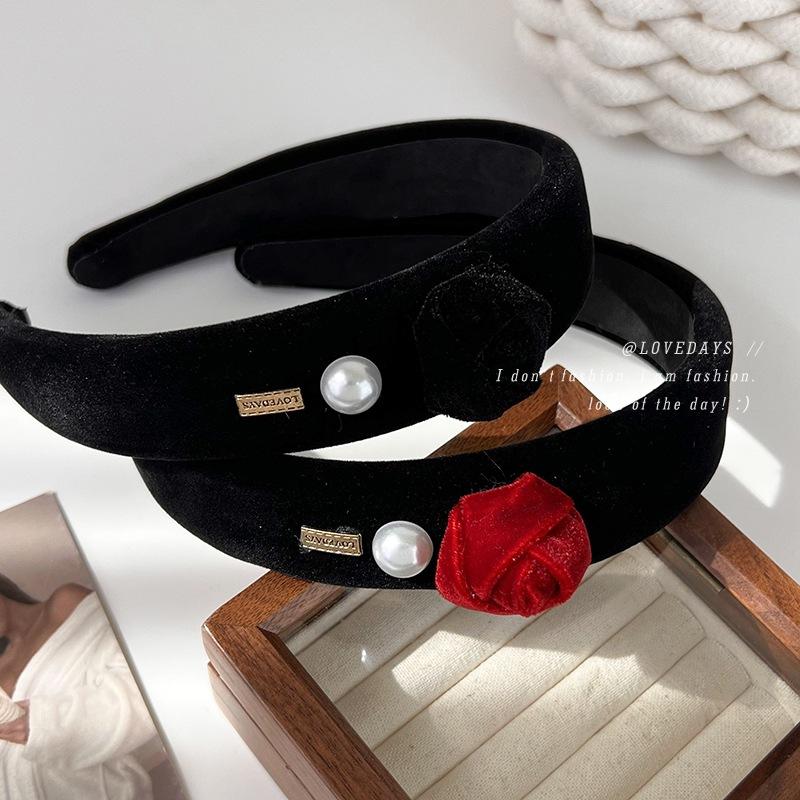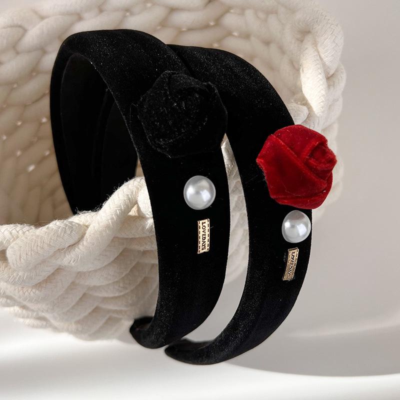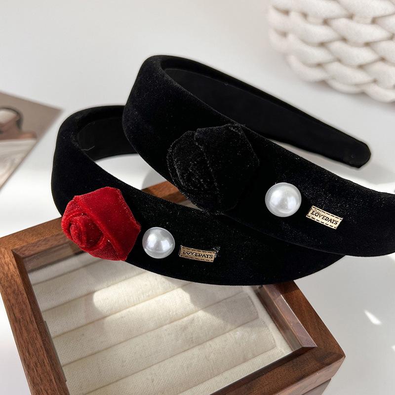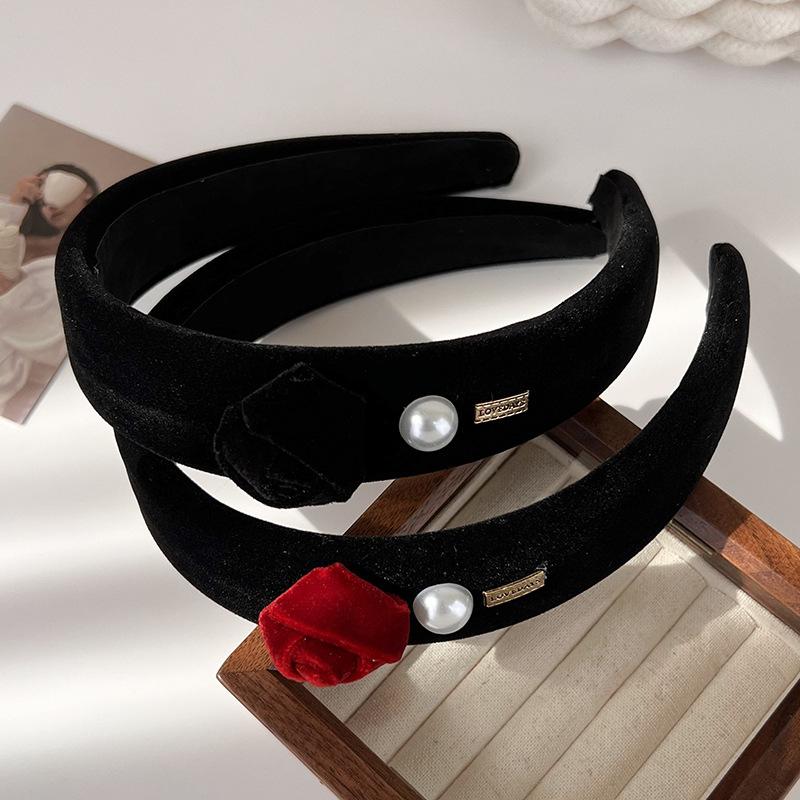 Diadema de terciopelo negro con perlas rosas para otoño e invierno, tocado dulce que combina con todo, banda para el cabello de alta presión con calavera, accesorios para el cabello al por mayor